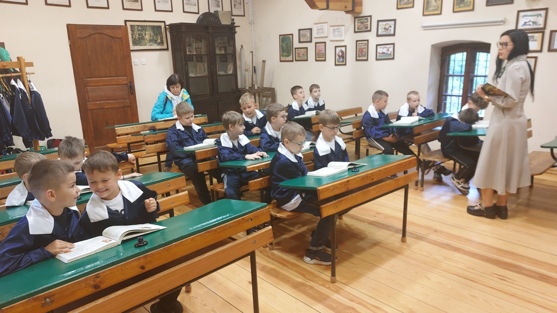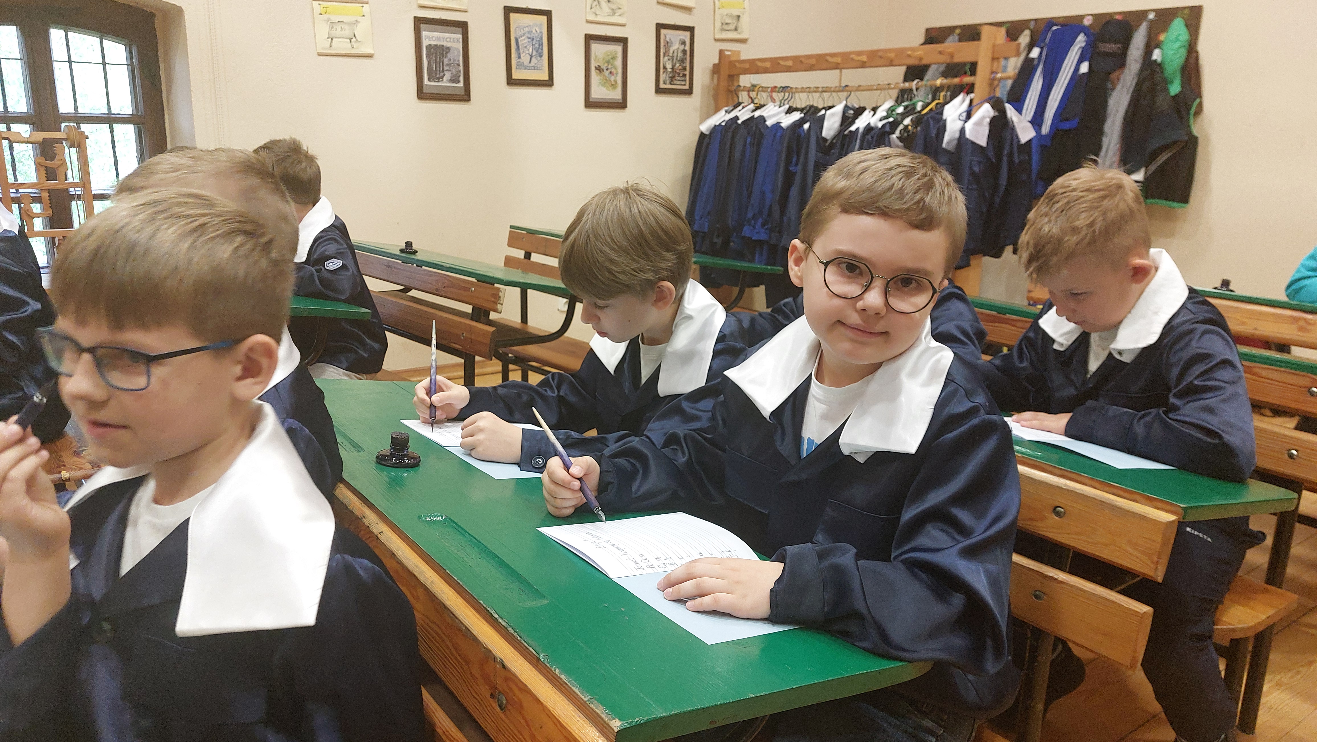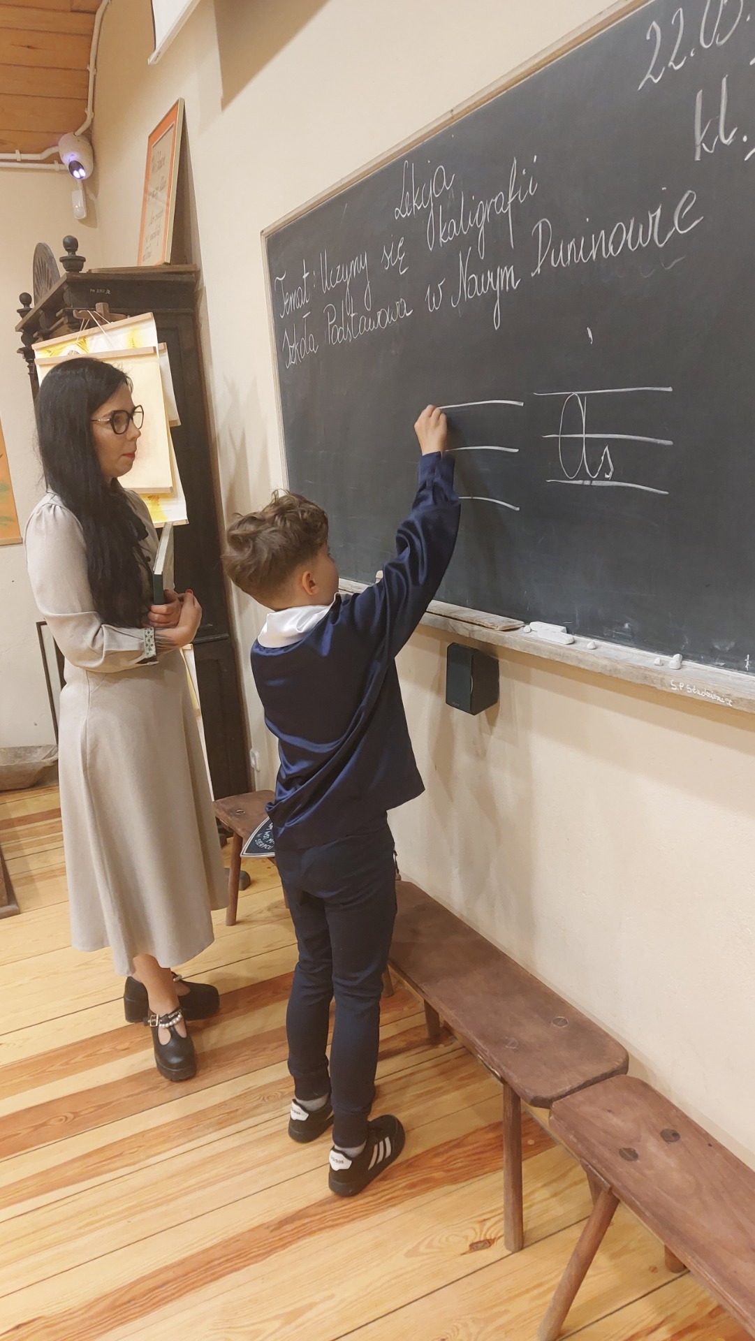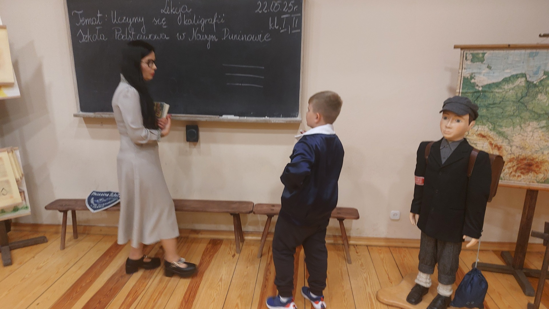 W dniu 22 maja 2025 r. uczniowie klas I i II Szkoły Podstawowej w Nowym Duninowie uczestniczyli w wycieczce do Muzeum Wsi Mazowieckiej w Sierpcu. Dzieci wzięły udział w niezwykle ciekawej lekcji kaligrafii – ubrane w szkolne mundurki sprzed lat, pisały piórem i atramentem, poznając dawne szkolne zwyczaje. W ramach zwiedzania muzeum uczestniczyły również w grze terenowej, która pozwoliła im w sposób aktywny odkrywać tajemnice mazowieckiej wsi. Wielką atrakcją była przejażdżka wozem konnym oraz możliwość zakupu pamiątek. Na zakończenie wycieczki dzieci odwiedziły restaurację McDonald’s, a drogę powrotną umilały sobie wspólnym, radosnym śpiewem w autobusie. Wycieczka dostarczyła wszystkim wielu niezapomnianych wrażeń i była okazją do nauki poprzez zabawę.