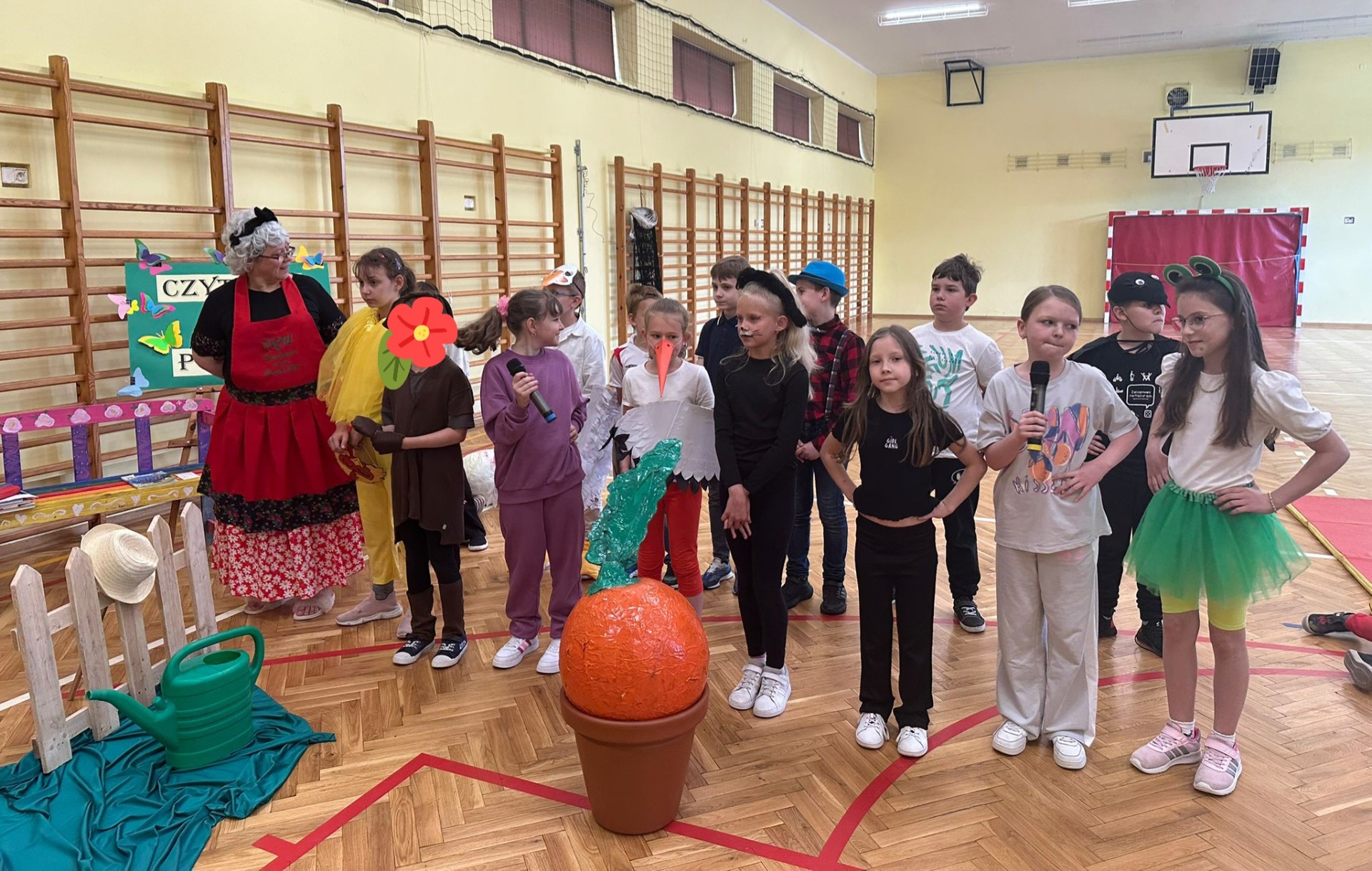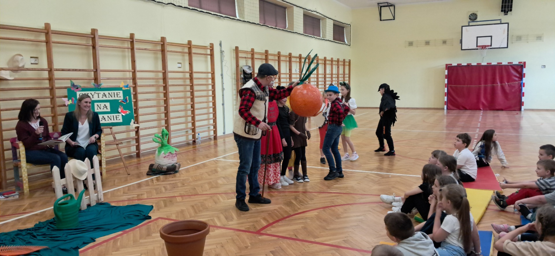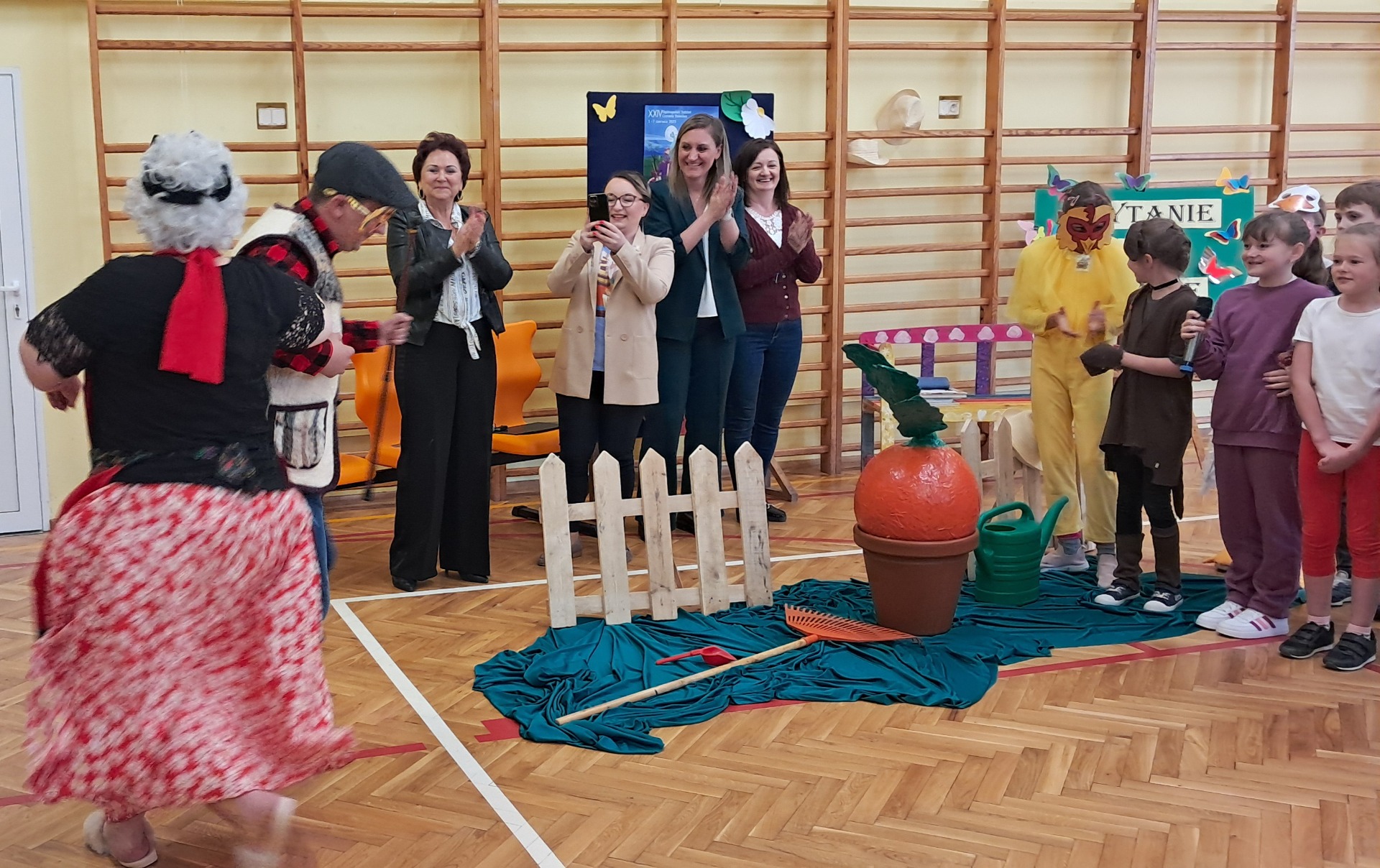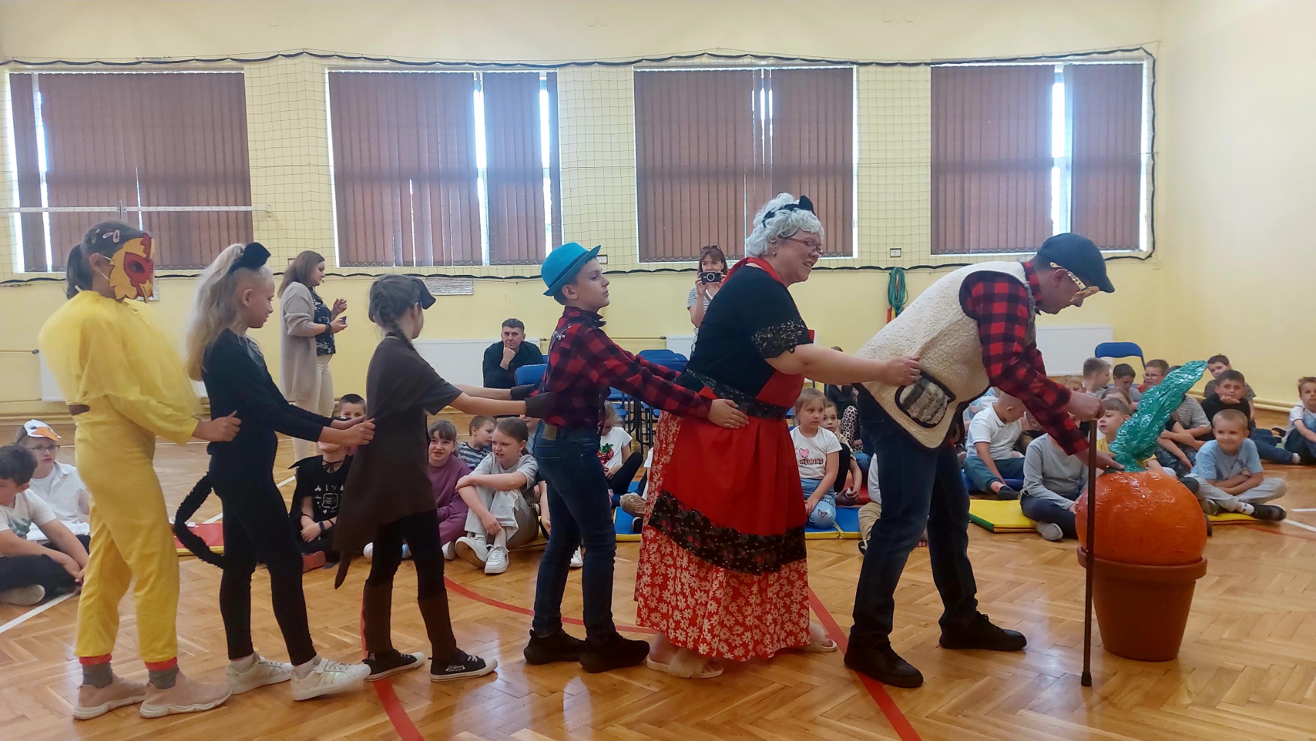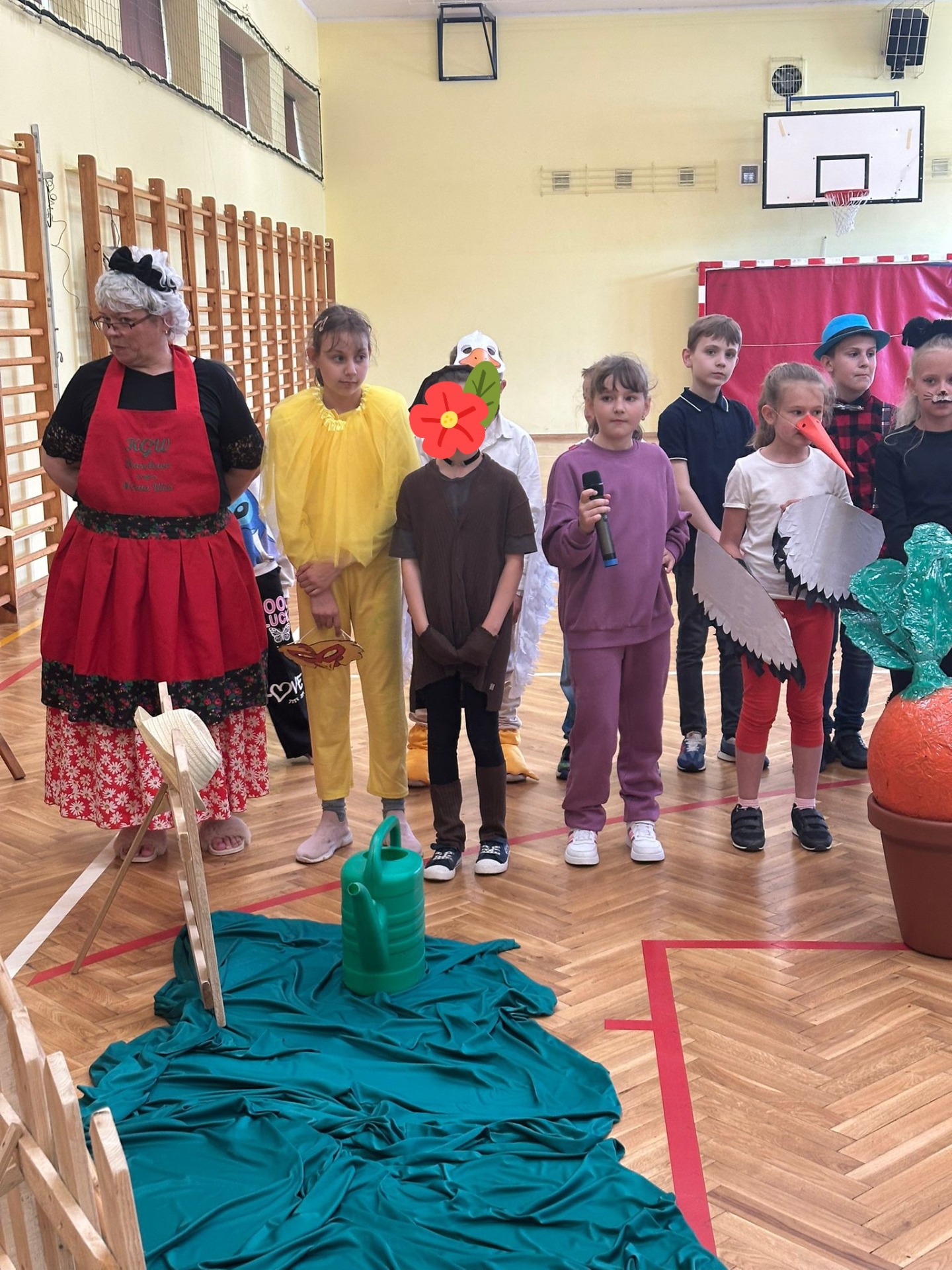 Dzieci, wspólnie z zaproszonymi gośćmi, przygotowały barwną i pełną humoru inscenizację znanego wiersza Juliana Tuwima pt. „Rzepka”. W rolę Dziadka wcielił się Wójt Gminy Nowy Duninów, Pan Karol Gutkowicz, a Babcię odegrała Radna Gminy Nowy Duninów, Pani Iwona Rękawiecka. Na scenie nie zabrakło również małych aktorów – uczniów klasy II, którzy z zapałem odgrywali role: Wnuczka, Kurki, Kici, Mruczka, Gąski, Boćka i Żabki.
