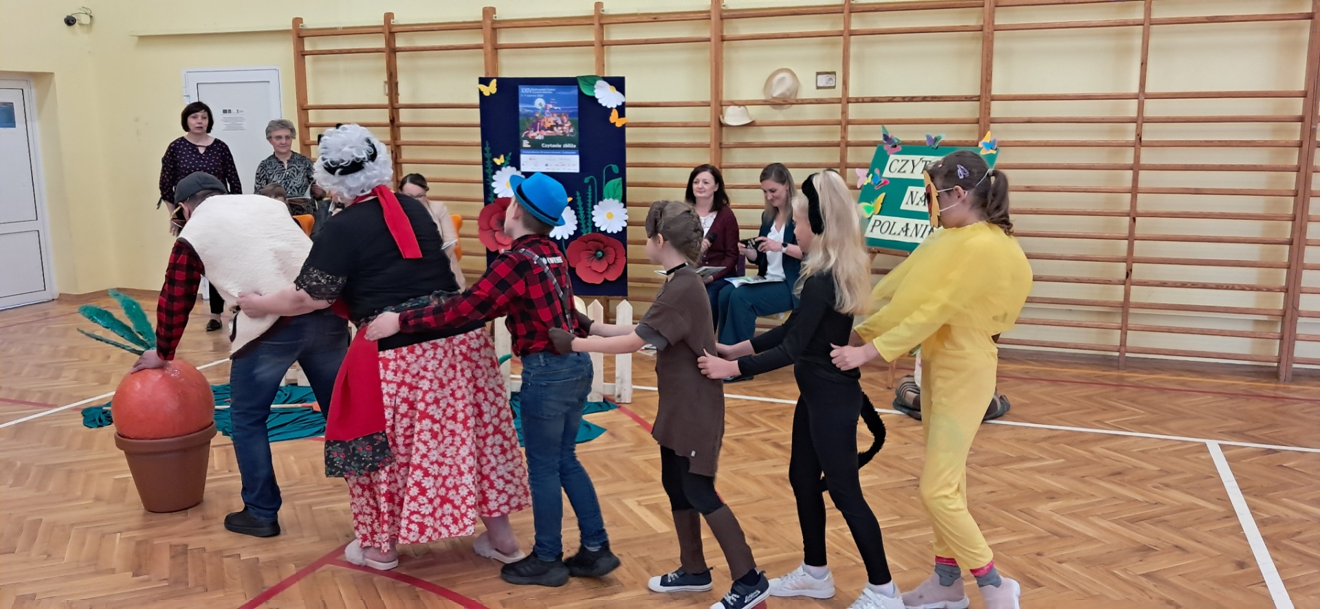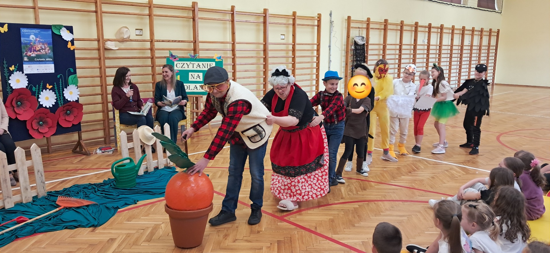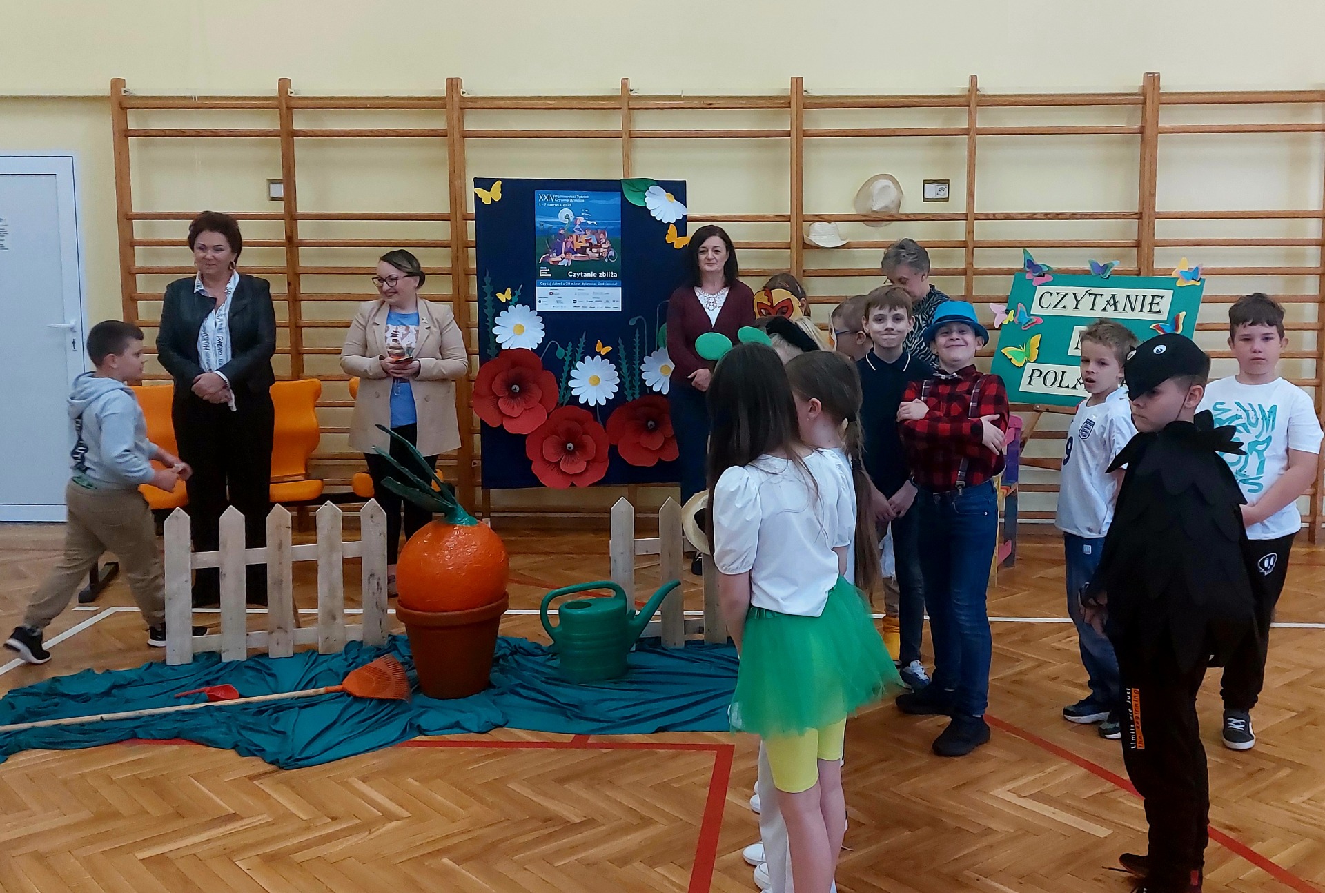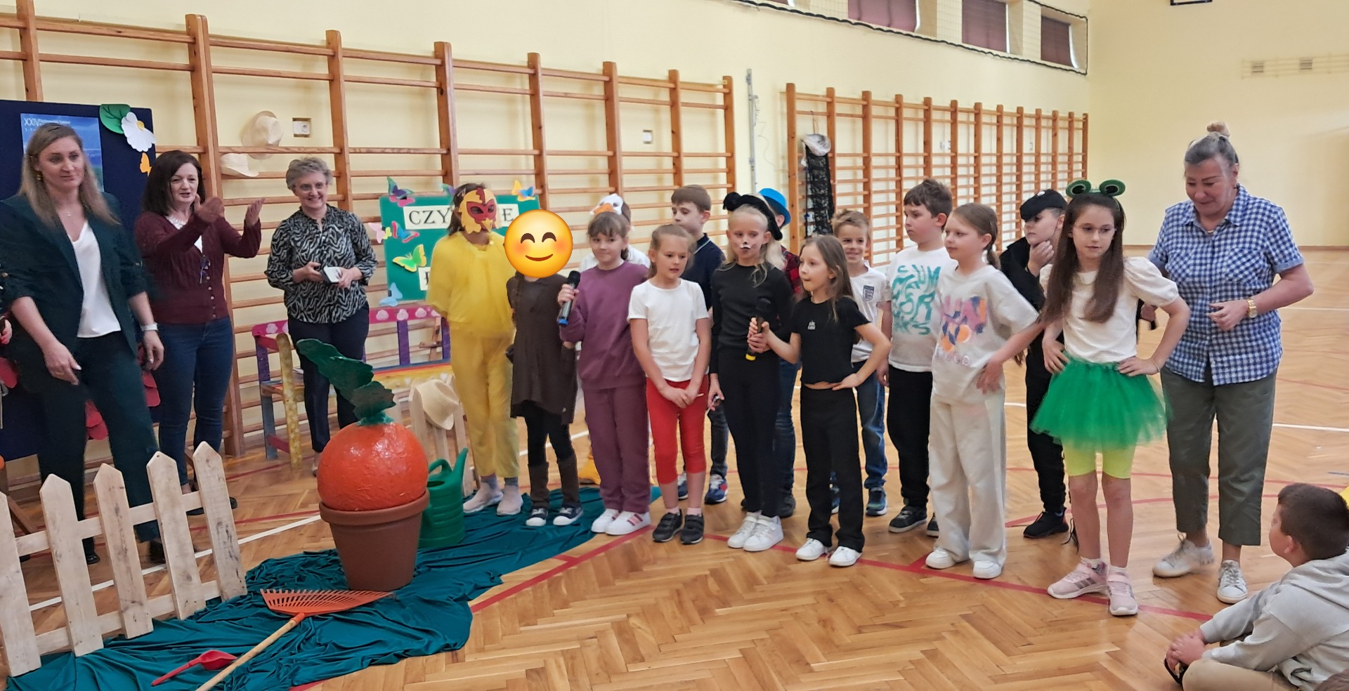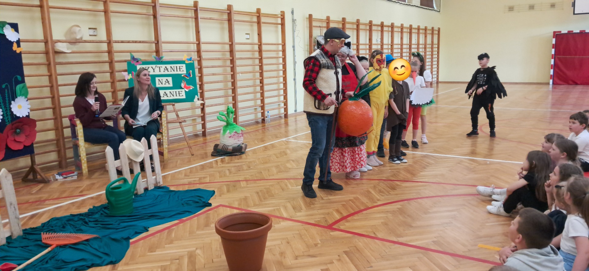 Dzieci, wspólnie z zaproszonymi gośćmi, przygotowały barwną i pełną humoru inscenizację znanego wiersza Juliana Tuwima pt. „Rzepka”. W rolę Dziadka wcielił się Wójt Gminy Nowy Duninów, Pan Karol Gutkowicz, a Babcię odegrała Radna Gminy Nowy Duninów, Pani Iwona Rękawiecka. Na scenie nie zabrakło również małych aktorów – uczniów klasy II, którzy z zapałem odgrywali role: Wnuczka, Kurki, Kici, Mruczka, Gąski, Boćka i Żabki.
