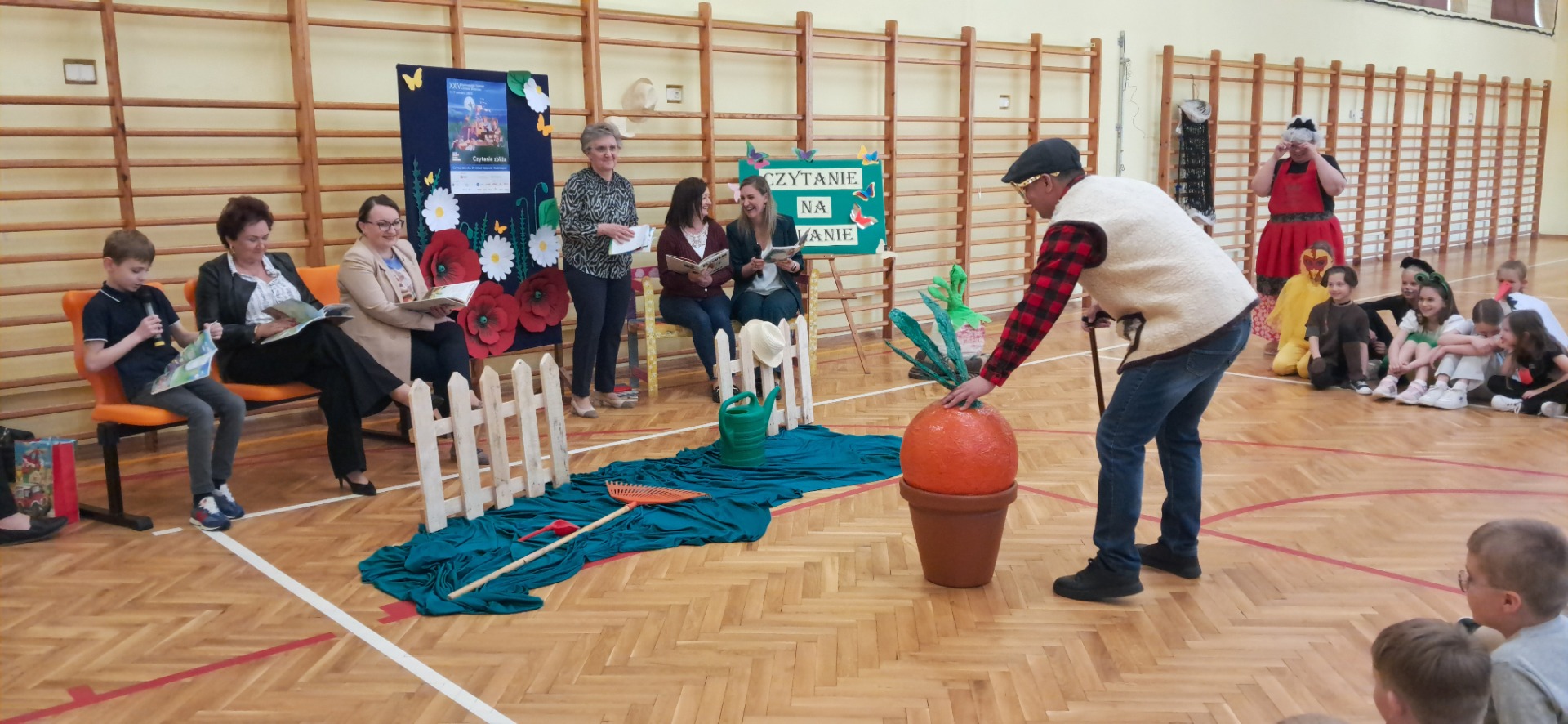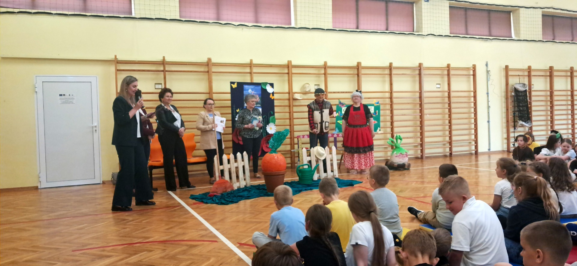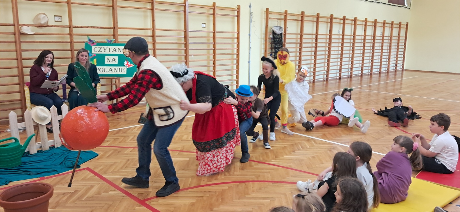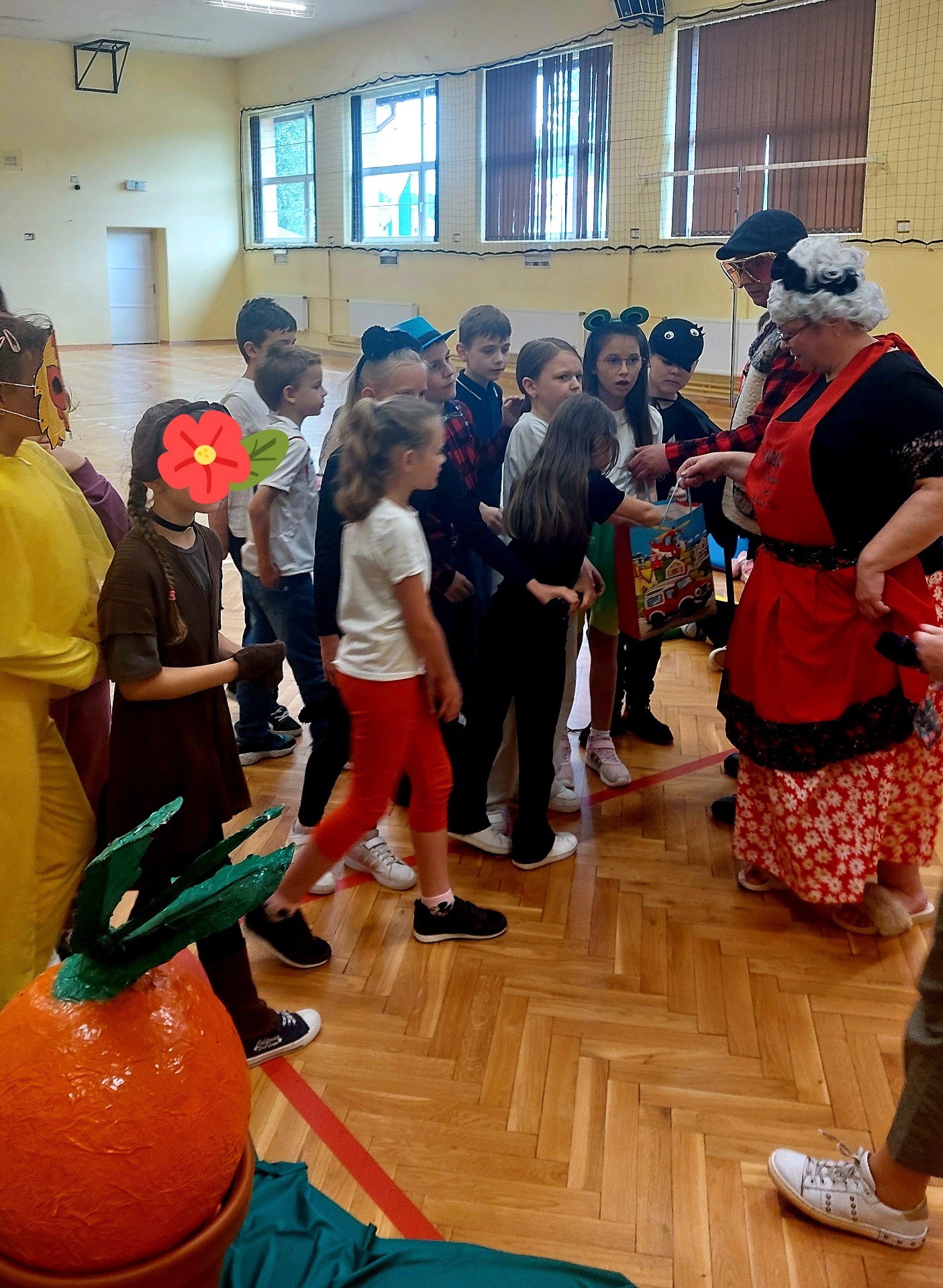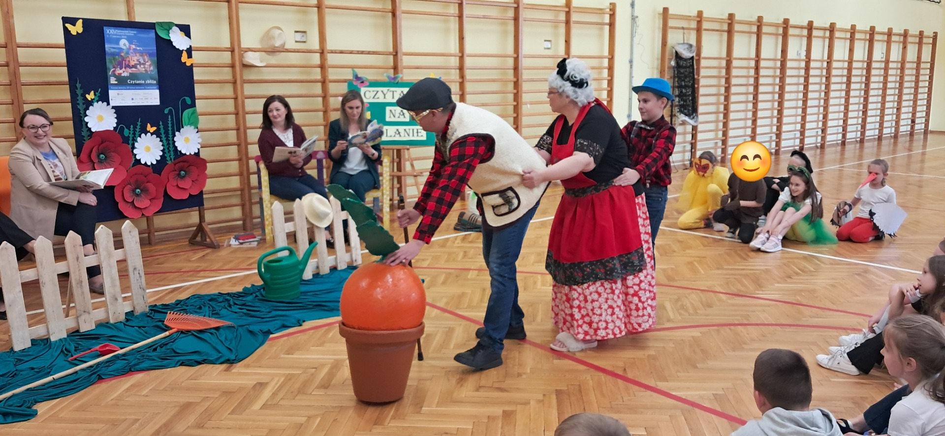 Dzieci, wspólnie z zaproszonymi gośćmi, przygotowały barwną i pełną humoru inscenizację znanego wiersza Juliana Tuwima pt. „Rzepka”. W rolę Dziadka wcielił się Wójt Gminy Nowy Duninów, Pan Karol Gutkowicz, a Babcię odegrała Radna Gminy Nowy Duninów, Pani Iwona Rękawiecka. Na scenie nie zabrakło również małych aktorów – uczniów klasy II, którzy z zapałem odgrywali role: Wnuczka, Kurki, Kici, Mruczka, Gąski, Boćka i Żabki.