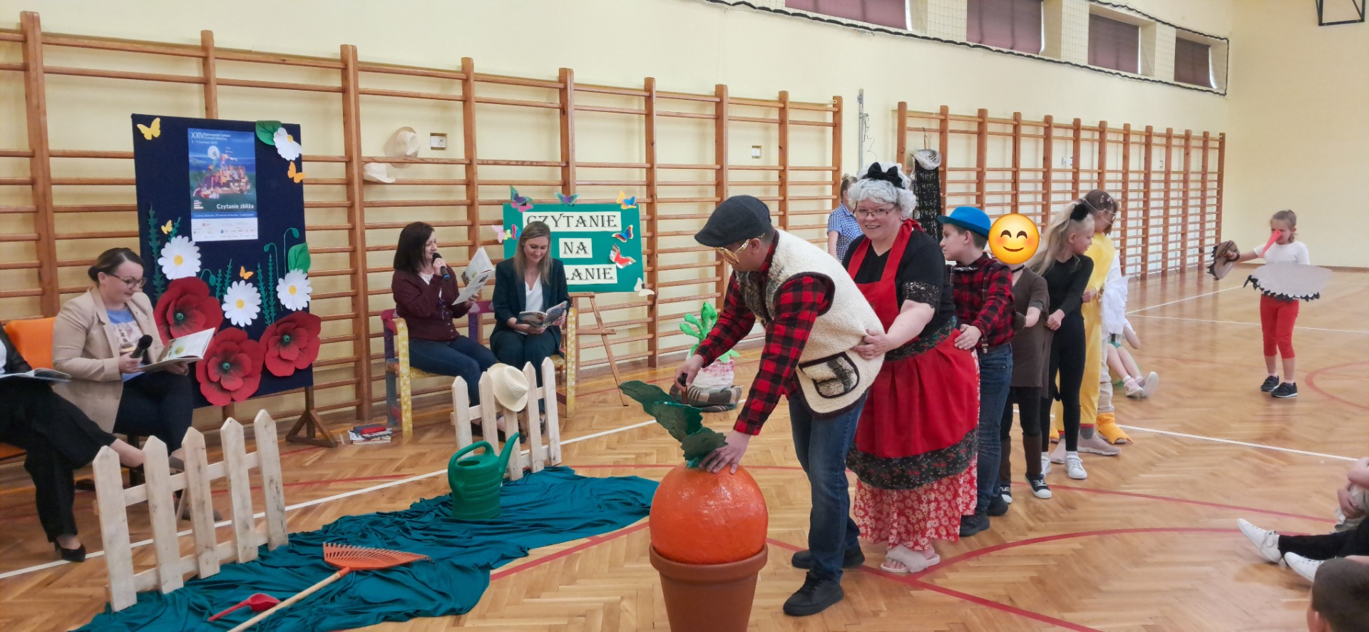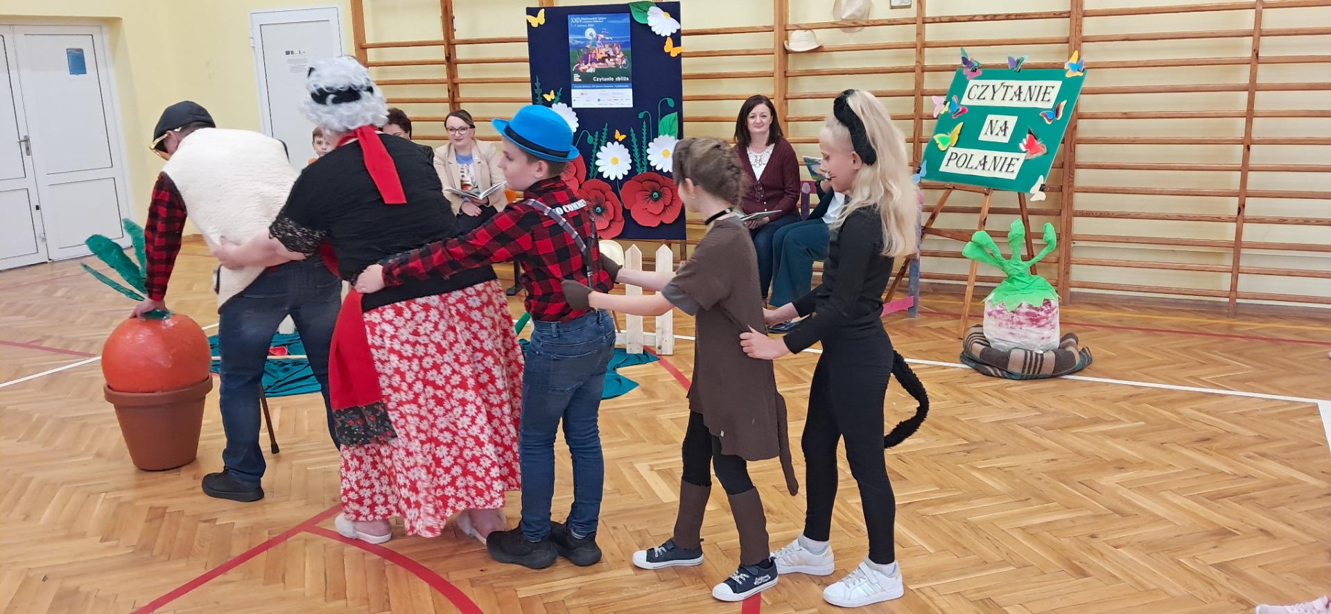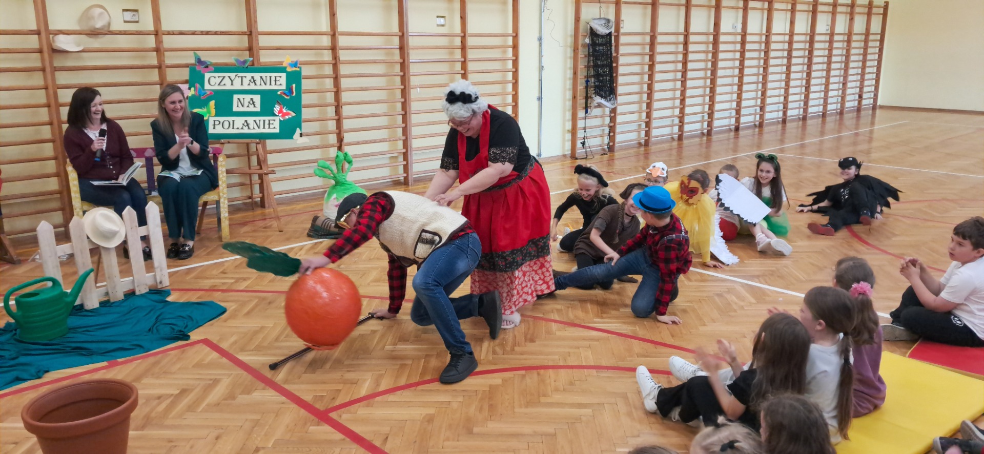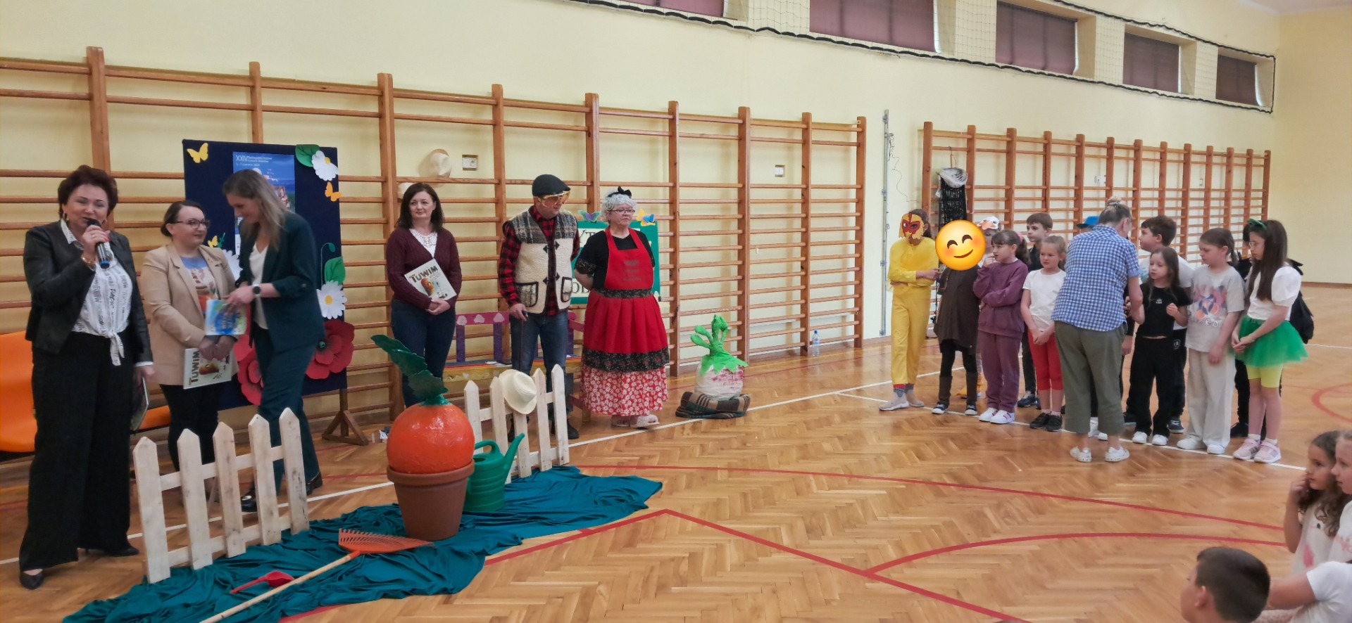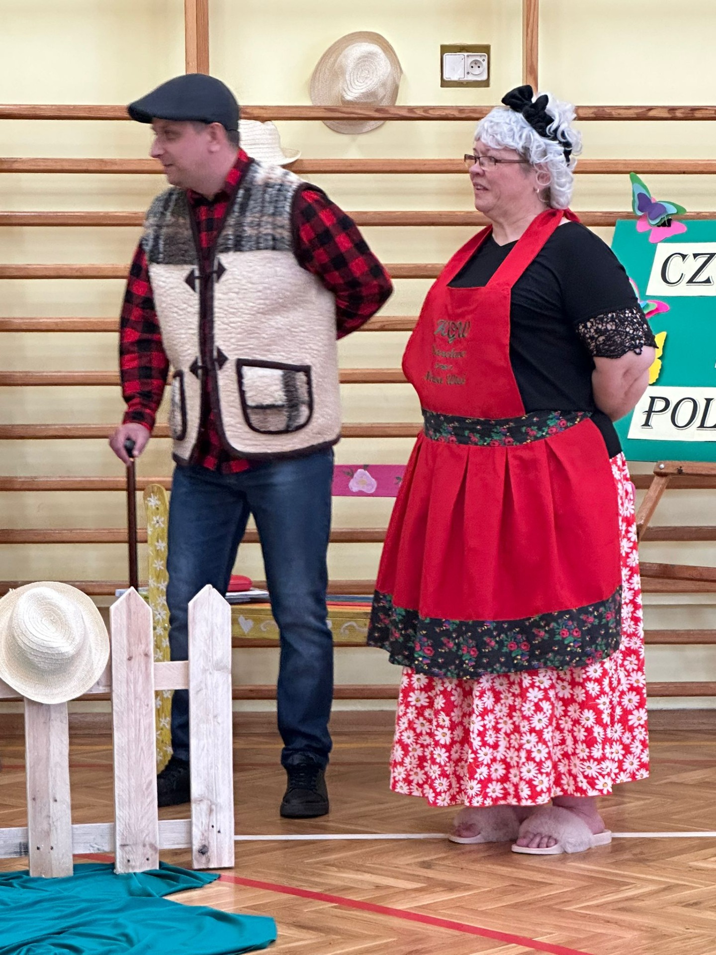 Dzieci, wspólnie z zaproszonymi gośćmi, przygotowały barwną i pełną humoru inscenizację znanego wiersza Juliana Tuwima pt. „Rzepka”. W rolę Dziadka wcielił się Wójt Gminy Nowy Duninów, Pan Karol Gutkowicz, a Babcię odegrała Radna Gminy Nowy Duninów, Pani Iwona Rękawiecka. Na scenie nie zabrakło również małych aktorów – uczniów klasy II, którzy z zapałem odgrywali role: Wnuczka, Kurki, Kici, Mruczka, Gąski, Boćka i Żabki.