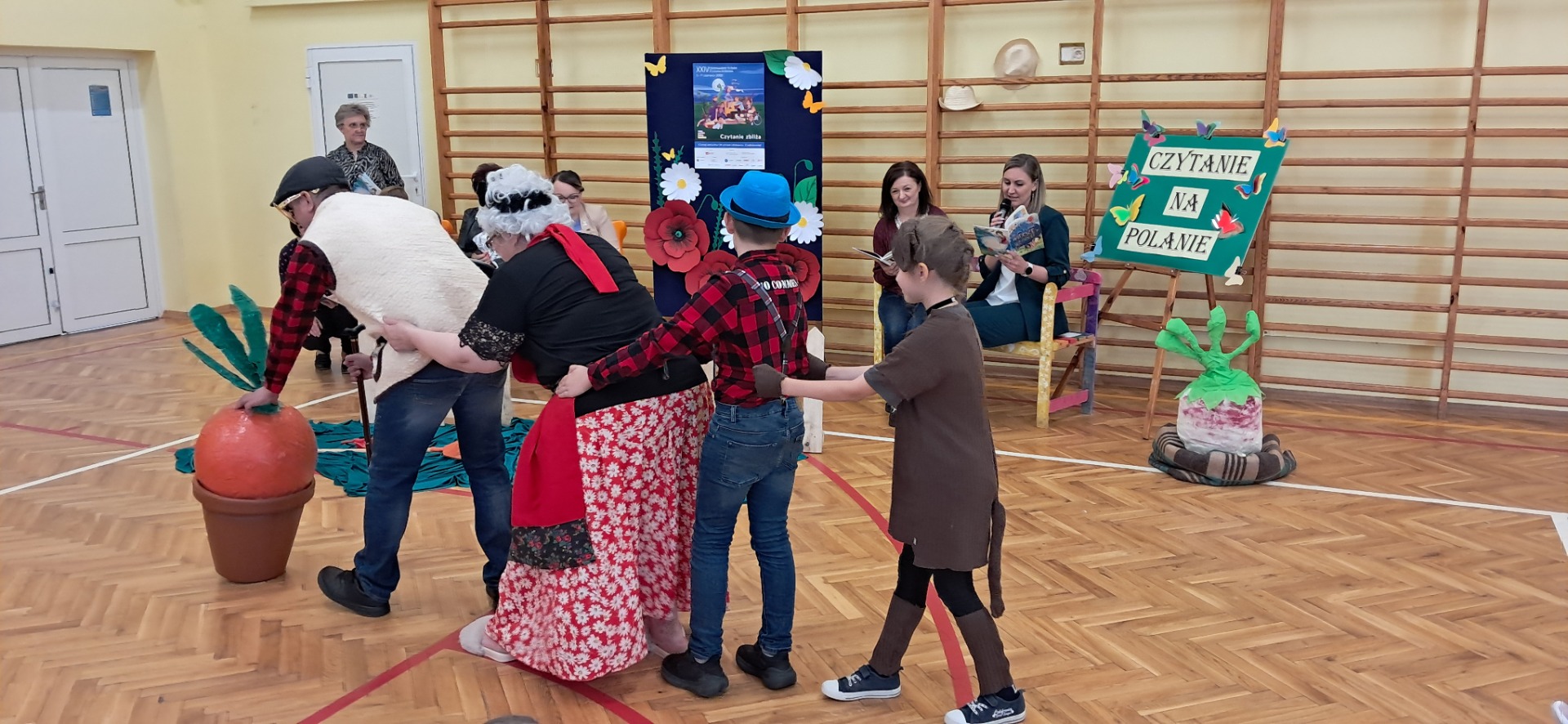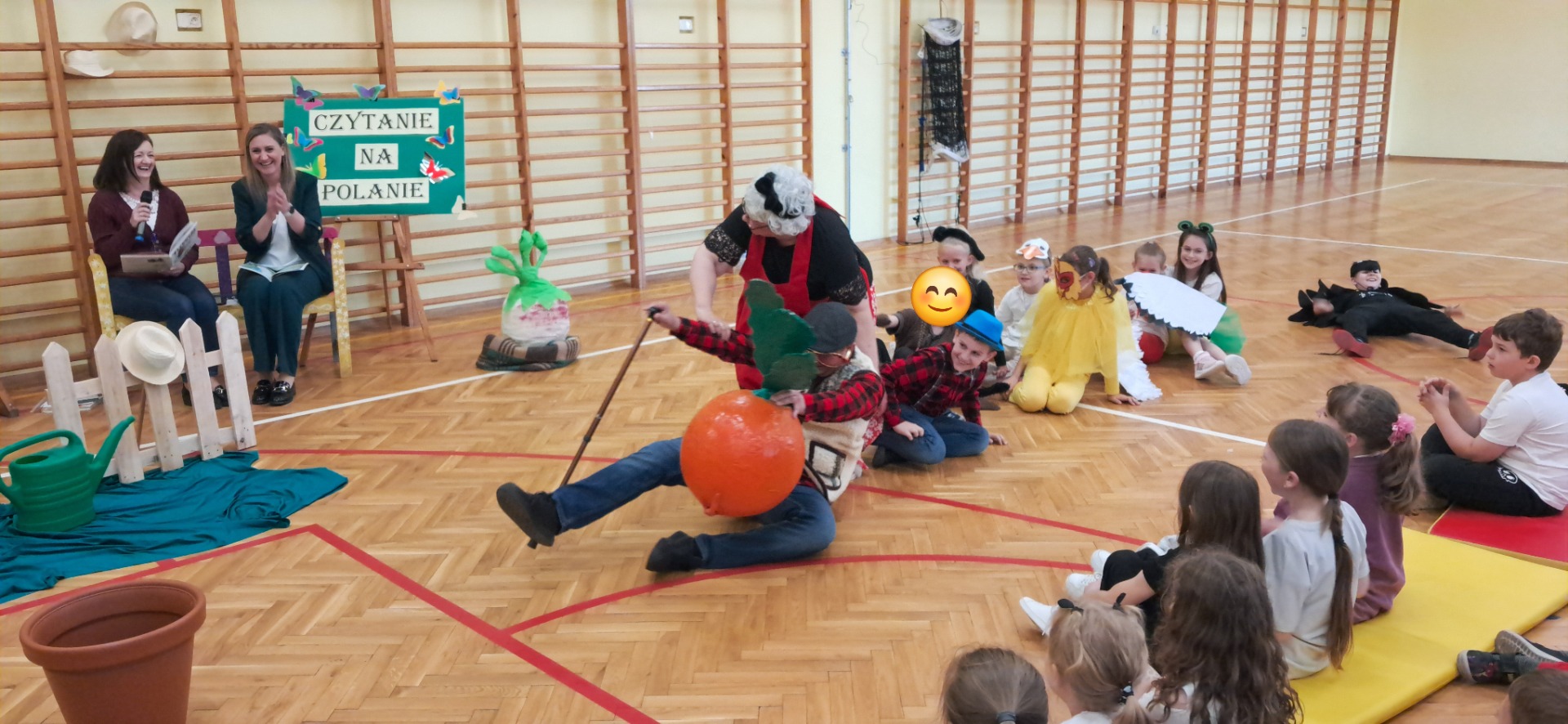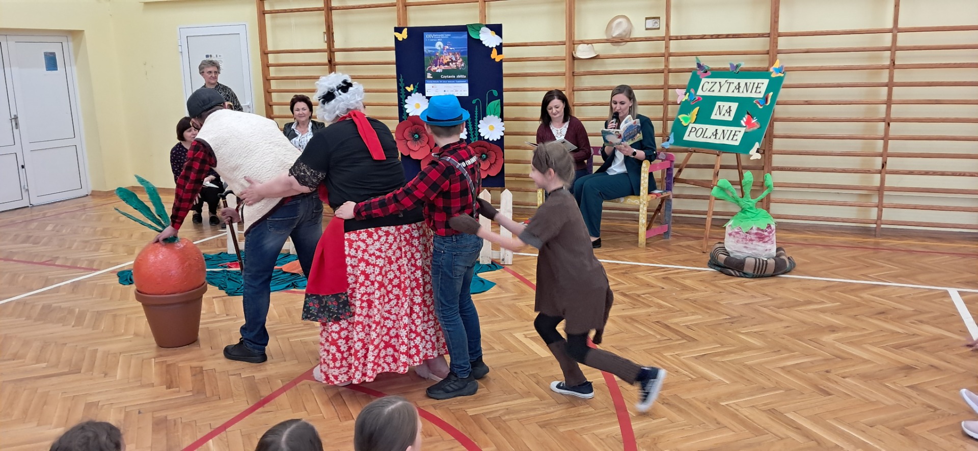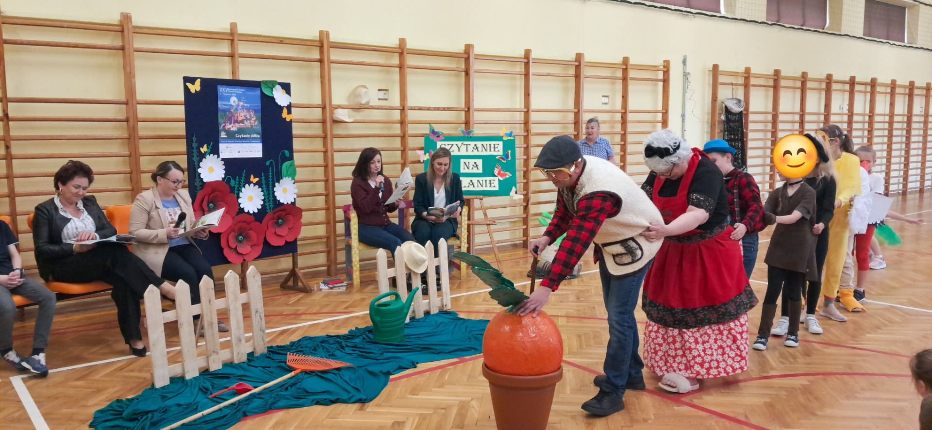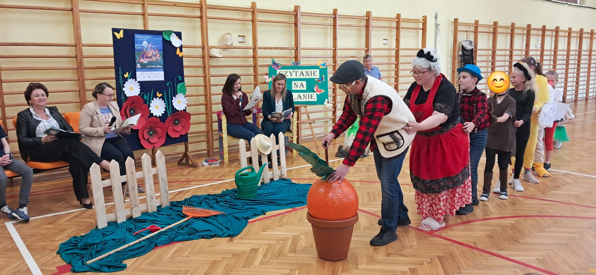 Dzieci, wspólnie z zaproszonymi gośćmi, przygotowały barwną i pełną humoru inscenizację znanego wiersza Juliana Tuwima pt. „Rzepka”. W rolę Dziadka wcielił się Wójt Gminy Nowy Duninów, Pan Karol Gutkowicz, a Babcię odegrała Radna Gminy Nowy Duninów, Pani Iwona Rękawiecka. Na scenie nie zabrakło również małych aktorów – uczniów klasy II, którzy z zapałem odgrywali role: Wnuczka, Kurki, Kici, Mruczka, Gąski, Boćka i Żabki.