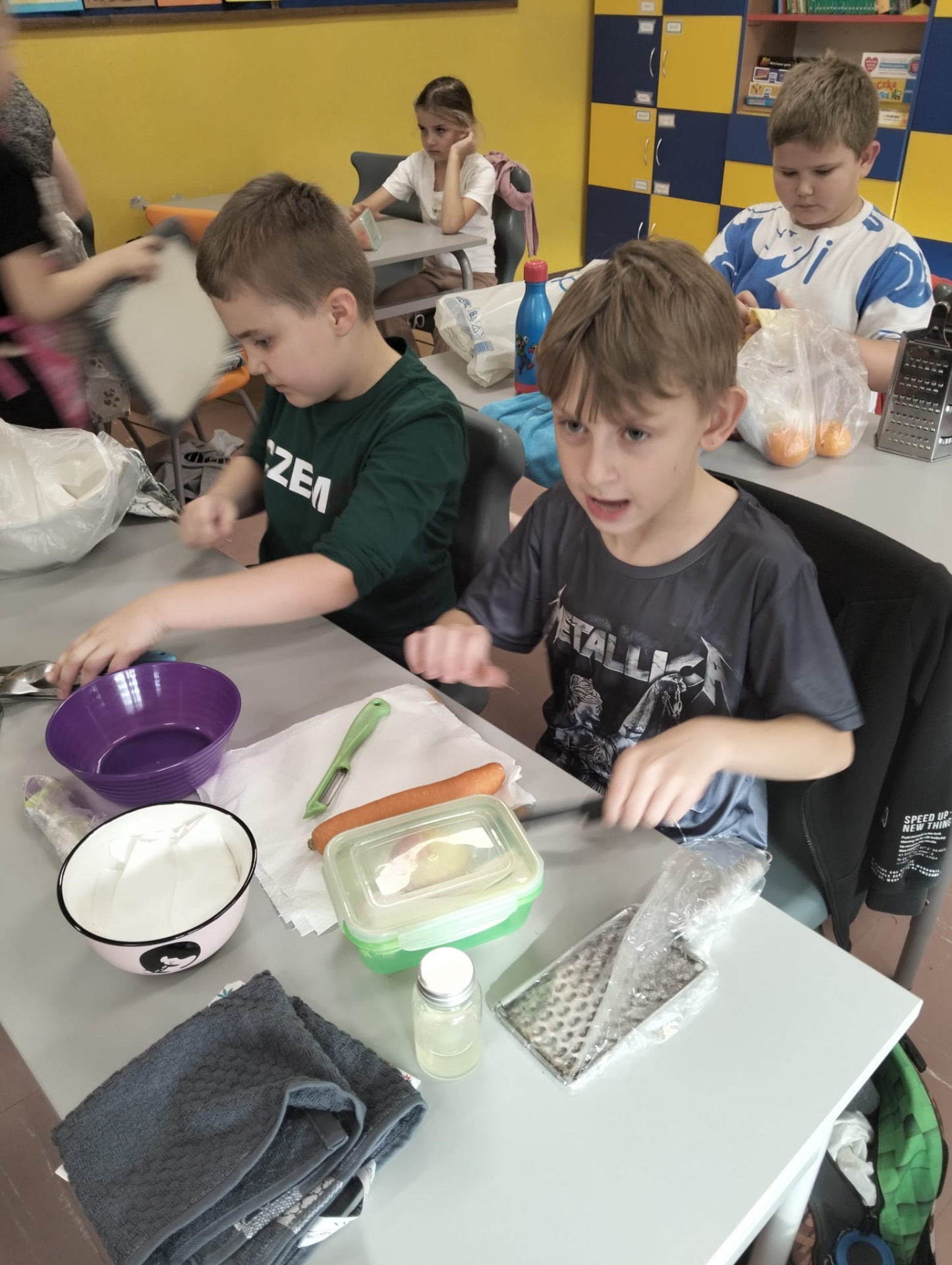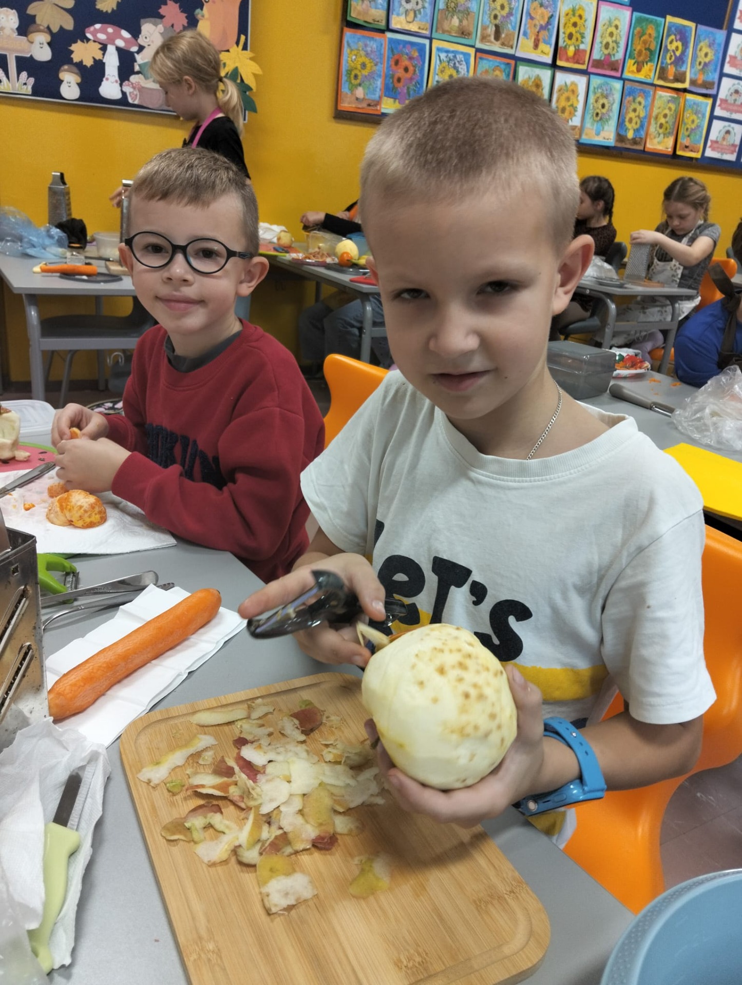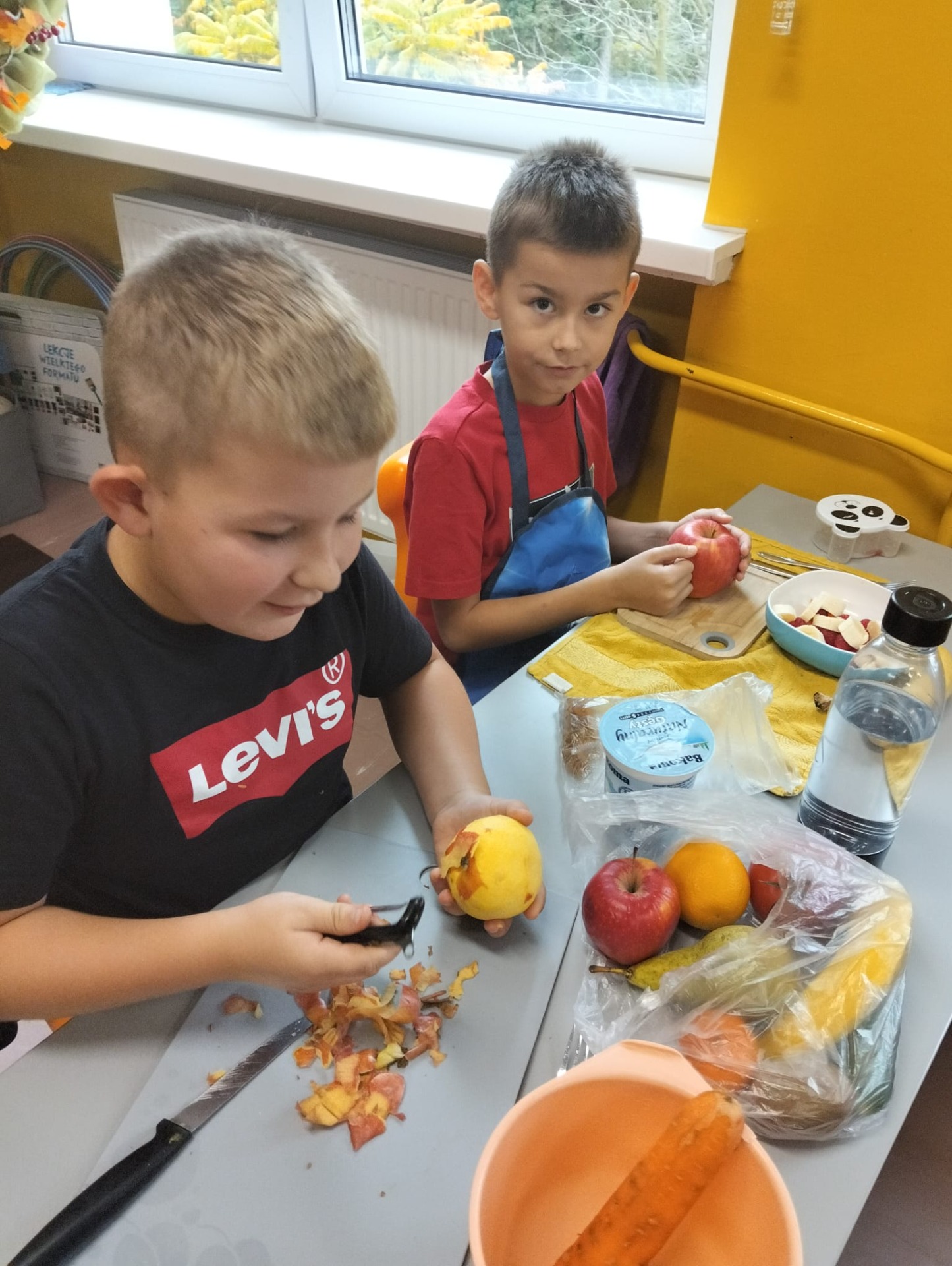 Zwiększenie ilości spożywania zdrowych owoców i warzyw to główny cel Światowego Dnia Owoców i Warzyw, który w kalendarzu przypadał w tym roku 17 października. Święto to zapoczątkowane w Nowej Zelandii postanowiliśmy uczcić i w naszej szkole. Z tej okazji odbyły się w klasie II zajęcia edukacyjne, praktyczne warsztaty robienia surówki na drugie śniadanie i zajęcia twórczości plastycznej. W ten sposób przypomnieliśmy, że właściwe odżywianie jest najlepszym sposobem na zachowanie zdrowia i wzmocnienie odporności. Tak więc dzieci przygotowały pyszne surówki z ulubionych warzyw i owoców, królowały jabłka i marchewki ale na stole znalazły się także: por, sałata, pomidor, maliny, pomarańcze, banany i bakalie. Zachęcamy rodziców do częstszego wzbogacania diety dzieci o cenne i wartościowe produkty odżywcze . Wiemy, że słodycze są dobre tylko w smaku, a warzywa i owoce potrafią dobrze smakować i dobrze wpływają na nasze zdrowia.