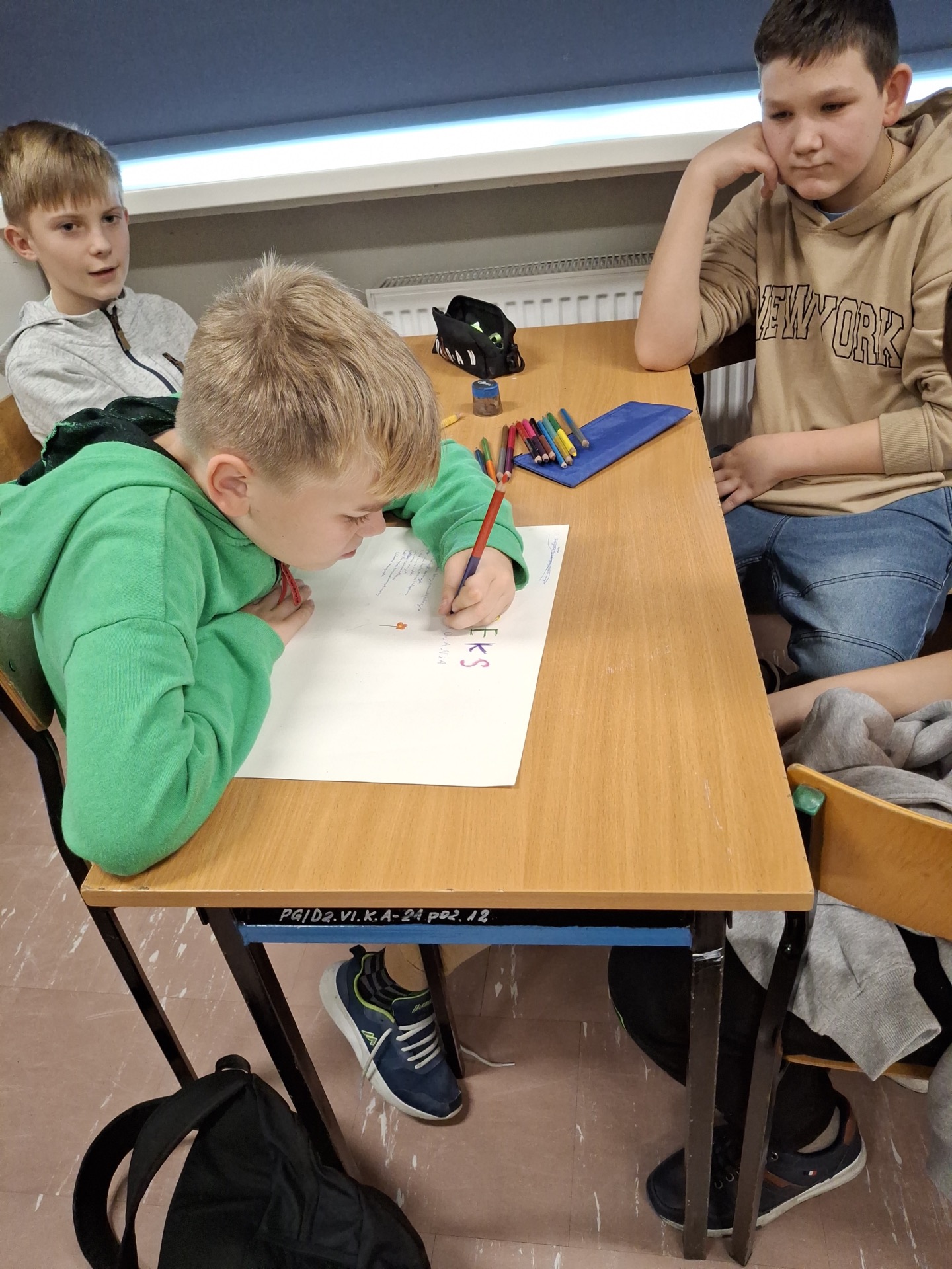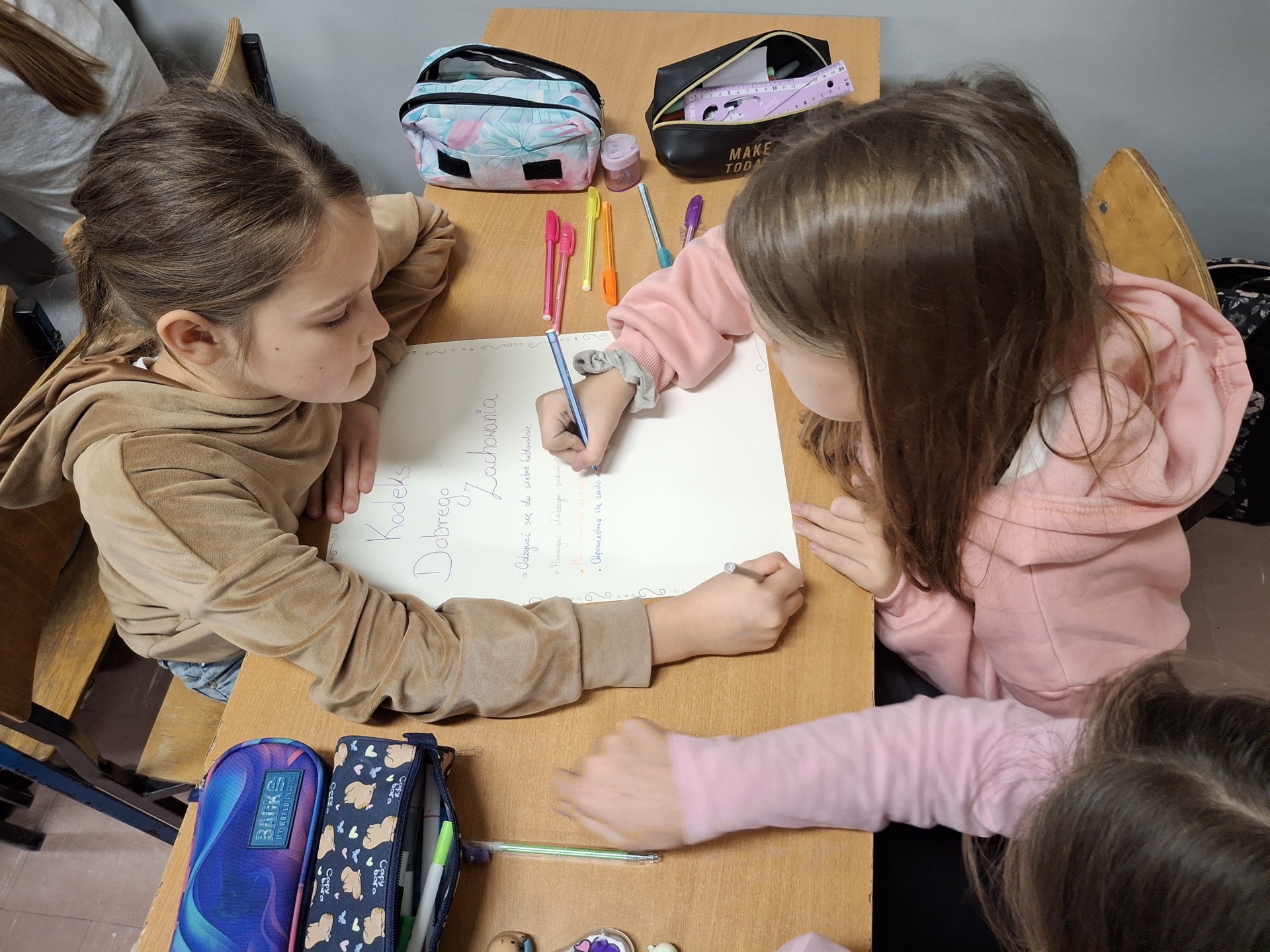 Podczas zajęć piątoklasiści rozwiązywali łamigłówki i zadania związane z pozytywnym przekazem, a także tworzyli Kodeksy Dobrego Słowa – zestawy zasad przypominające, jak mówić do siebie i innych z życzliwością, szacunkiem i empatią.
