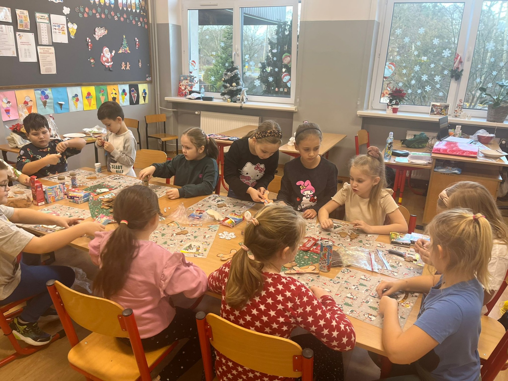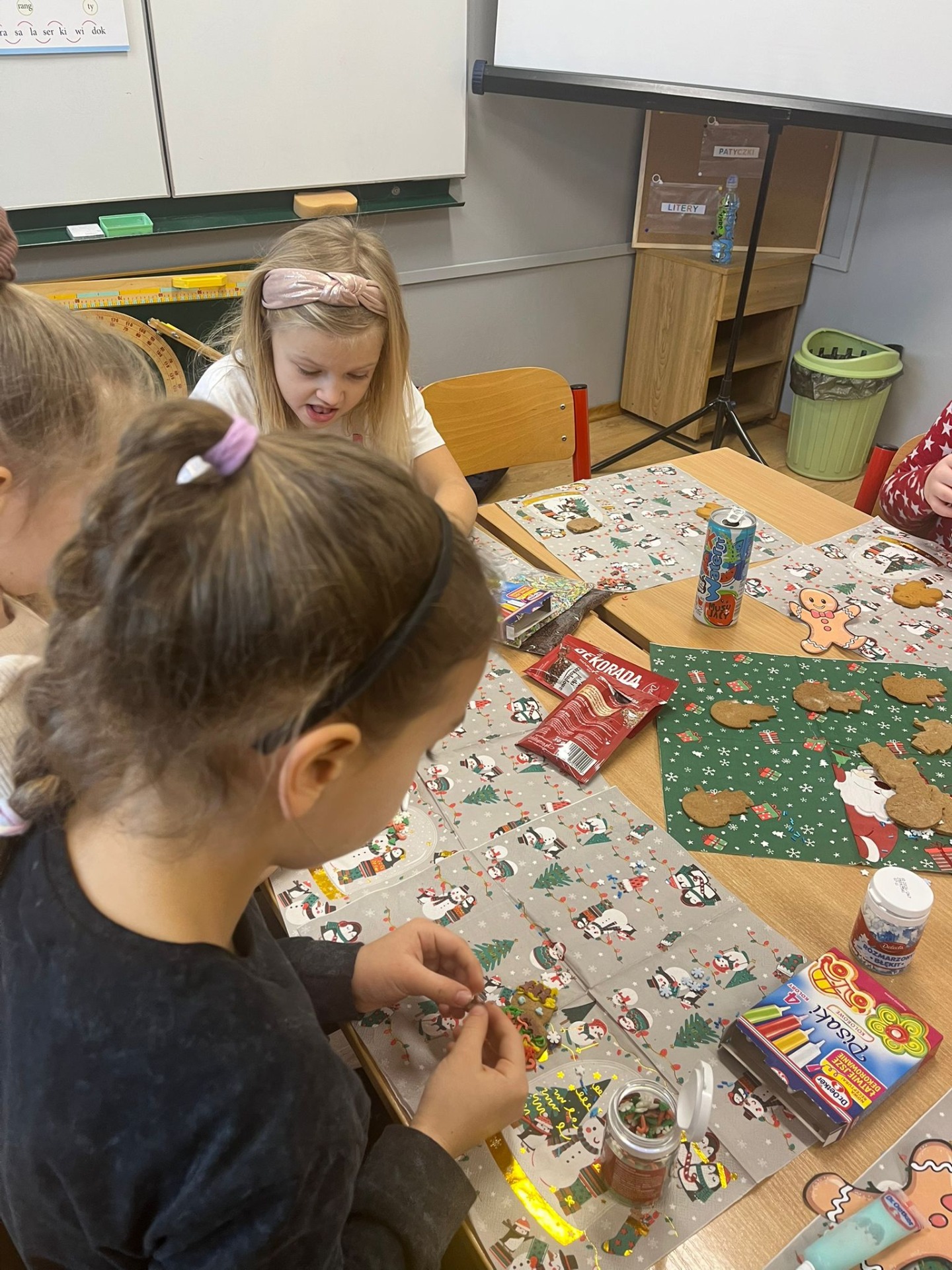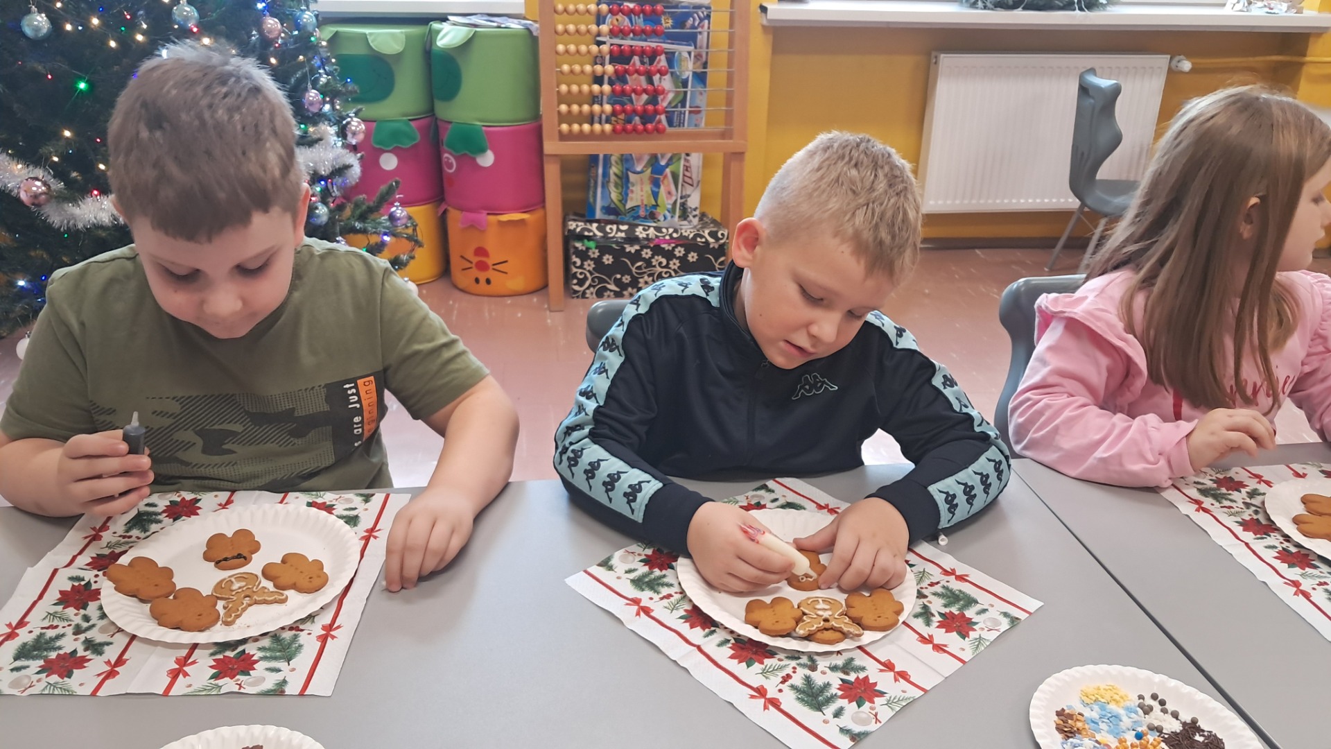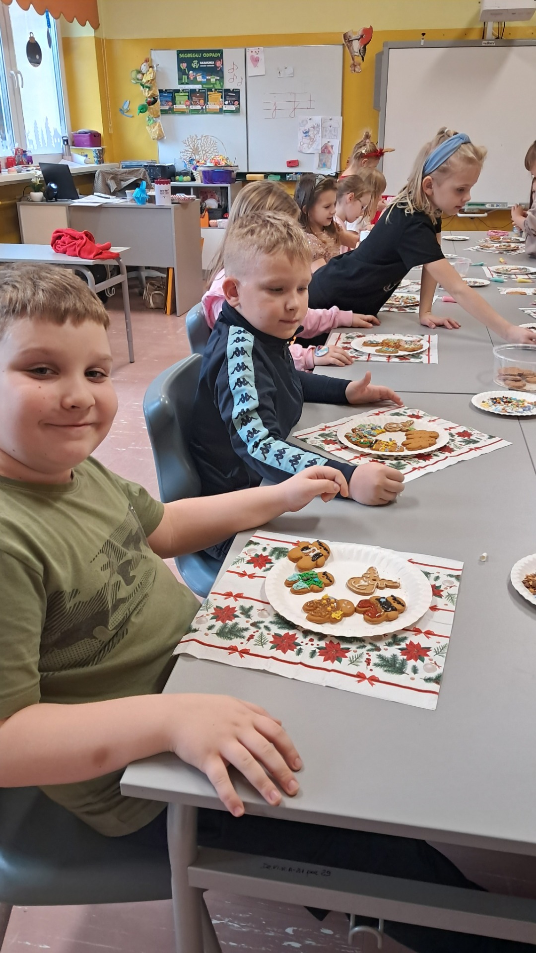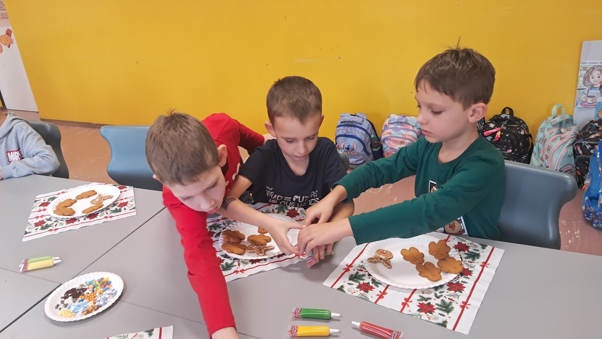 Przedświąteczny czas każdemu kojarzy się z pieczeniem i dekorowaniem pierników oraz wspólnym kolędowaniem. Zgodnie z tradycją w klasach Ia i Ib dzieci zebrały się, aby w swoim gronie udekorować świateczne pierniczki. Na stołach pojawiły się kolorowe pisaki z lukrem, posypki, które pomogły w dekorowaniu. Zdobienie okazało się nie tylko twórczym wyzwaniem, ale także świetną okazją do integracji i wspólnego spędzania czasu w duchu zbliżających się świąt.
