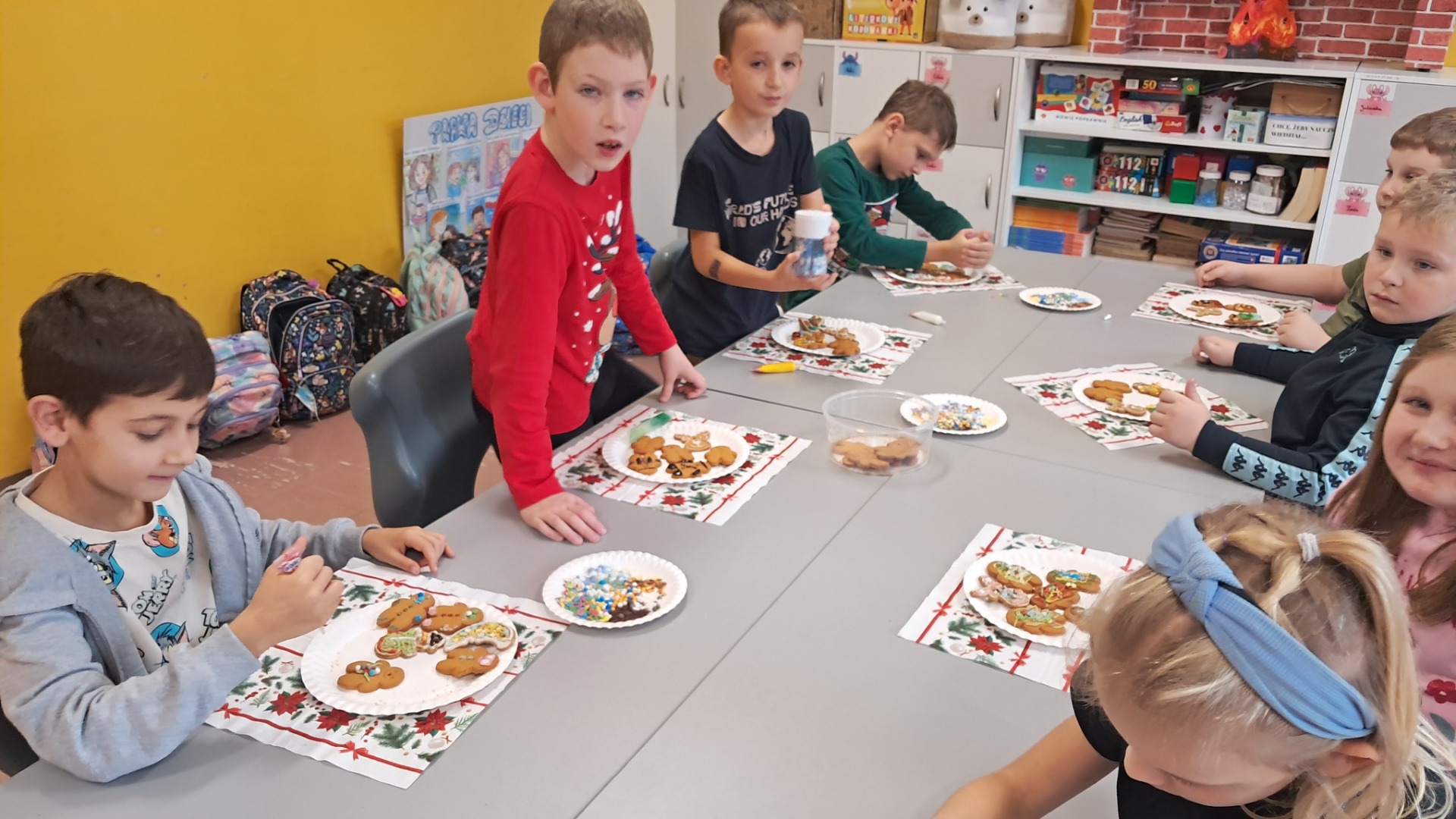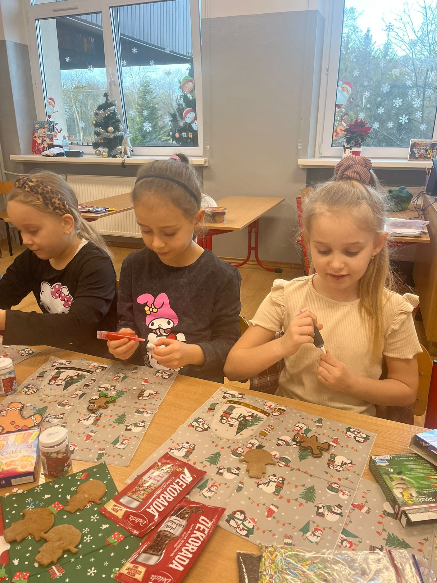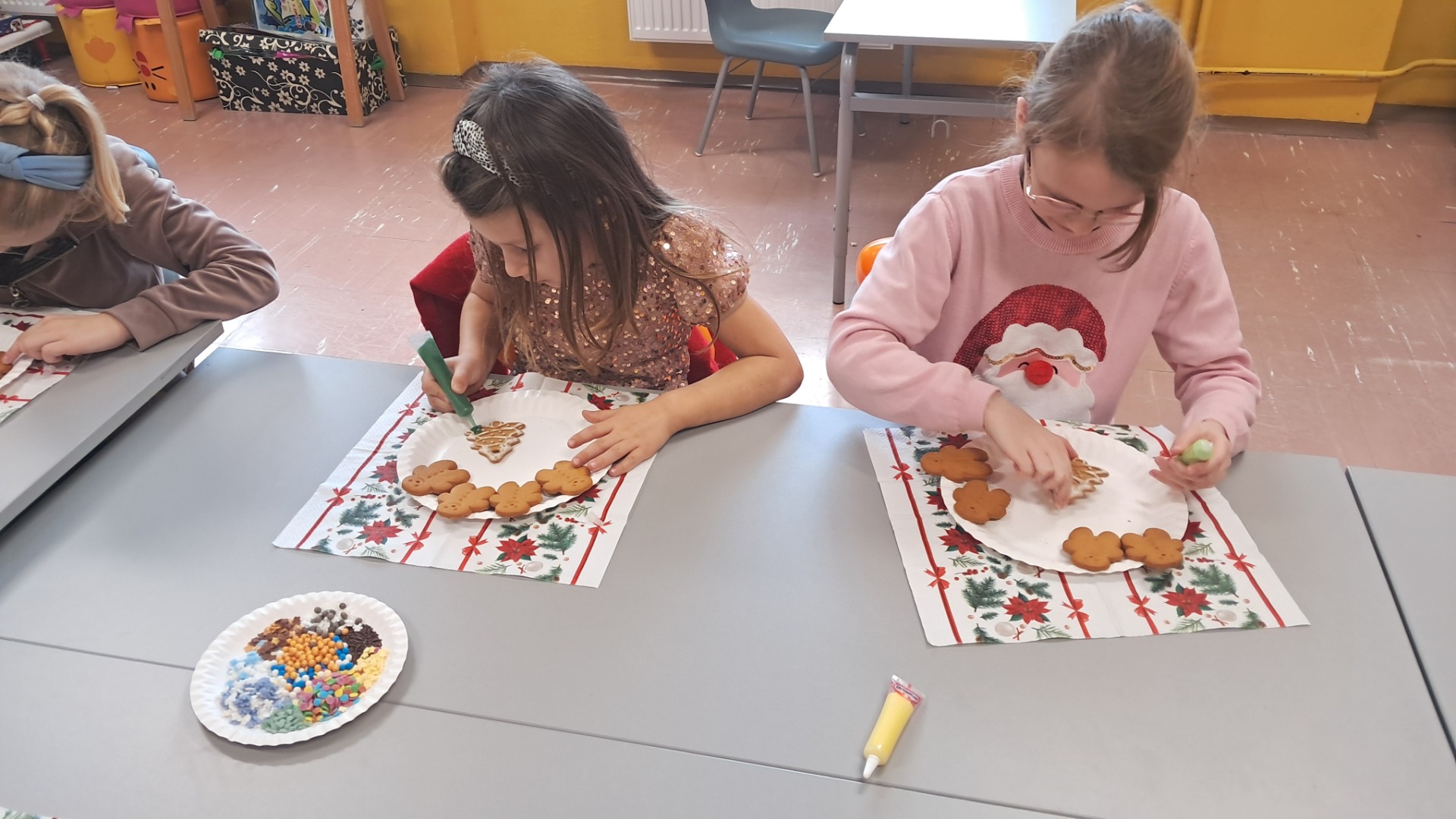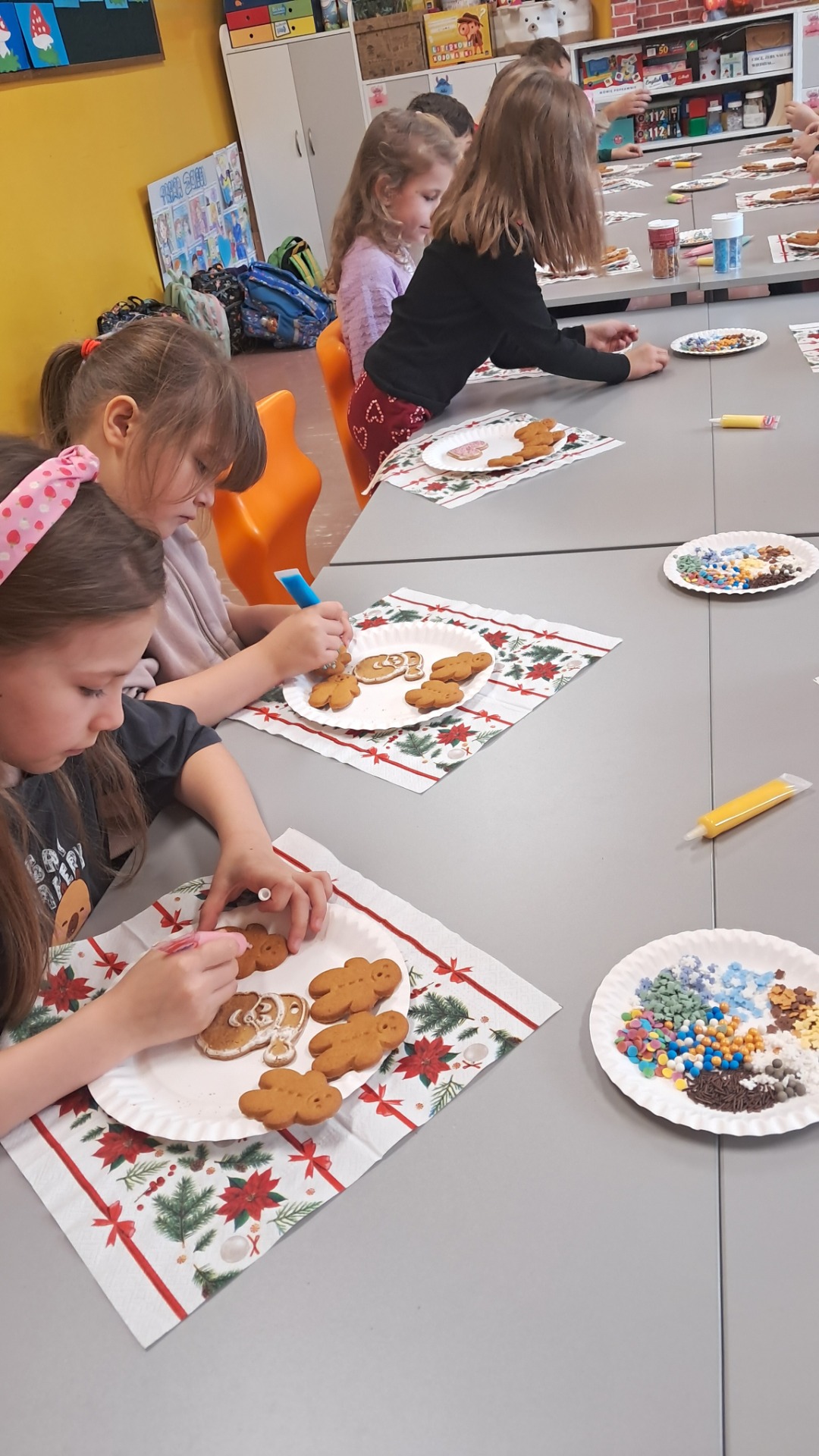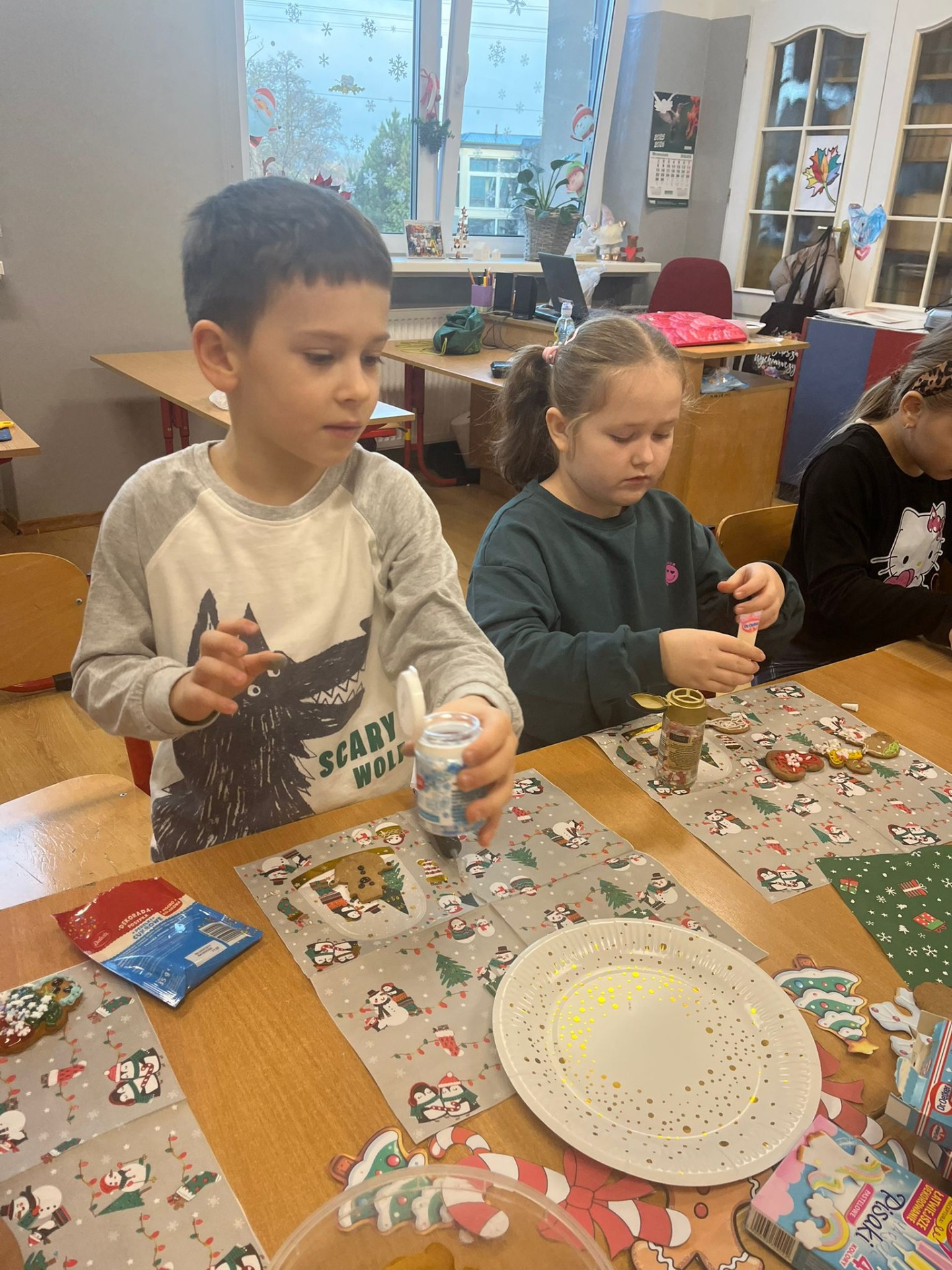 Przedświąteczny czas każdemu kojarzy się z pieczeniem i dekorowaniem pierników oraz wspólnym kolędowaniem. Zgodnie z tradycją w klasach Ia i Ib dzieci zebrały się, aby w swoim gronie udekorować świateczne pierniczki. Na stołach pojawiły się kolorowe pisaki z lukrem, posypki, które pomogły w dekorowaniu. Zdobienie okazało się nie tylko twórczym wyzwaniem, ale także świetną okazją do integracji i wspólnego spędzania czasu w duchu zbliżających się świąt.