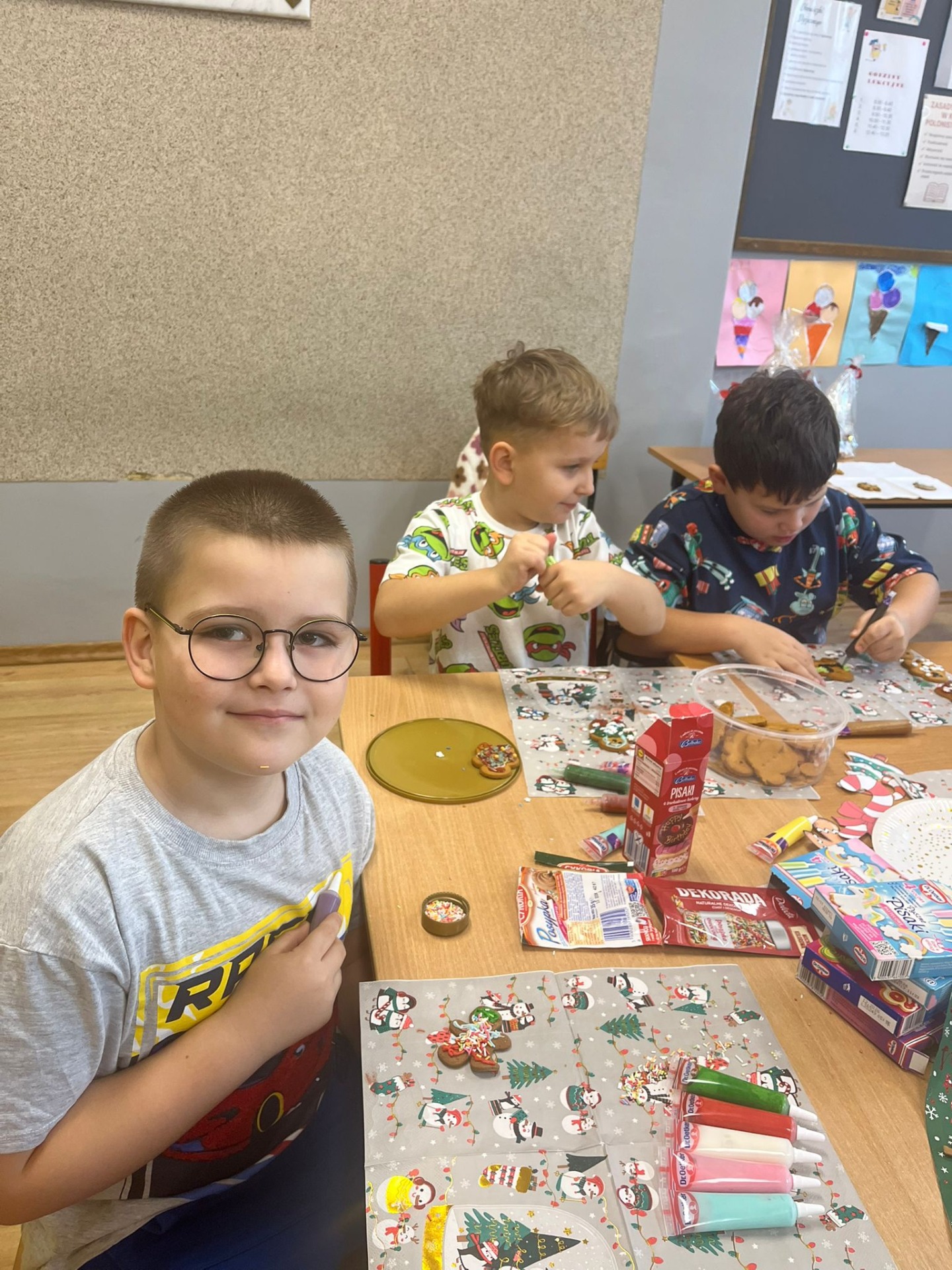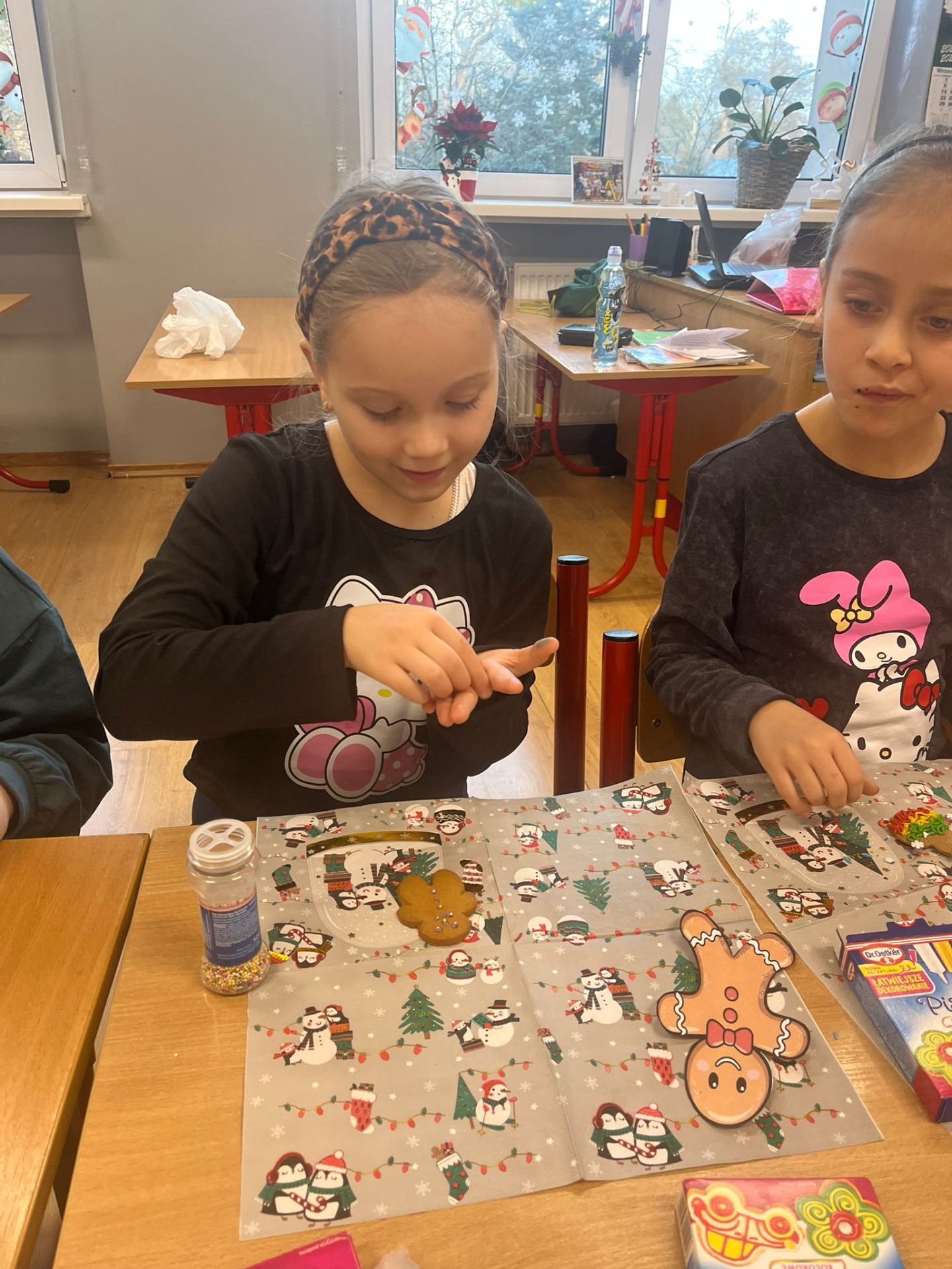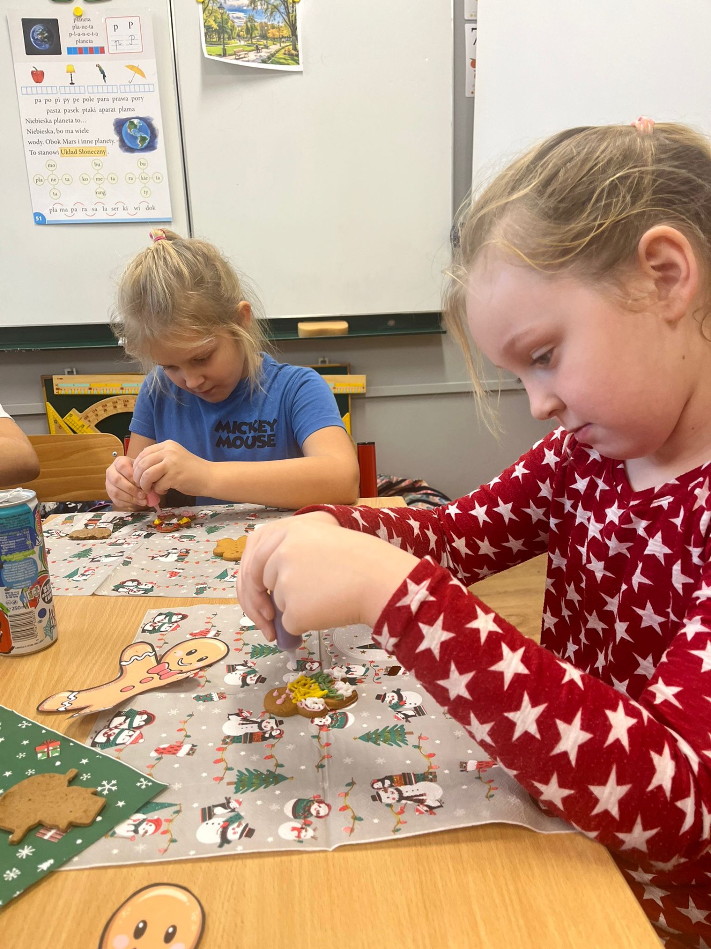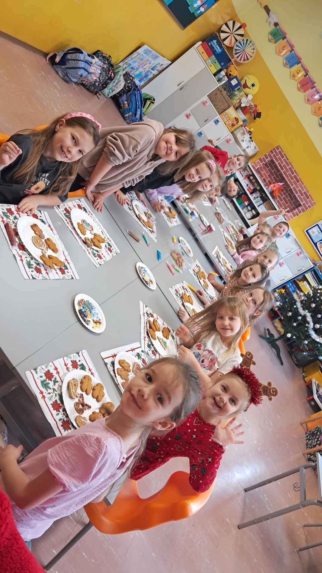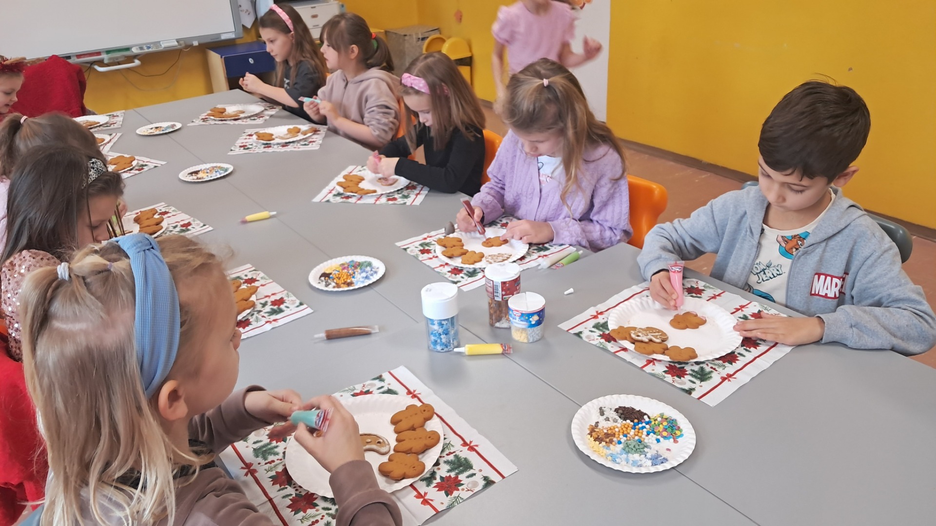 Przedświąteczny czas każdemu kojarzy się z pieczeniem i dekorowaniem pierników oraz wspólnym kolędowaniem. Zgodnie z tradycją w klasach Ia i Ib dzieci zebrały się, aby w swoim gronie udekorować świateczne pierniczki. Na stołach pojawiły się kolorowe pisaki z lukrem, posypki, które pomogły w dekorowaniu. Zdobienie okazało się nie tylko twórczym wyzwaniem, ale także świetną okazją do integracji i wspólnego spędzania czasu w duchu zbliżających się świąt.