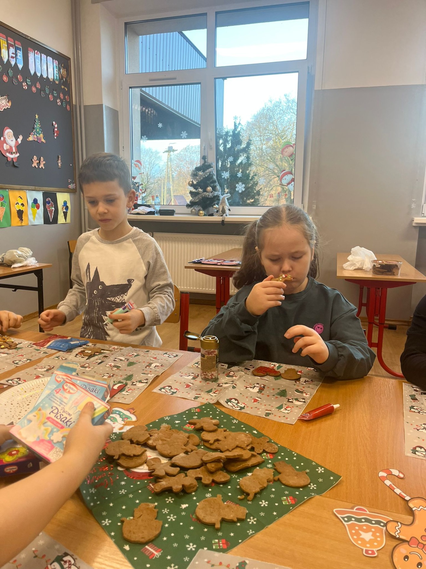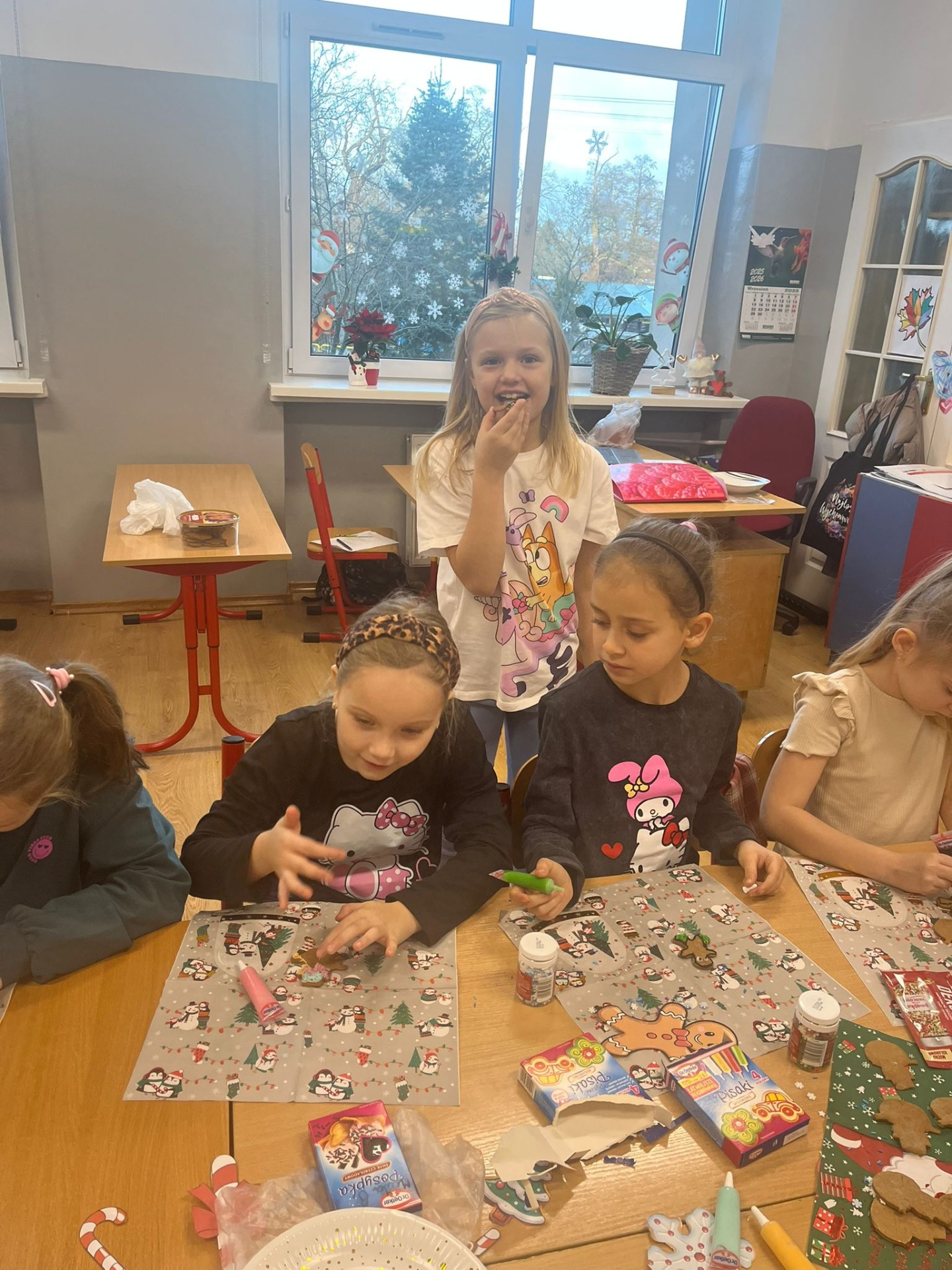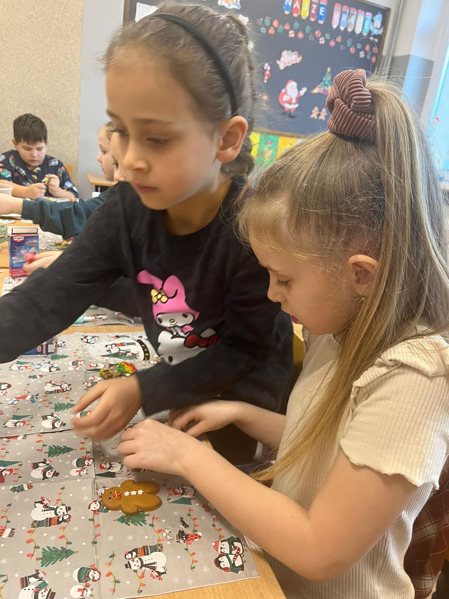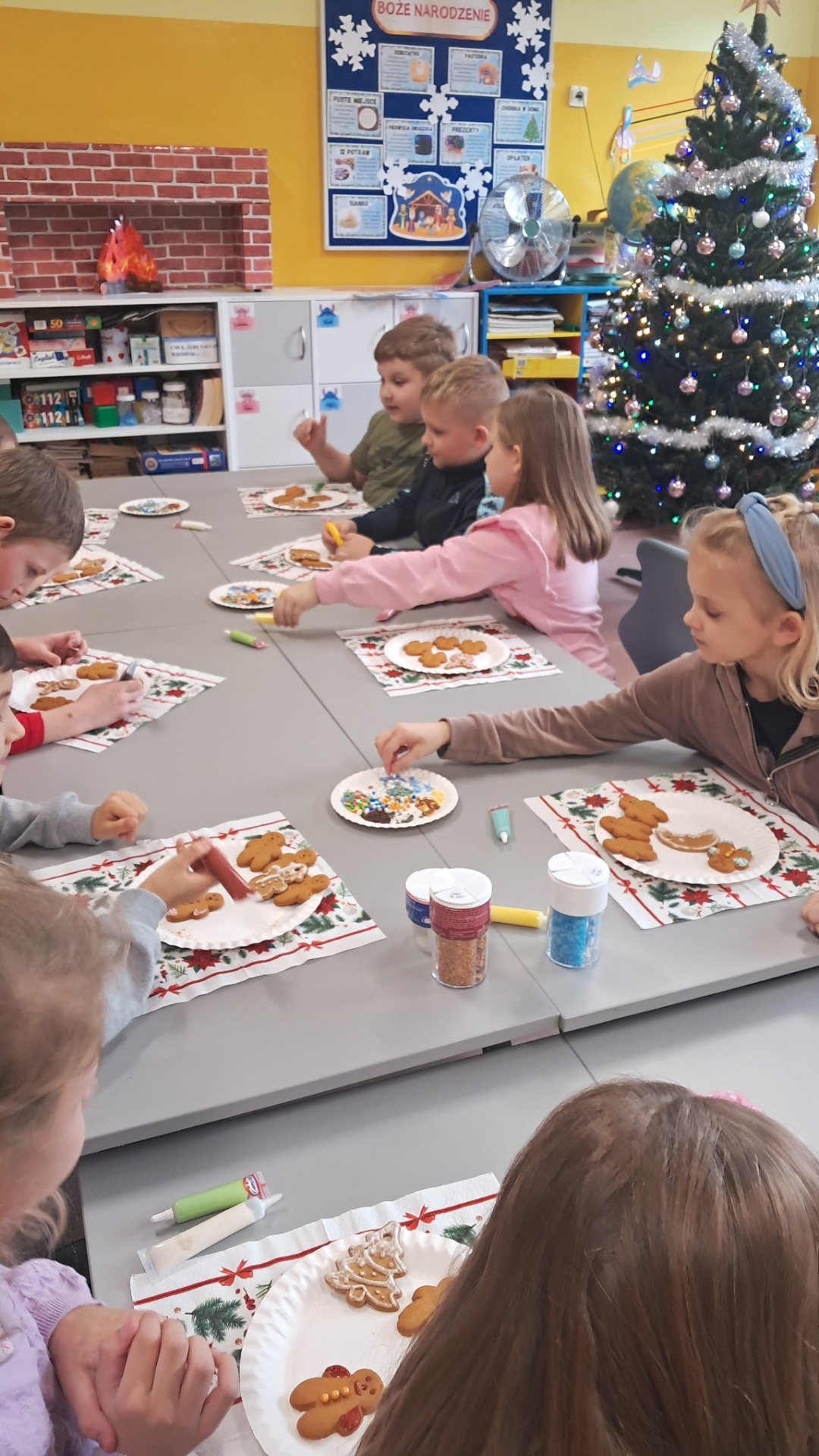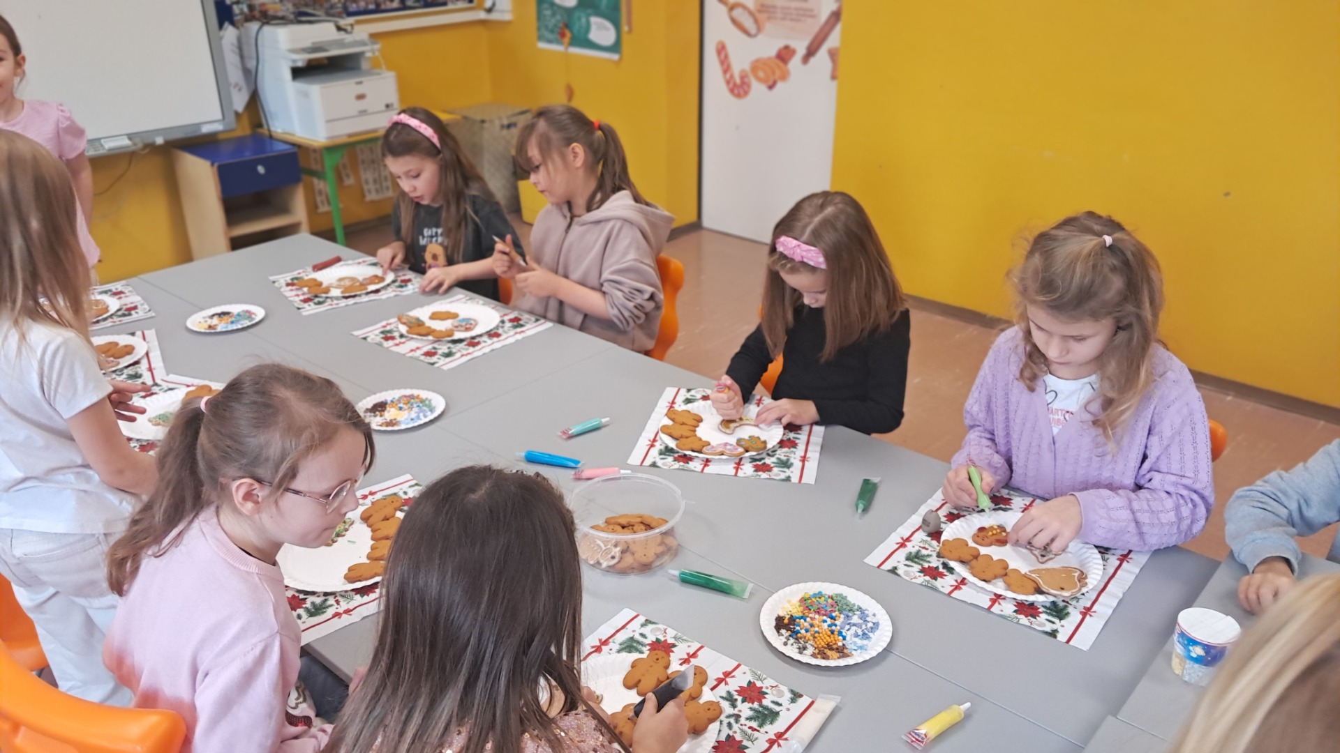 Przedświąteczny czas każdemu kojarzy się z pieczeniem i dekorowaniem pierników oraz wspólnym kolędowaniem. Zgodnie z tradycją w klasach Ia i Ib dzieci zebrały się, aby w swoim gronie udekorować świateczne pierniczki. Na stołach pojawiły się kolorowe pisaki z lukrem, posypki, które pomogły w dekorowaniu. Zdobienie okazało się nie tylko twórczym wyzwaniem, ale także świetną okazją do integracji i wspólnego spędzania czasu w duchu zbliżających się świąt.