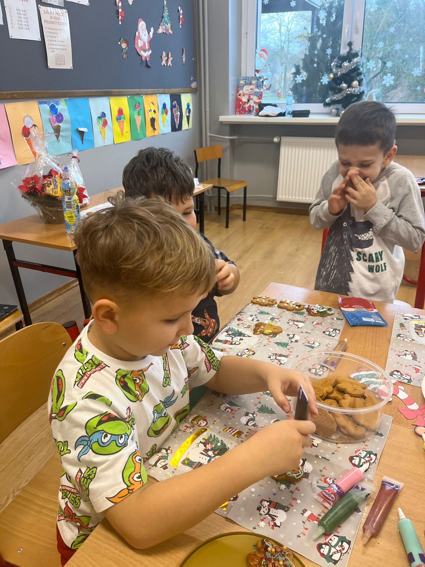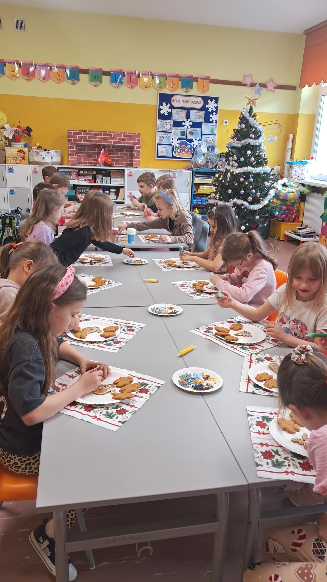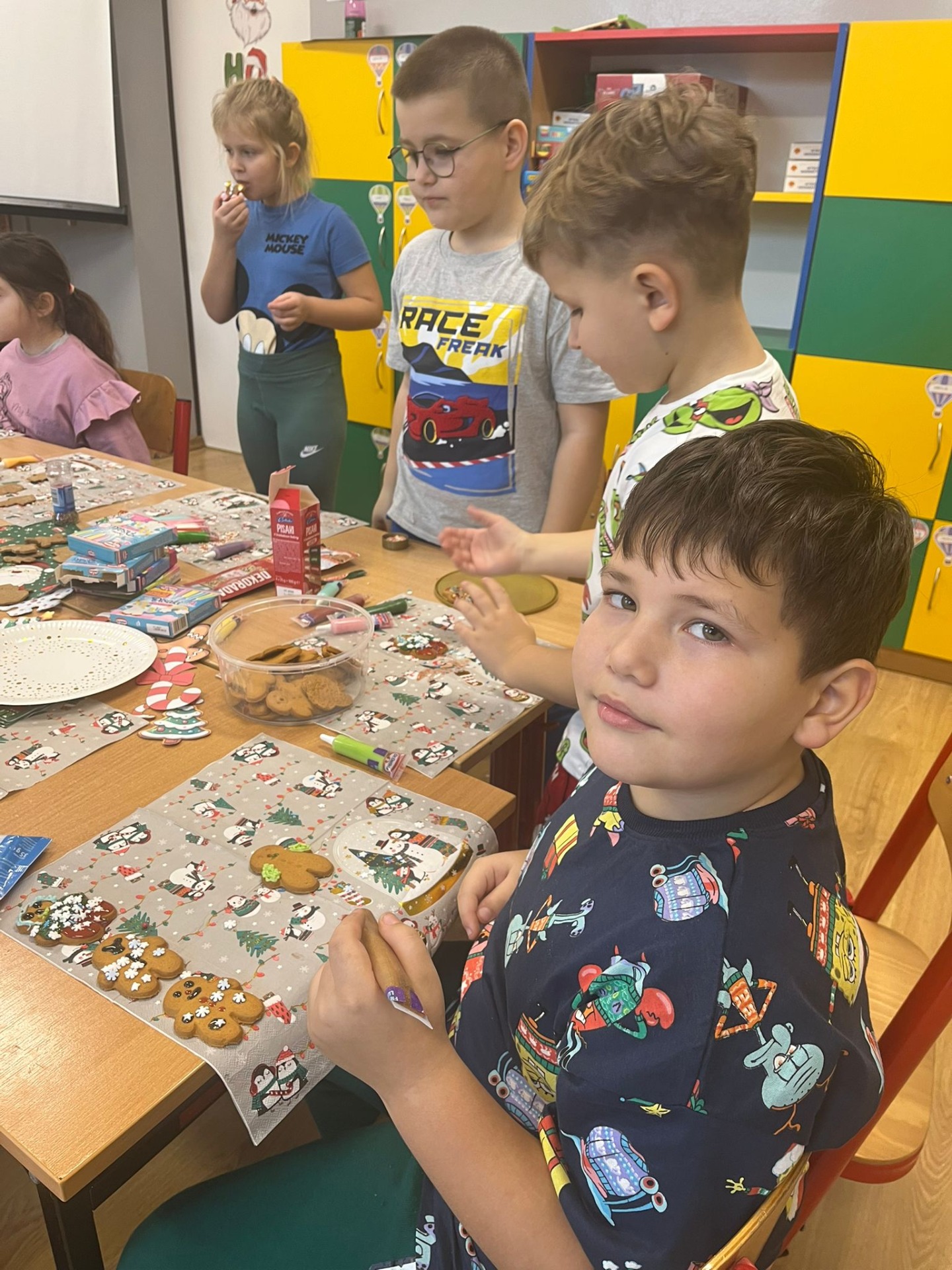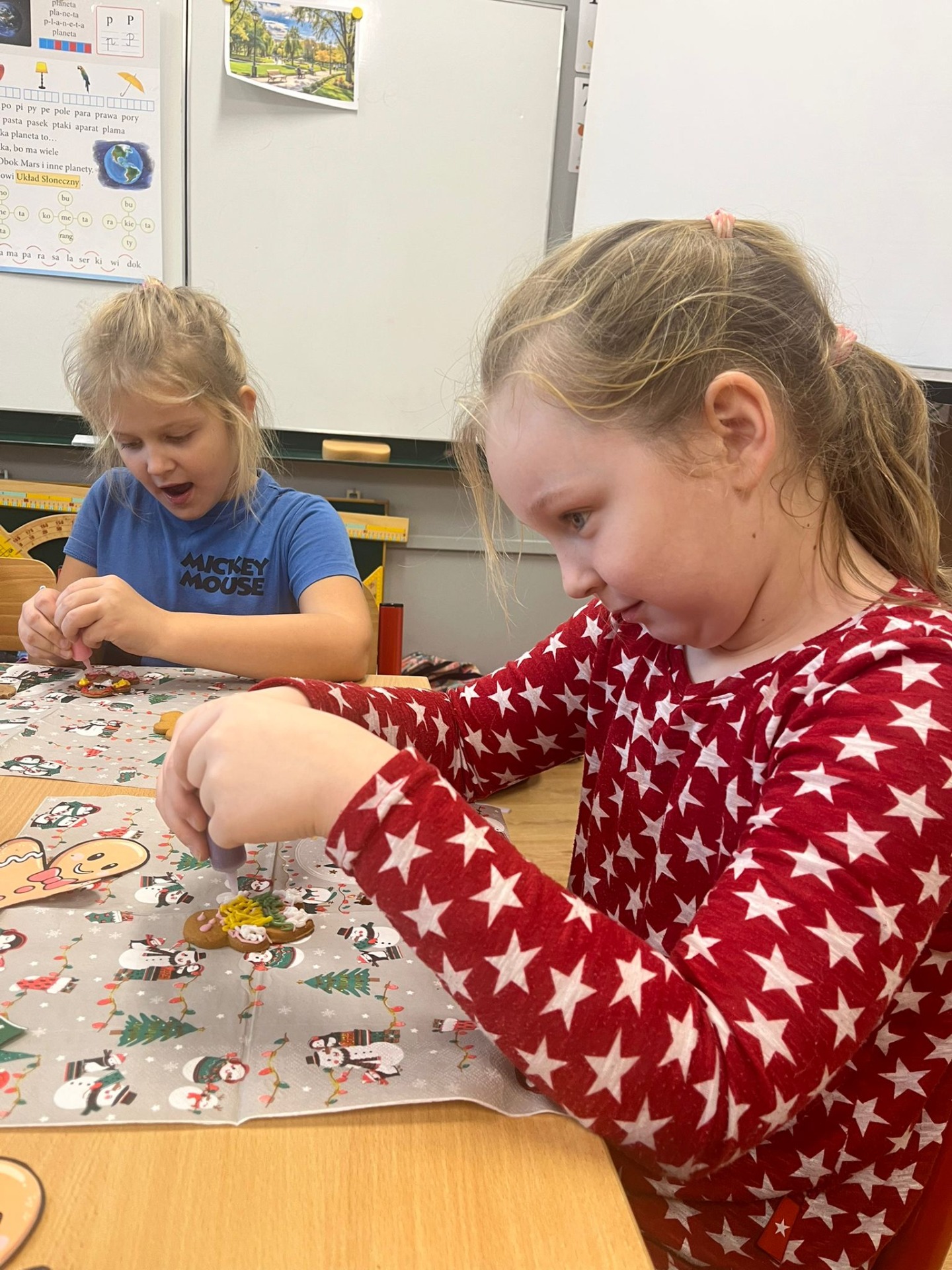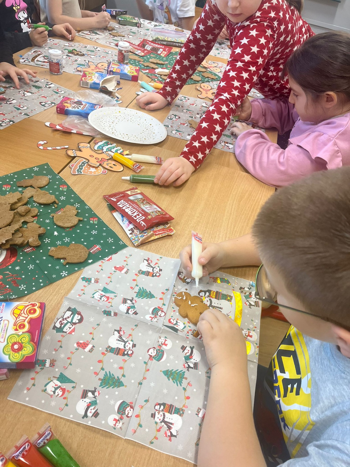 Przedświąteczny czas każdemu kojarzy się z pieczeniem i dekorowaniem pierników oraz wspólnym kolędowaniem. Zgodnie z tradycją w klasach Ia i Ib dzieci zebrały się, aby w swoim gronie udekorować świateczne pierniczki. Na stołach pojawiły się kolorowe pisaki z lukrem, posypki, które pomogły w dekorowaniu. Zdobienie okazało się nie tylko twórczym wyzwaniem, ale także świetną okazją do integracji i wspólnego spędzania czasu w duchu zbliżających się świąt.
