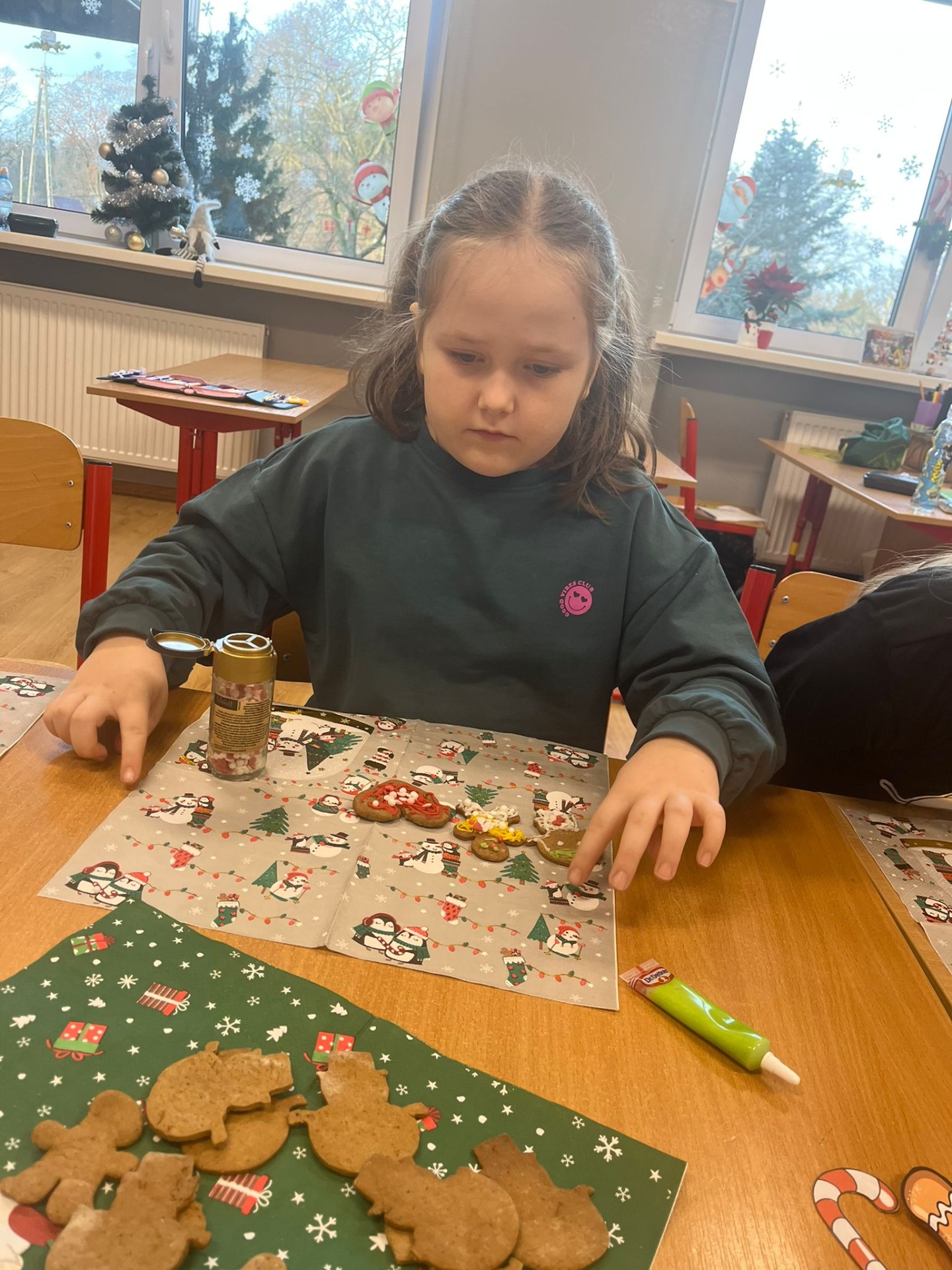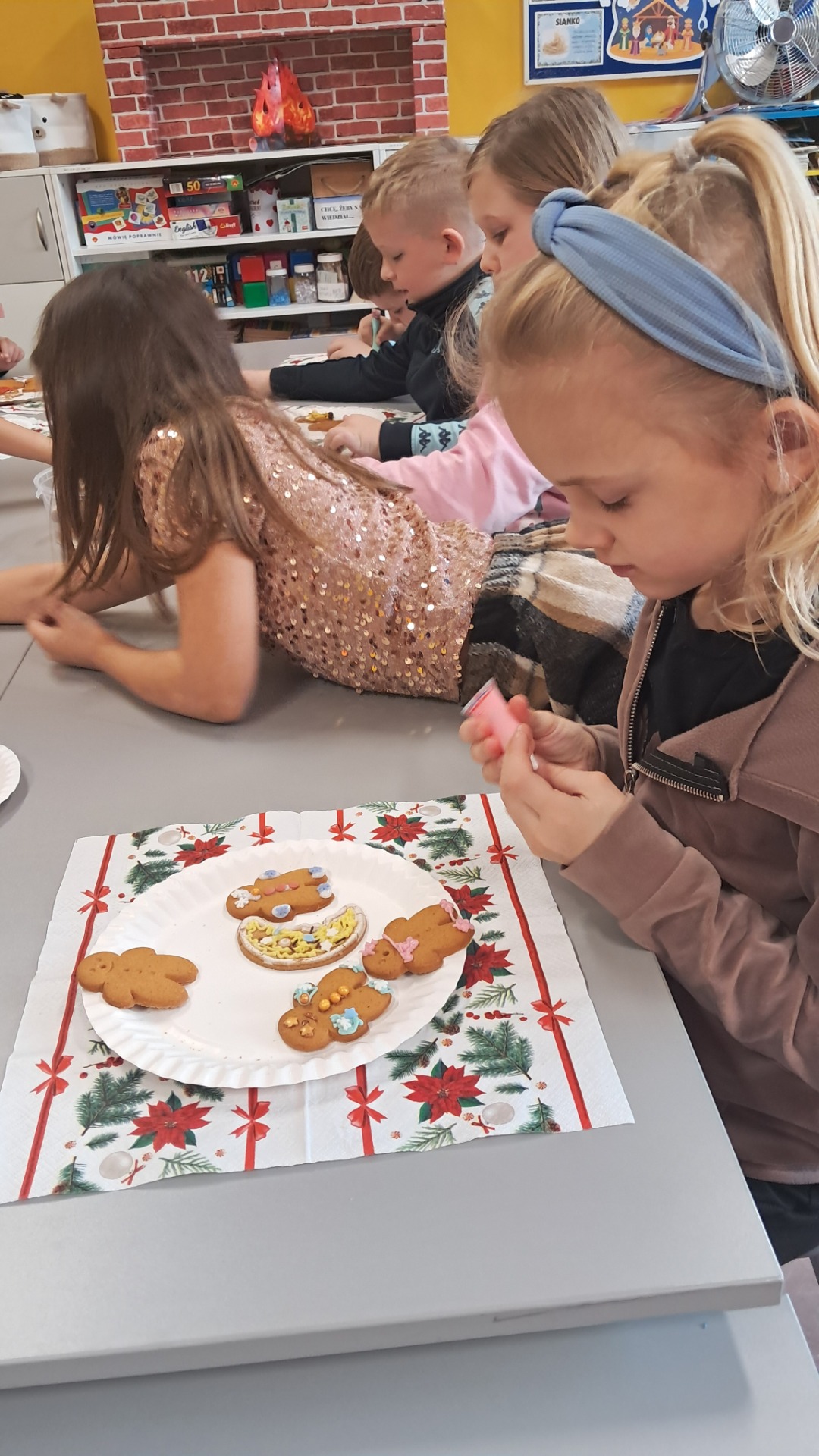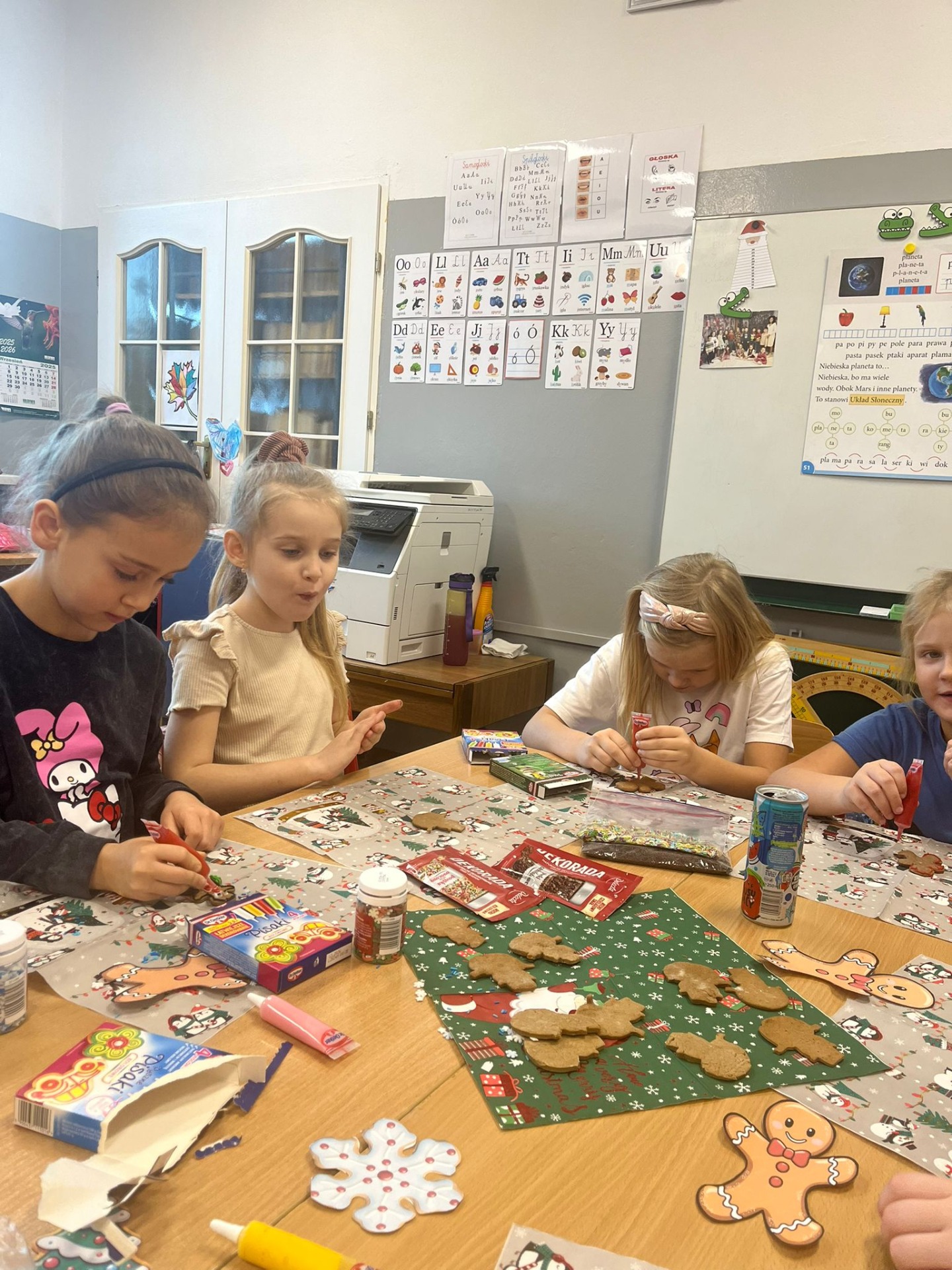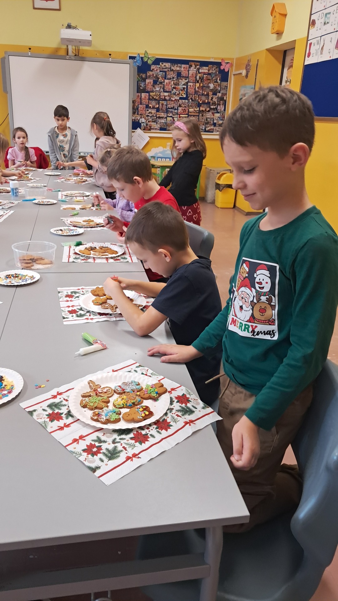 Przedświąteczny czas każdemu kojarzy się z pieczeniem i dekorowaniem pierników oraz wspólnym kolędowaniem. Zgodnie z tradycją w klasach Ia i Ib dzieci zebrały się, aby w swoim gronie udekorować świateczne pierniczki. Na stołach pojawiły się kolorowe pisaki z lukrem, posypki, które pomogły w dekorowaniu. Zdobienie okazało się nie tylko twórczym wyzwaniem, ale także świetną okazją do integracji i wspólnego spędzania czasu w duchu zbliżających się świąt.