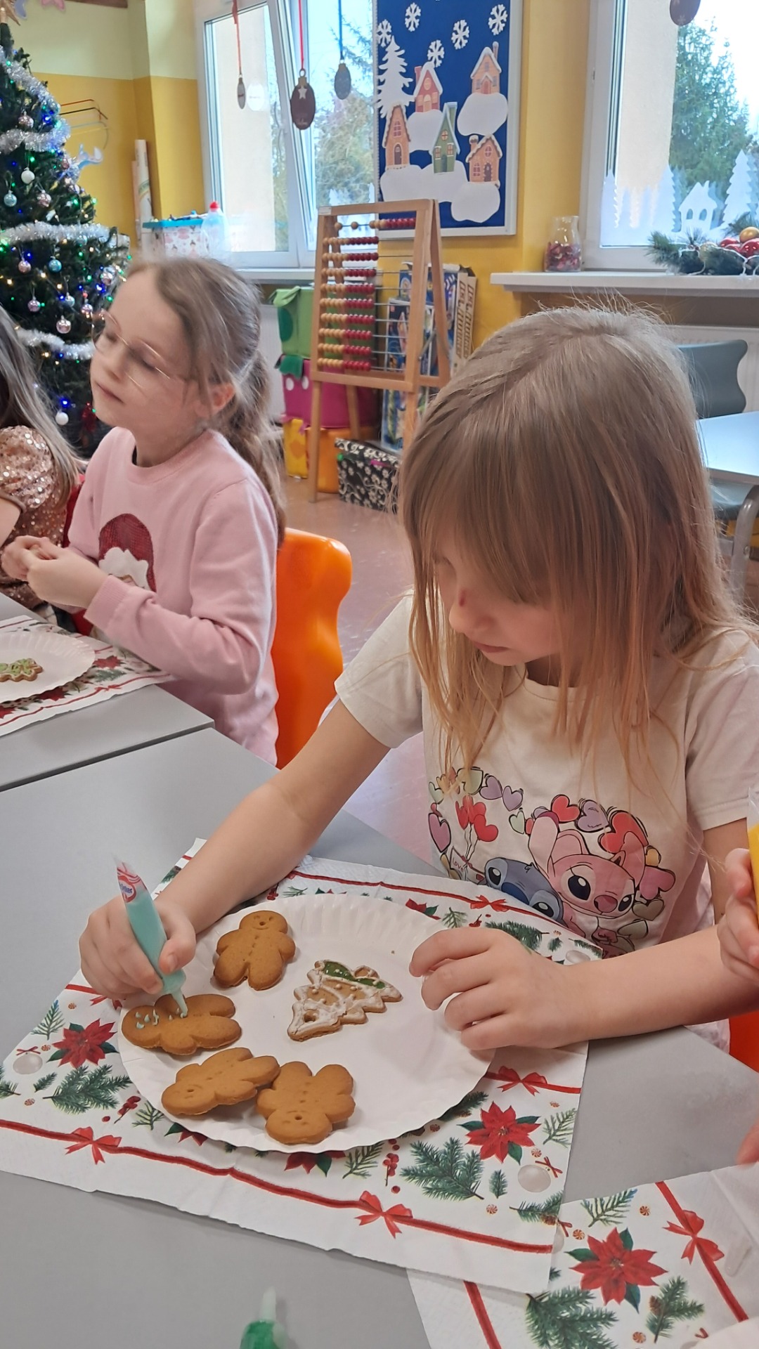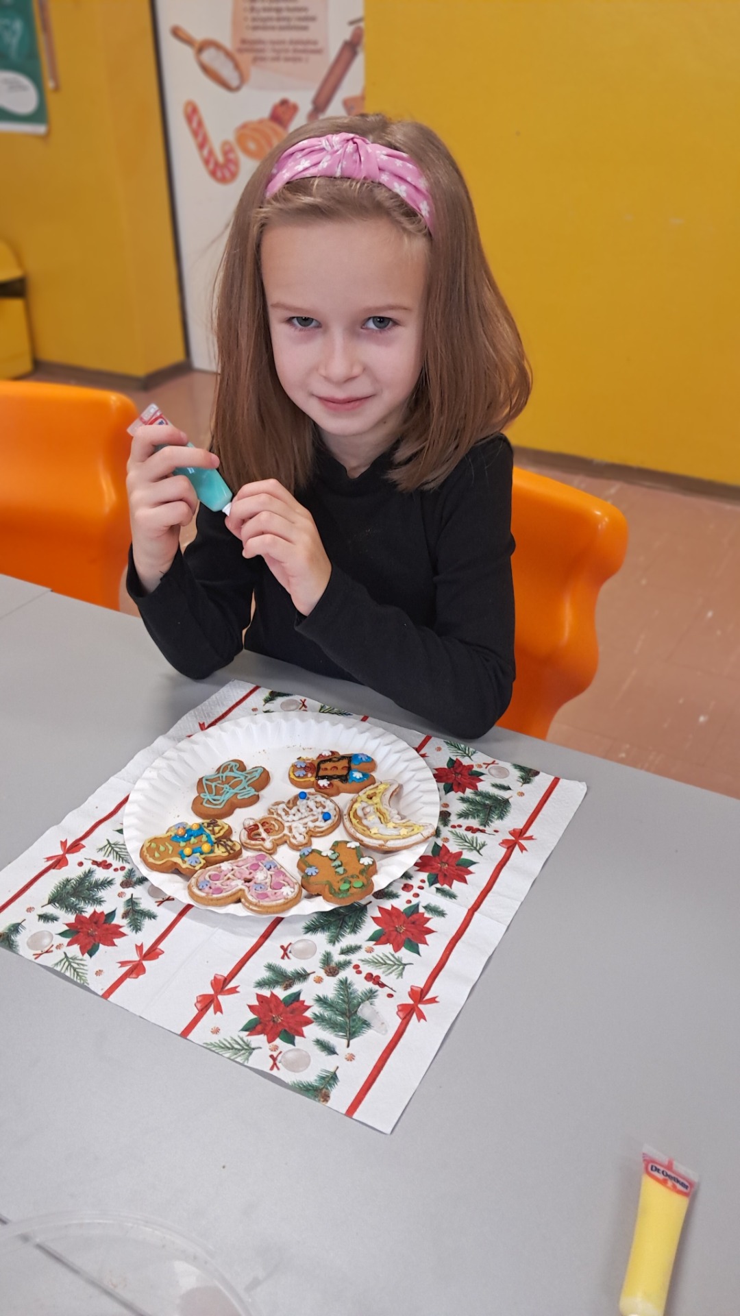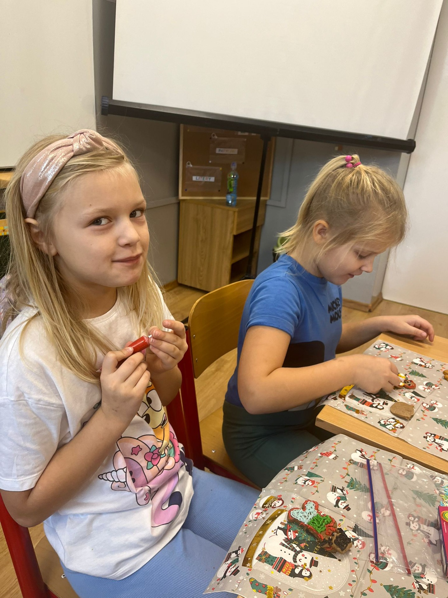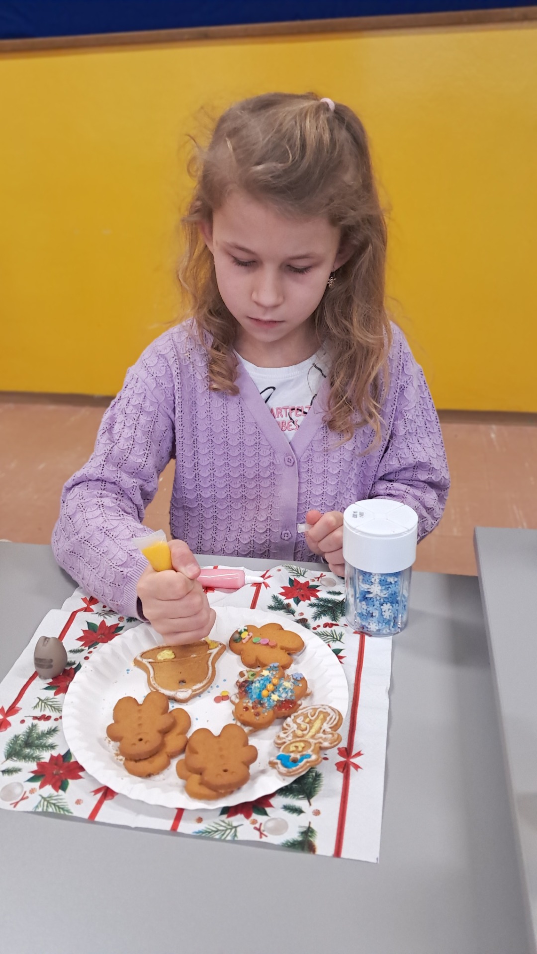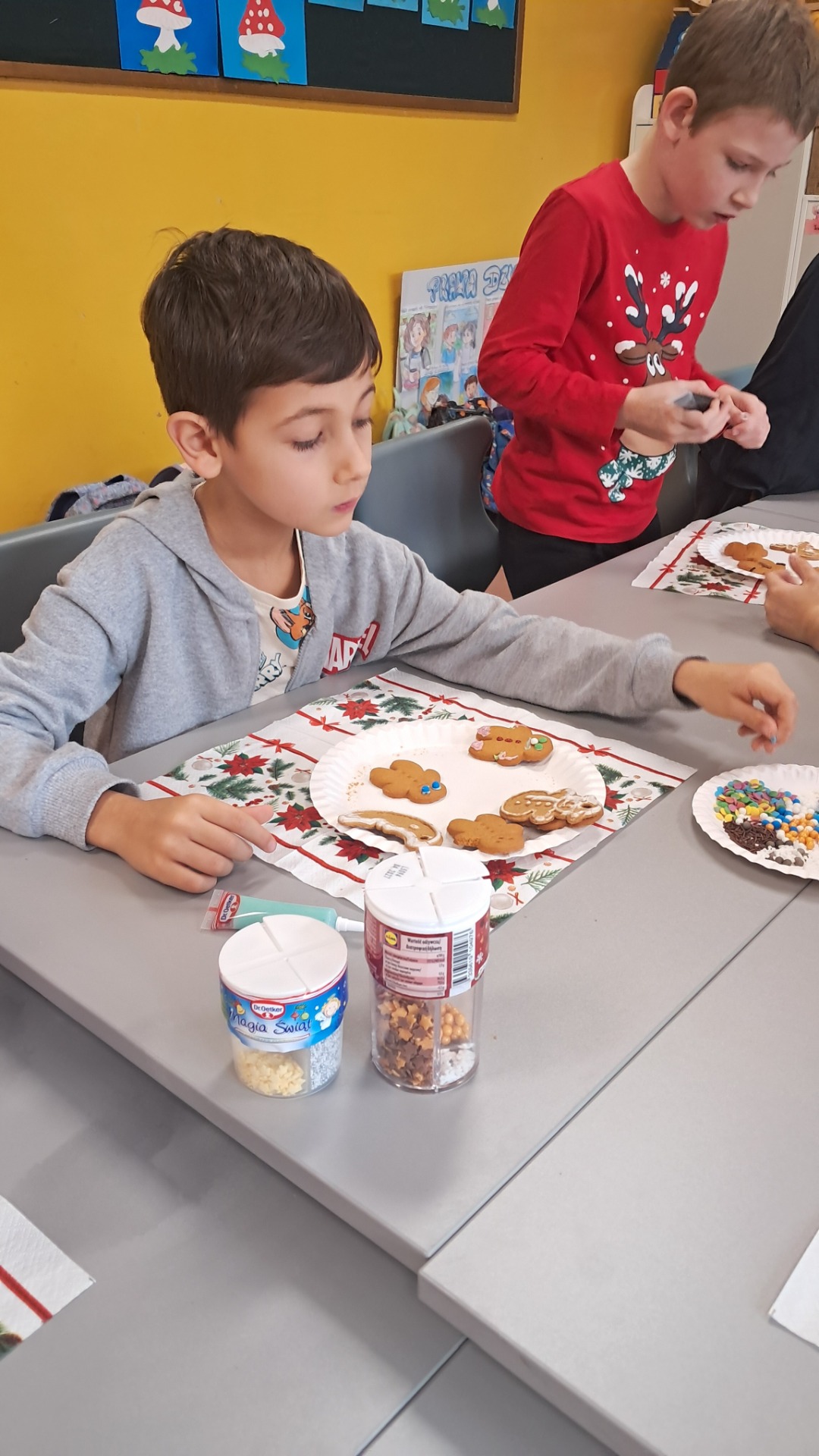 Przedświąteczny czas każdemu kojarzy się z pieczeniem i dekorowaniem pierników oraz wspólnym kolędowaniem. Zgodnie z tradycją w klasach Ia i Ib dzieci zebrały się, aby w swoim gronie udekorować świateczne pierniczki. Na stołach pojawiły się kolorowe pisaki z lukrem, posypki, które pomogły w dekorowaniu. Zdobienie okazało się nie tylko twórczym wyzwaniem, ale także świetną okazją do integracji i wspólnego spędzania czasu w duchu zbliżających się świąt.