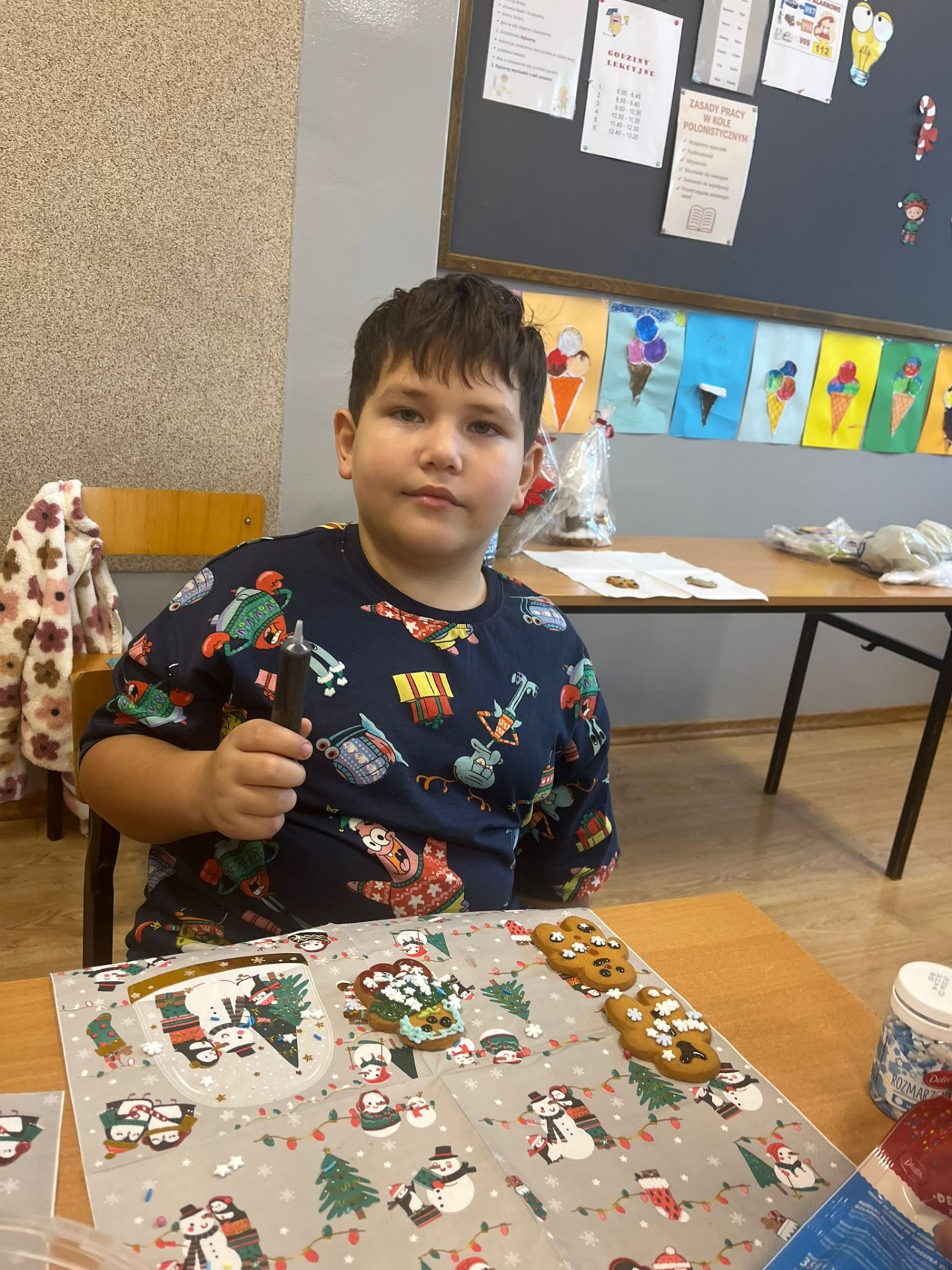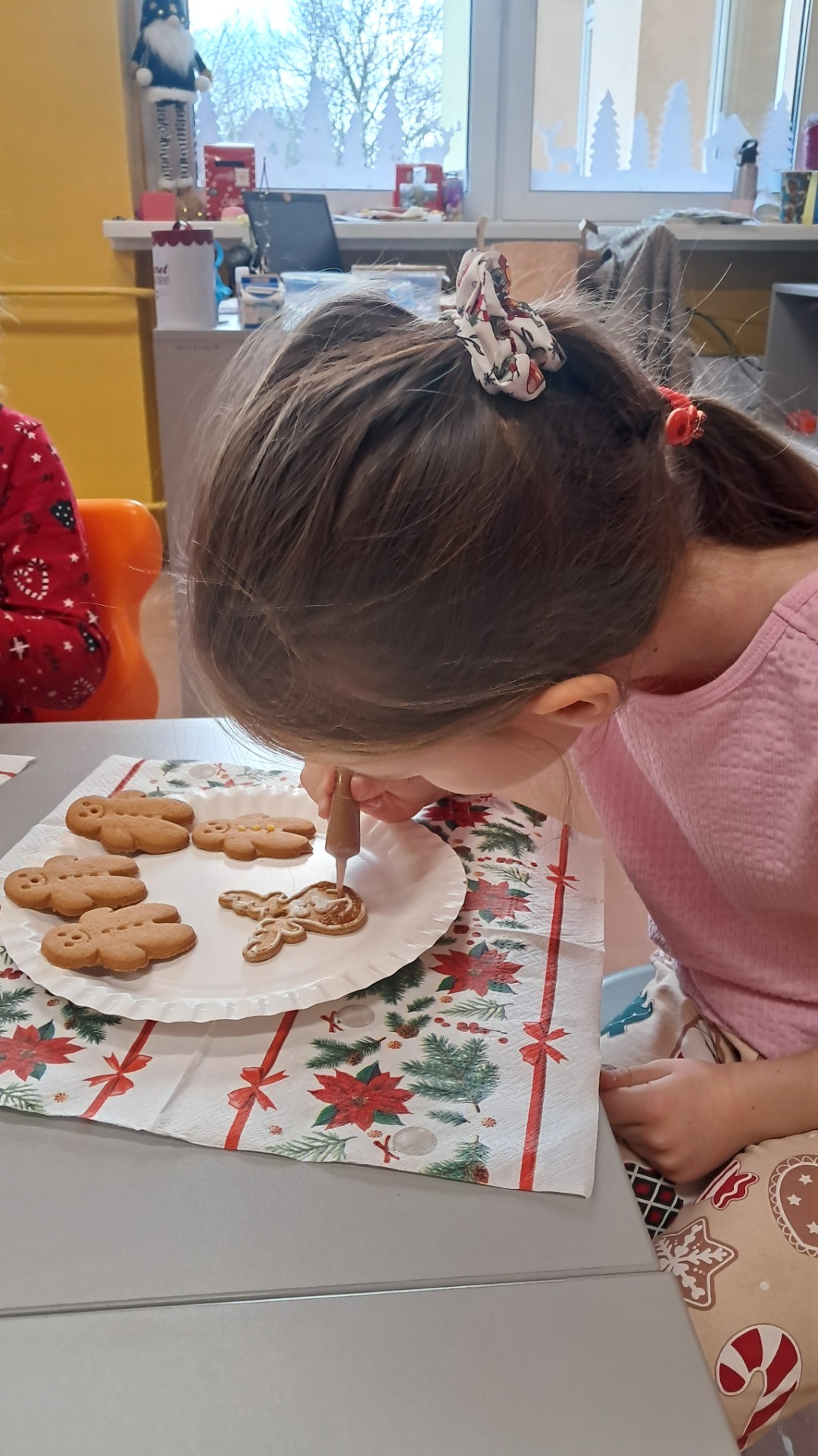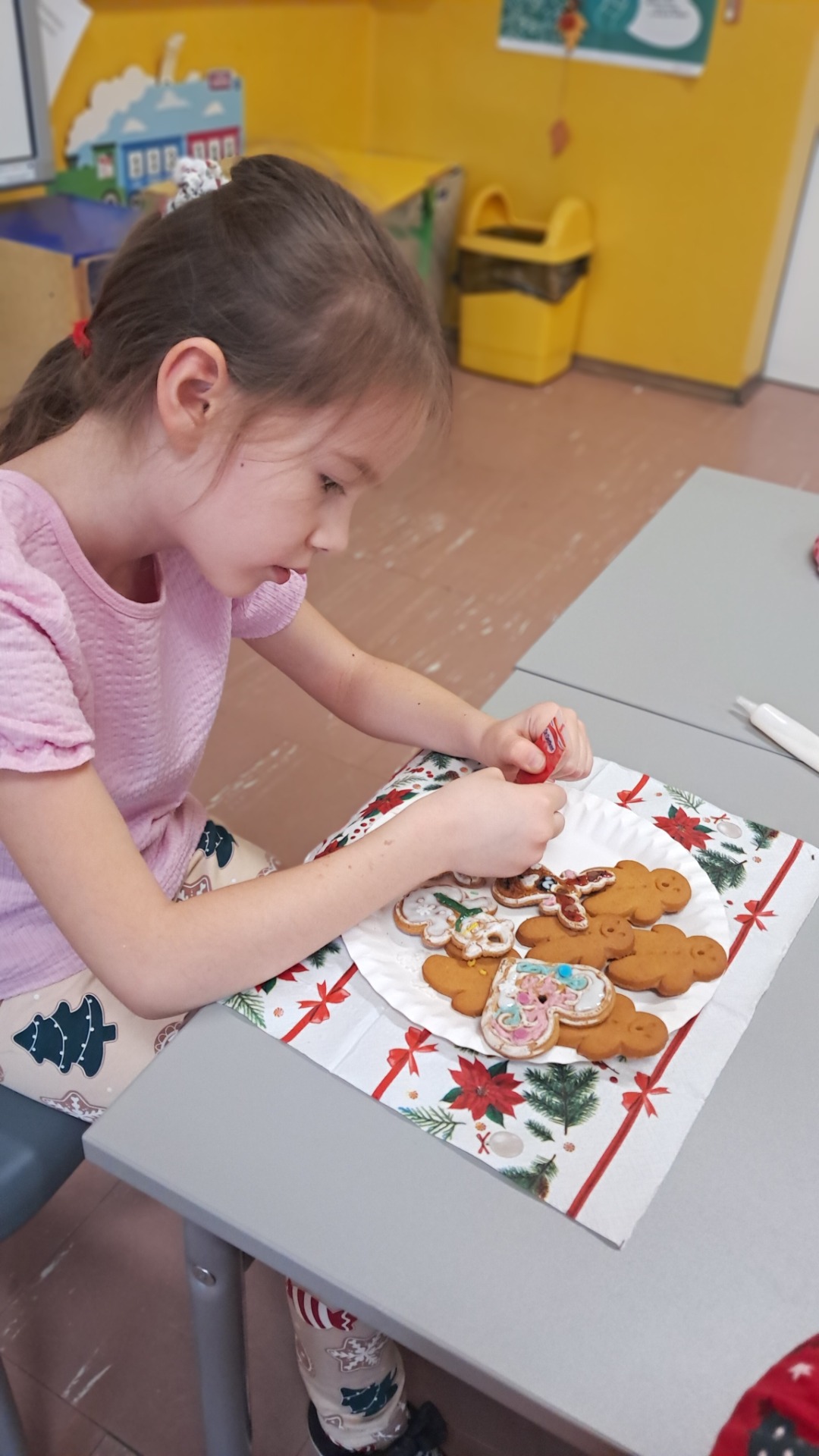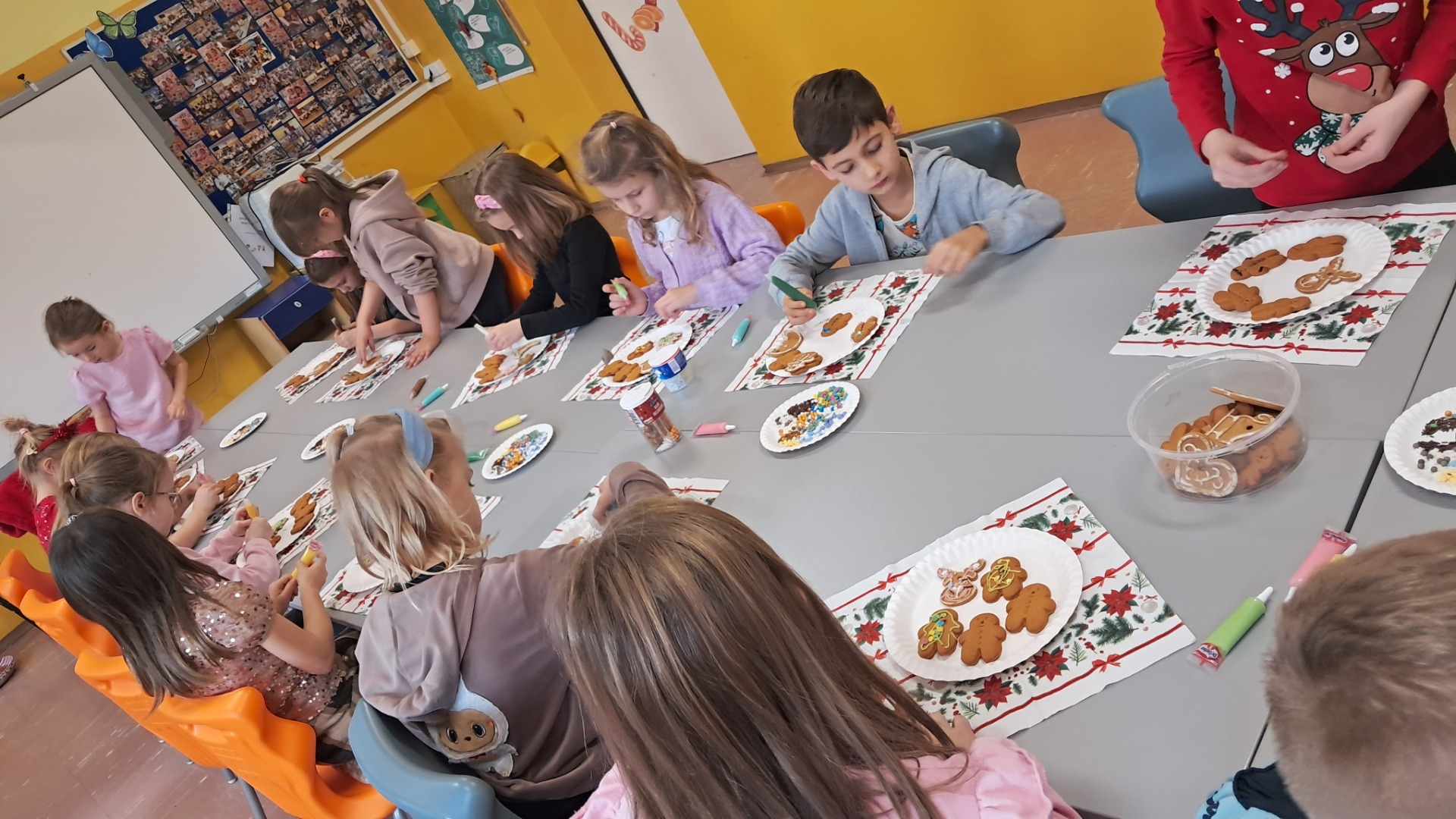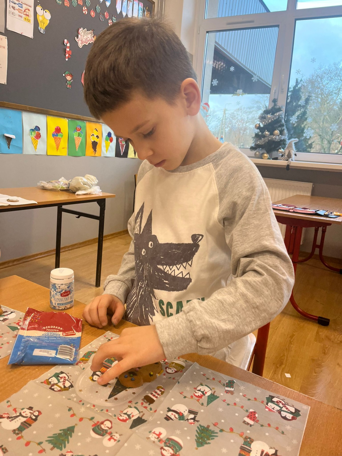 Przedświąteczny czas każdemu kojarzy się z pieczeniem i dekorowaniem pierników oraz wspólnym kolędowaniem. Zgodnie z tradycją w klasach Ia i Ib dzieci zebrały się, aby w swoim gronie udekorować świateczne pierniczki. Na stołach pojawiły się kolorowe pisaki z lukrem, posypki, które pomogły w dekorowaniu. Zdobienie okazało się nie tylko twórczym wyzwaniem, ale także świetną okazją do integracji i wspólnego spędzania czasu w duchu zbliżających się świąt.