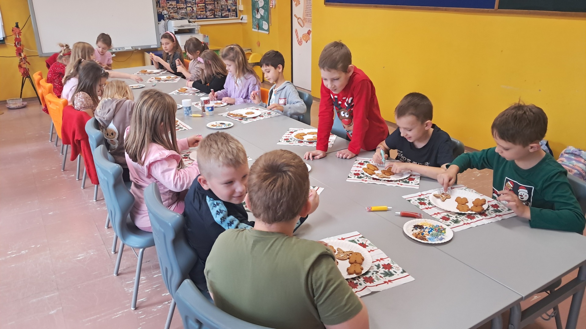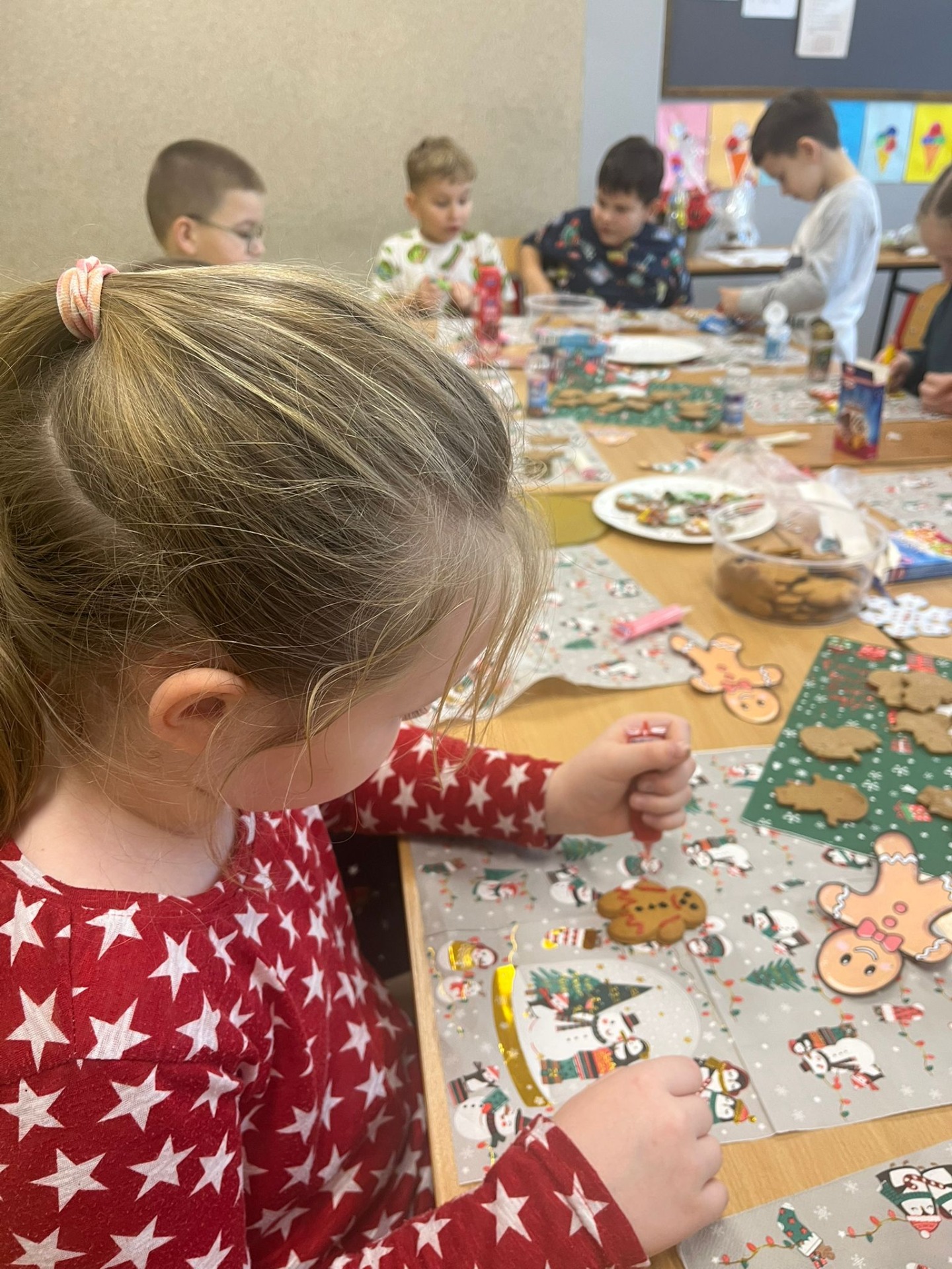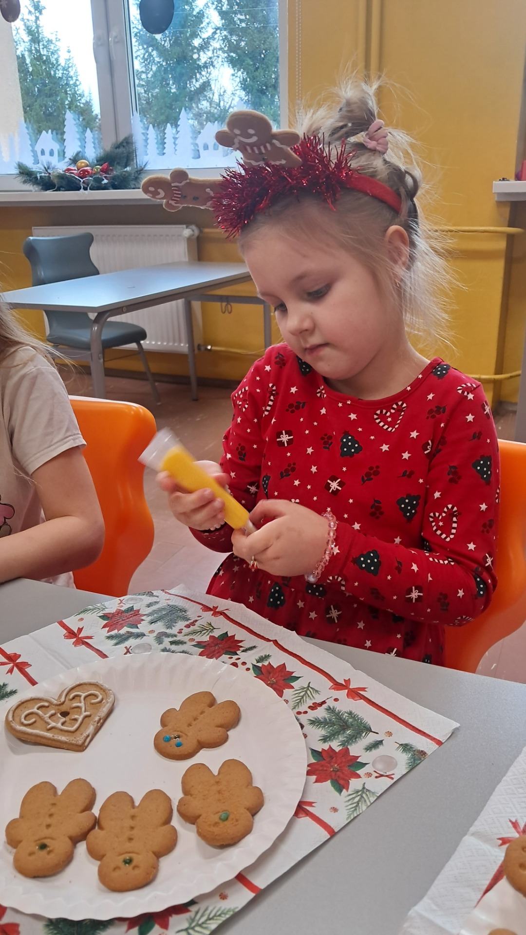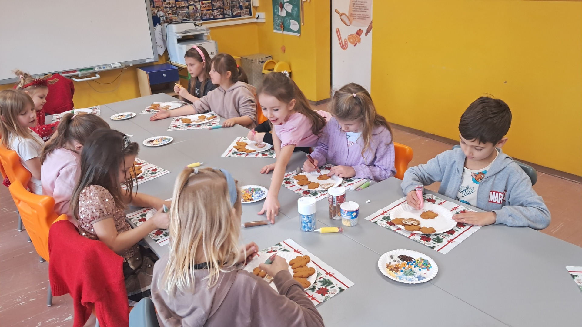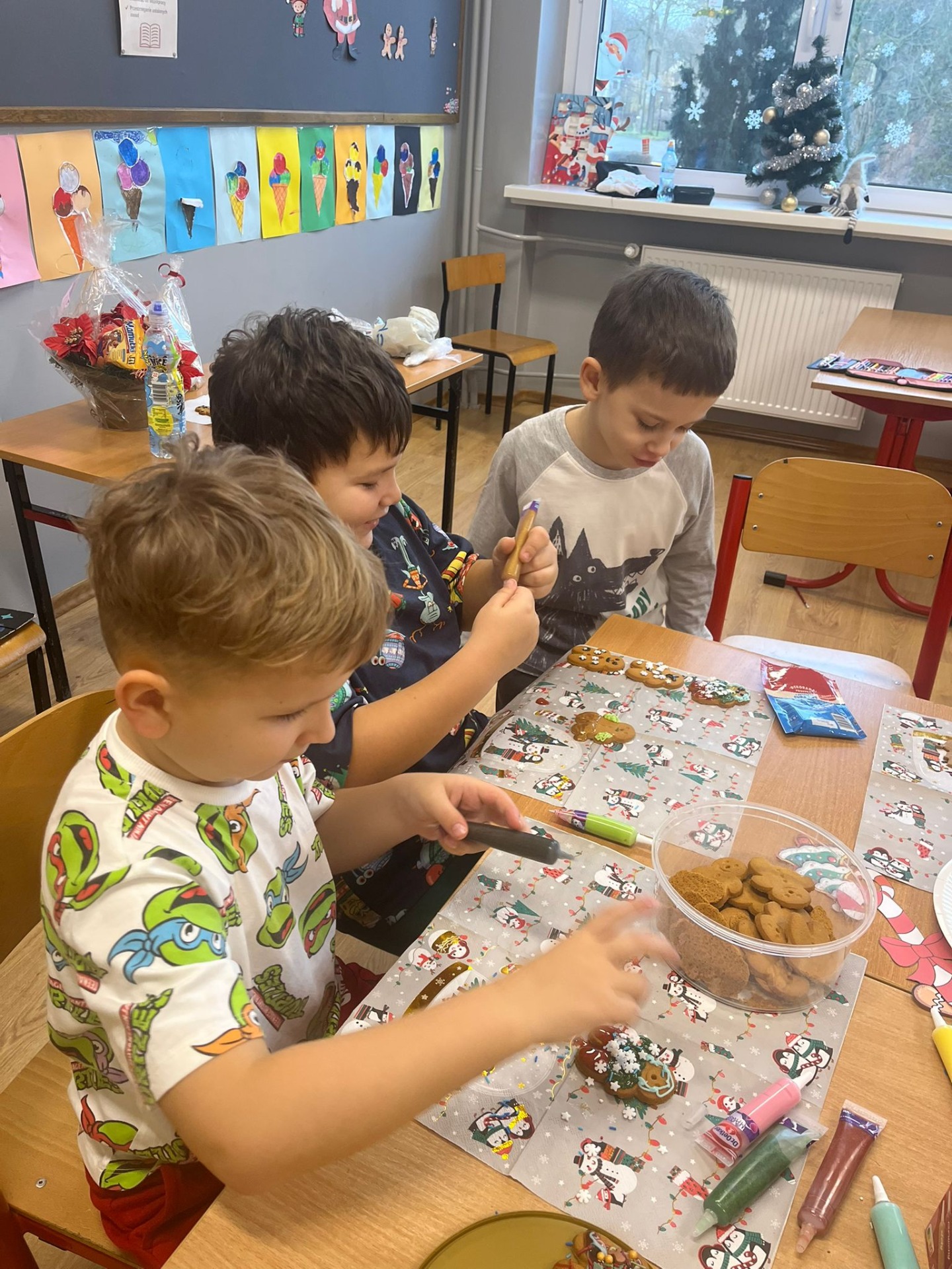 Przedświąteczny czas każdemu kojarzy się z pieczeniem i dekorowaniem pierników oraz wspólnym kolędowaniem. Zgodnie z tradycją w klasach Ia i Ib dzieci zebrały się, aby w swoim gronie udekorować świateczne pierniczki. Na stołach pojawiły się kolorowe pisaki z lukrem, posypki, które pomogły w dekorowaniu. Zdobienie okazało się nie tylko twórczym wyzwaniem, ale także świetną okazją do integracji i wspólnego spędzania czasu w duchu zbliżających się świąt.