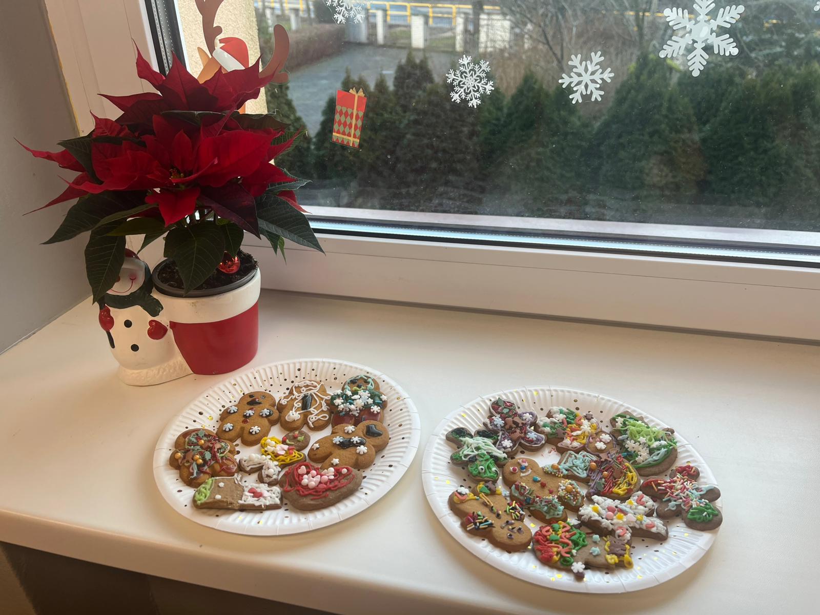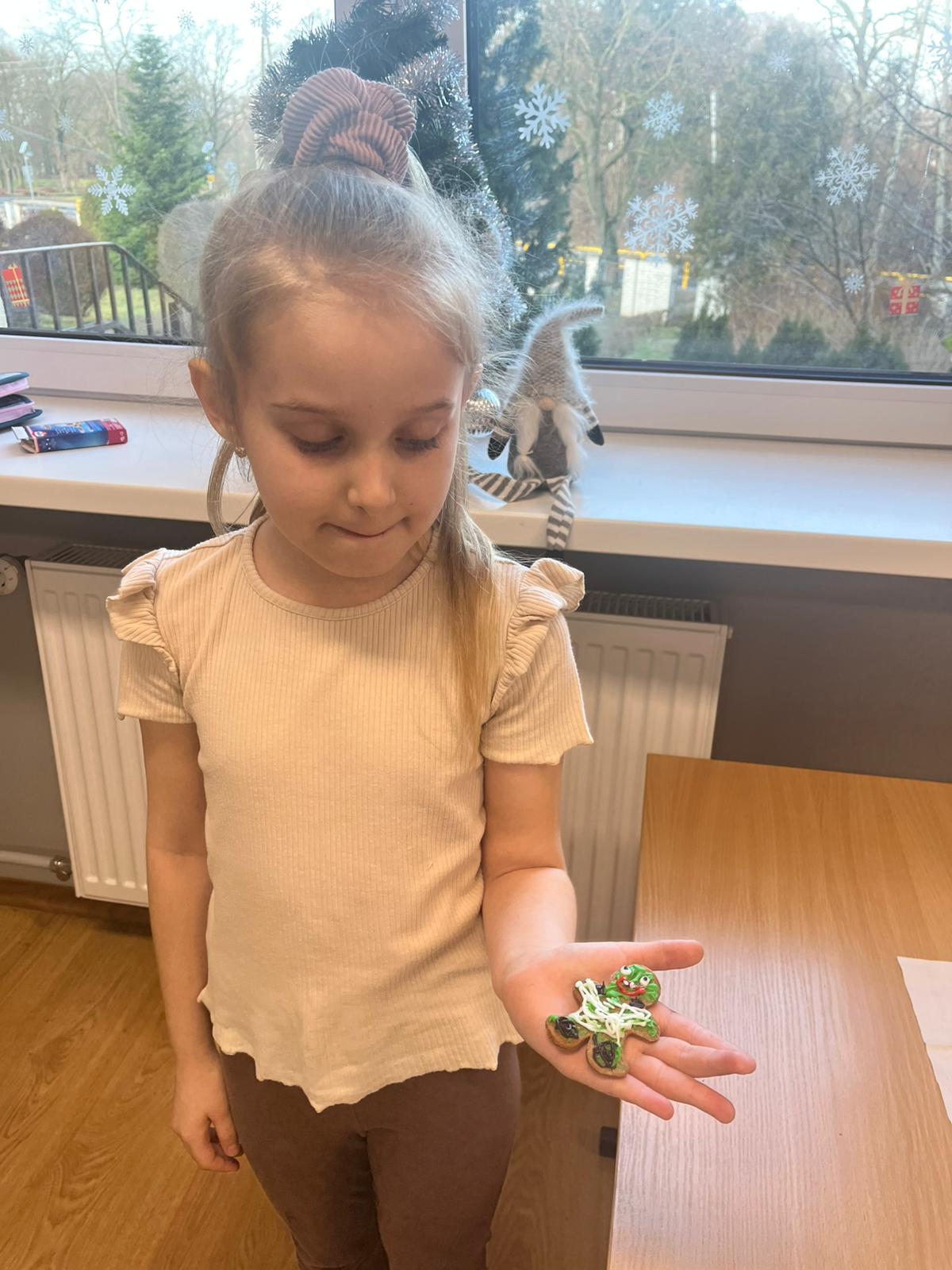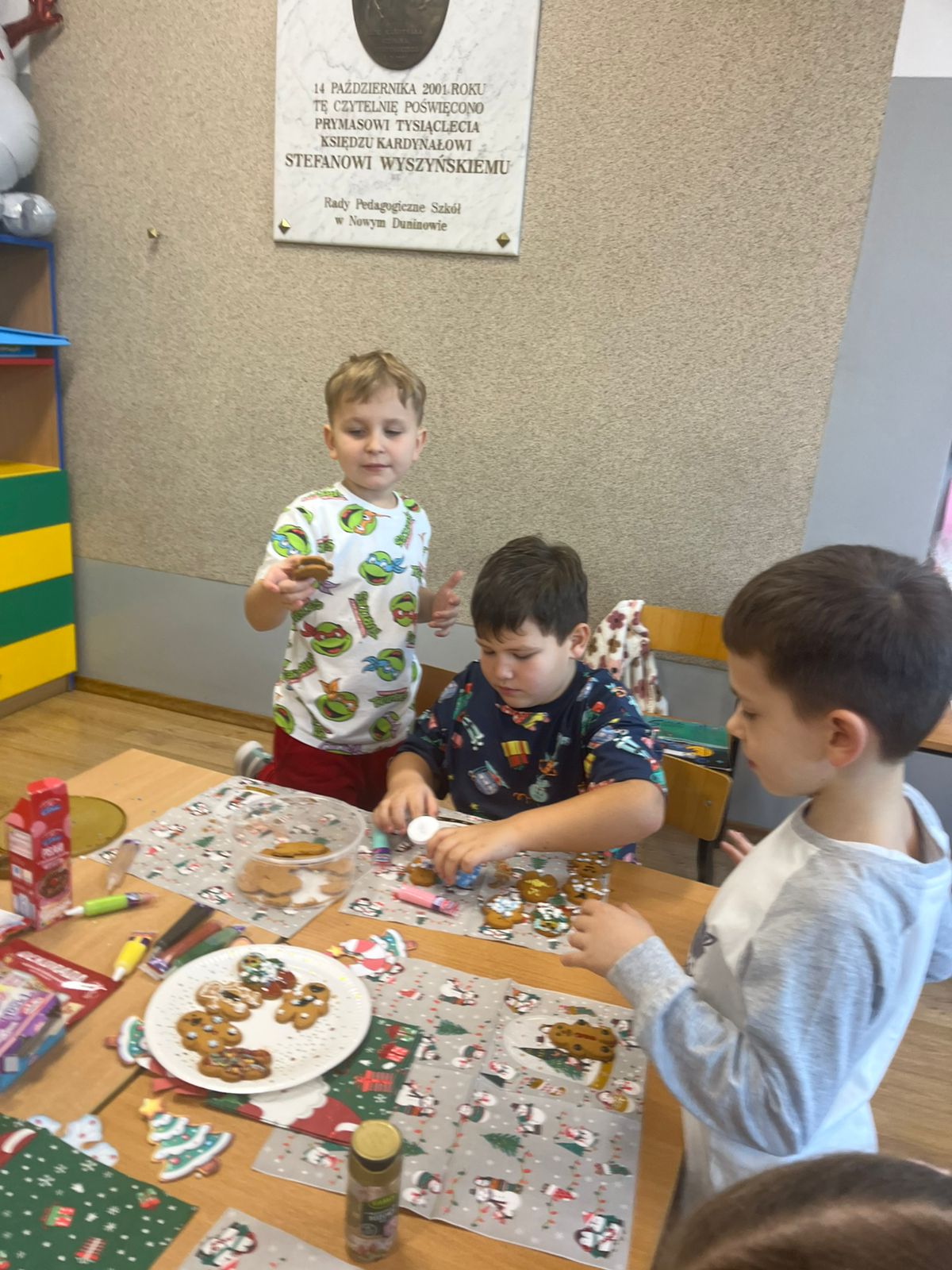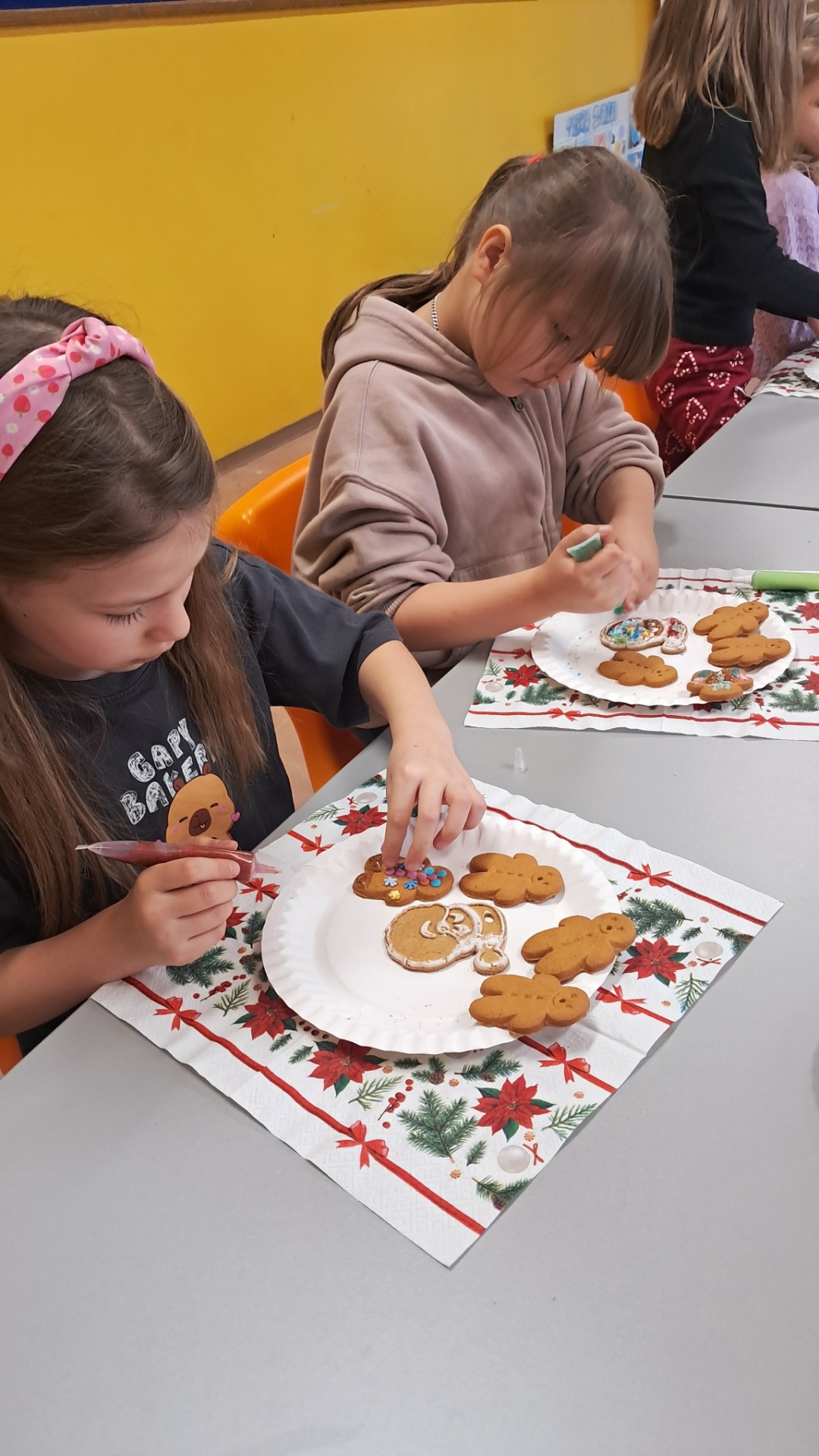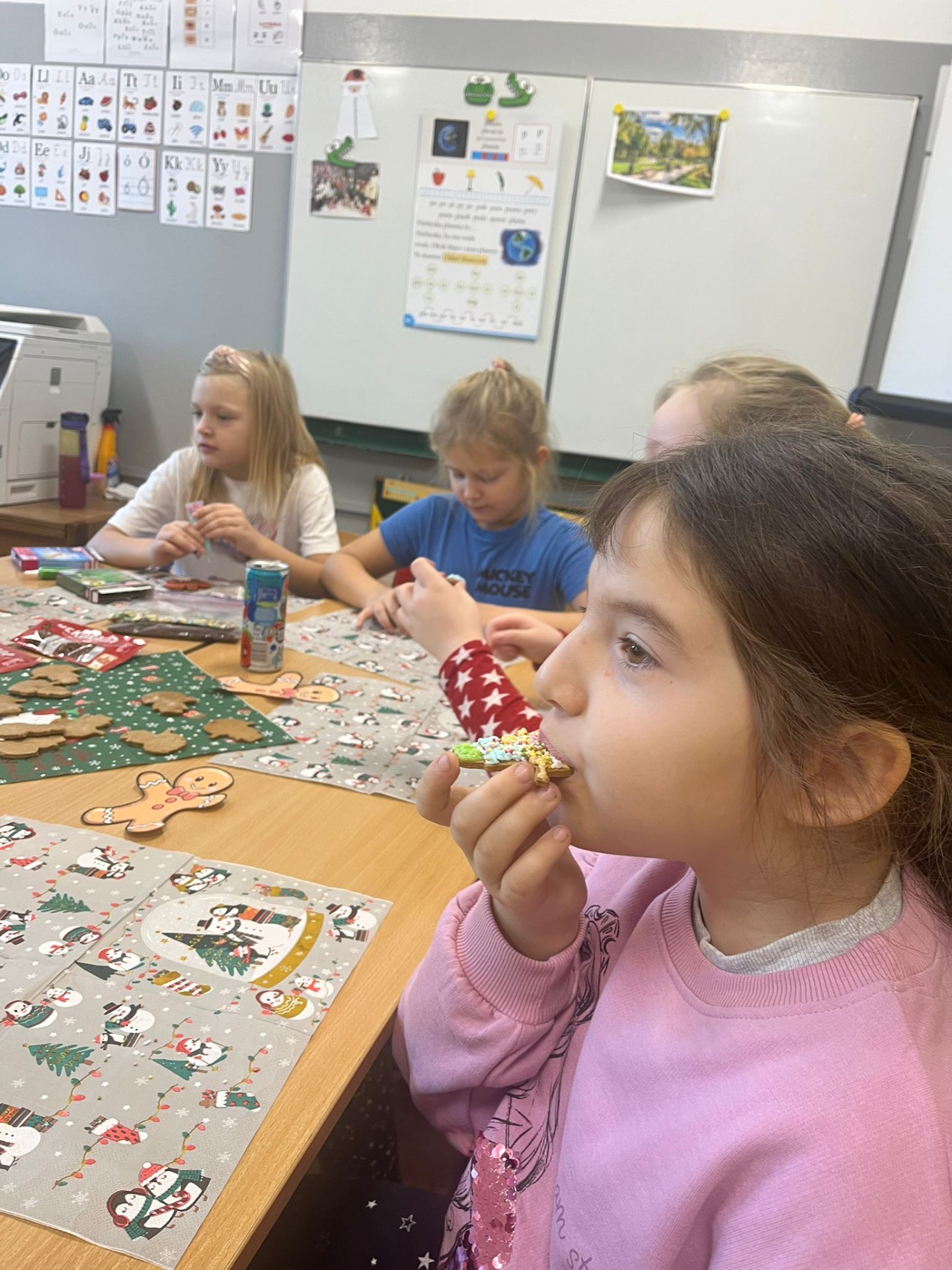 Przedświąteczny czas każdemu kojarzy się z pieczeniem i dekorowaniem pierników oraz wspólnym kolędowaniem. Zgodnie z tradycją w klasach Ia i Ib dzieci zebrały się, aby w swoim gronie udekorować świateczne pierniczki. Na stołach pojawiły się kolorowe pisaki z lukrem, posypki, które pomogły w dekorowaniu. Zdobienie okazało się nie tylko twórczym wyzwaniem, ale także świetną okazją do integracji i wspólnego spędzania czasu w duchu zbliżających się świąt.
