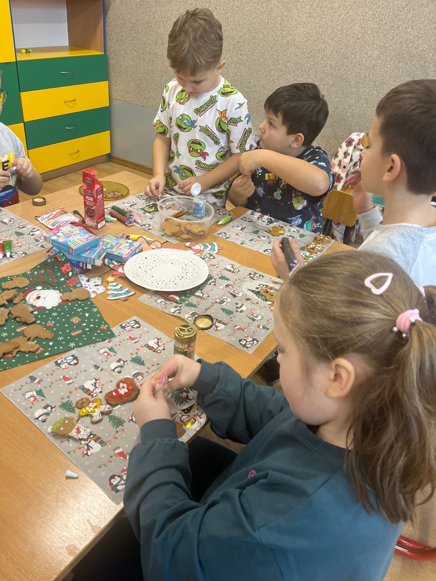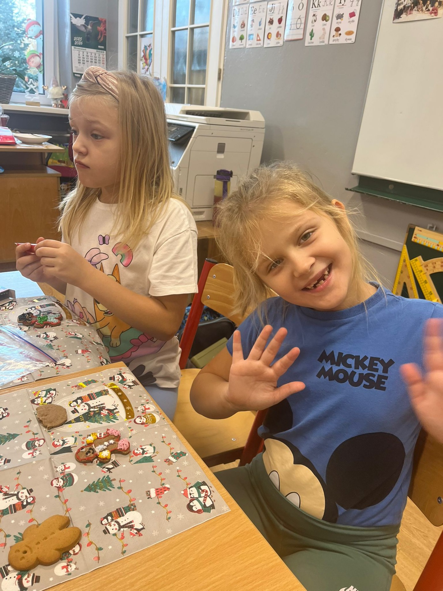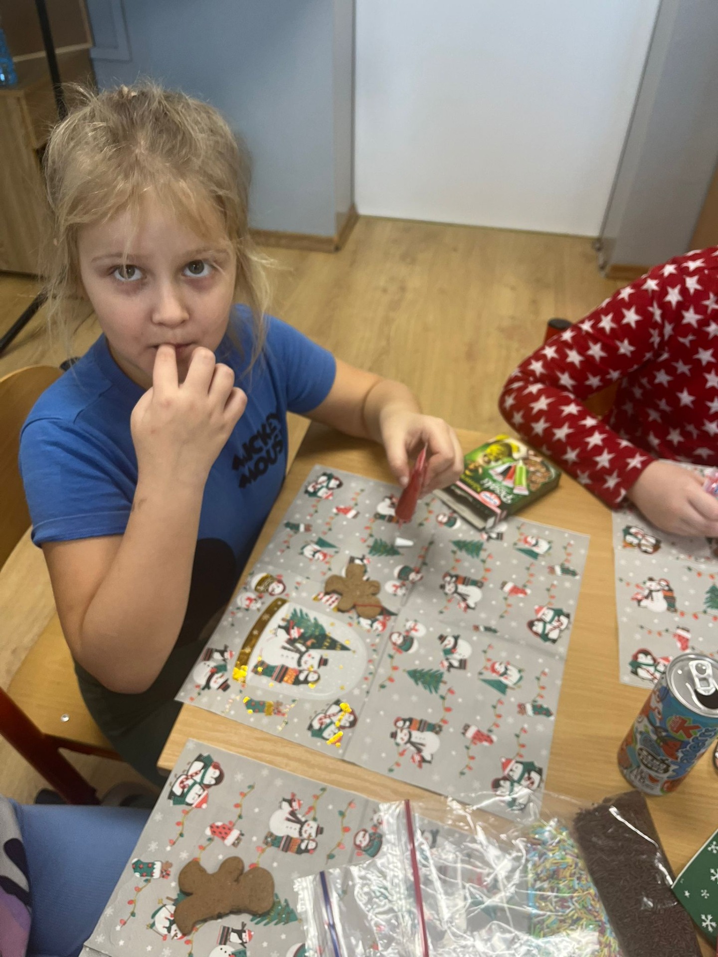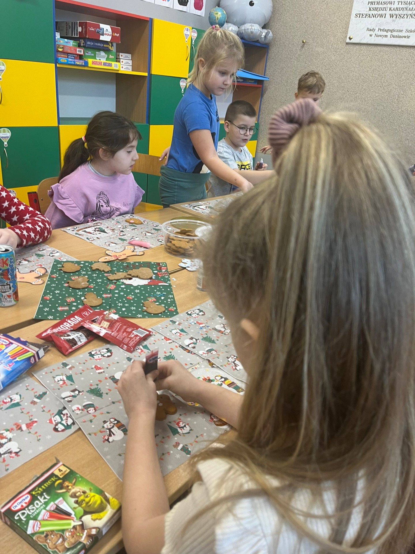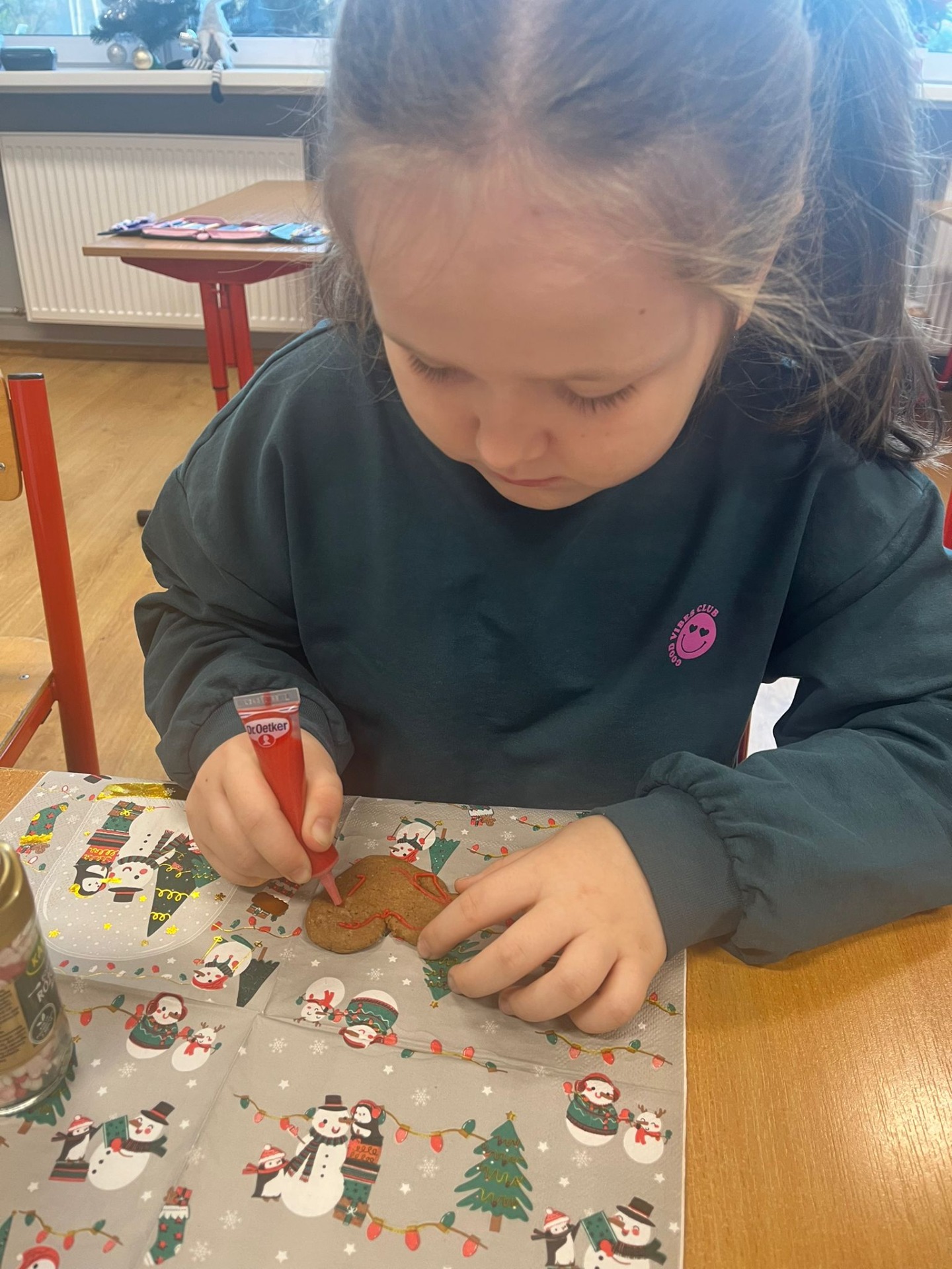 Przedświąteczny czas każdemu kojarzy się z pieczeniem i dekorowaniem pierników oraz wspólnym kolędowaniem. Zgodnie z tradycją w klasach Ia i Ib dzieci zebrały się, aby w swoim gronie udekorować świateczne pierniczki. Na stołach pojawiły się kolorowe pisaki z lukrem, posypki, które pomogły w dekorowaniu. Zdobienie okazało się nie tylko twórczym wyzwaniem, ale także świetną okazją do integracji i wspólnego spędzania czasu w duchu zbliżających się świąt.
