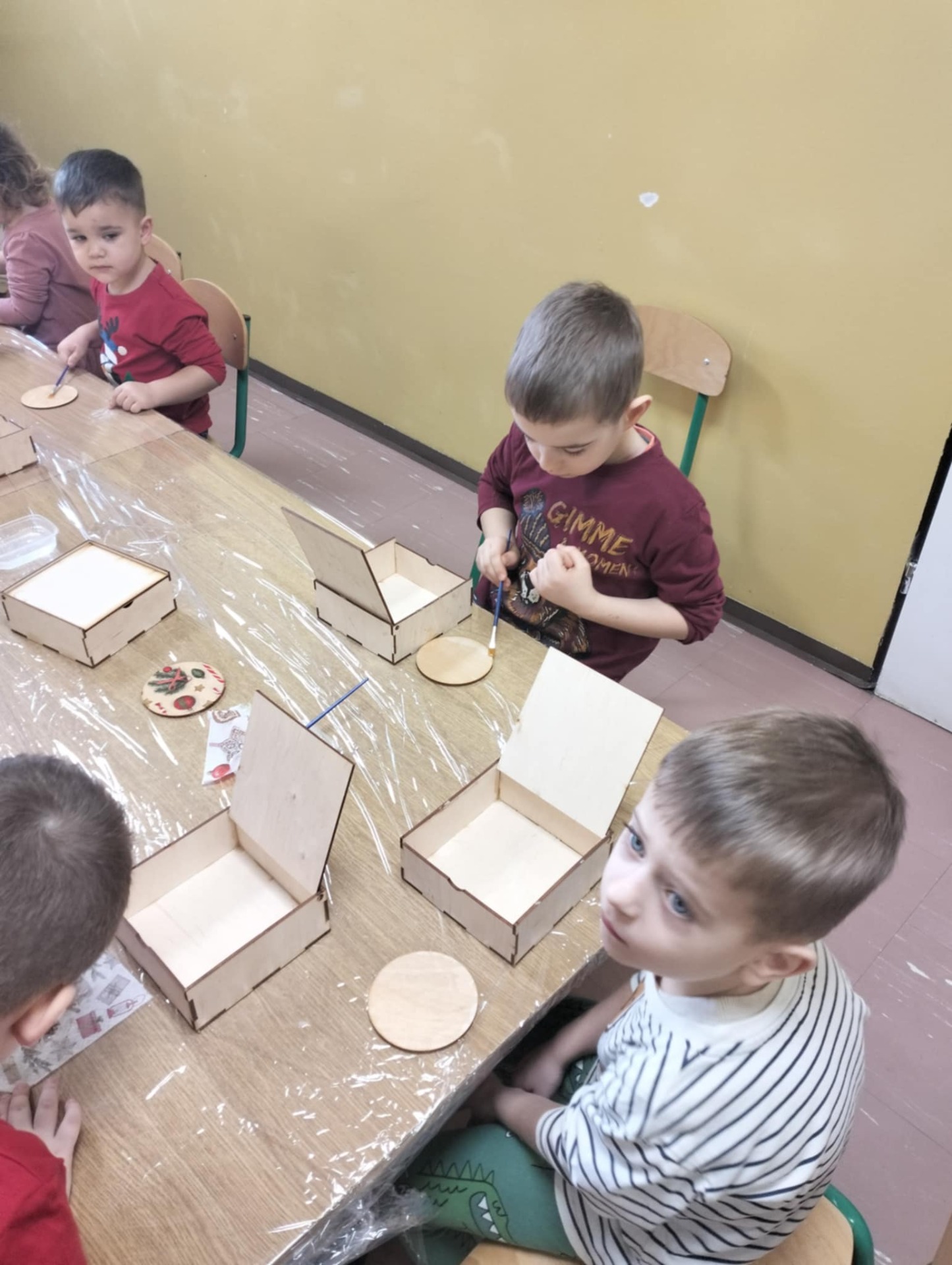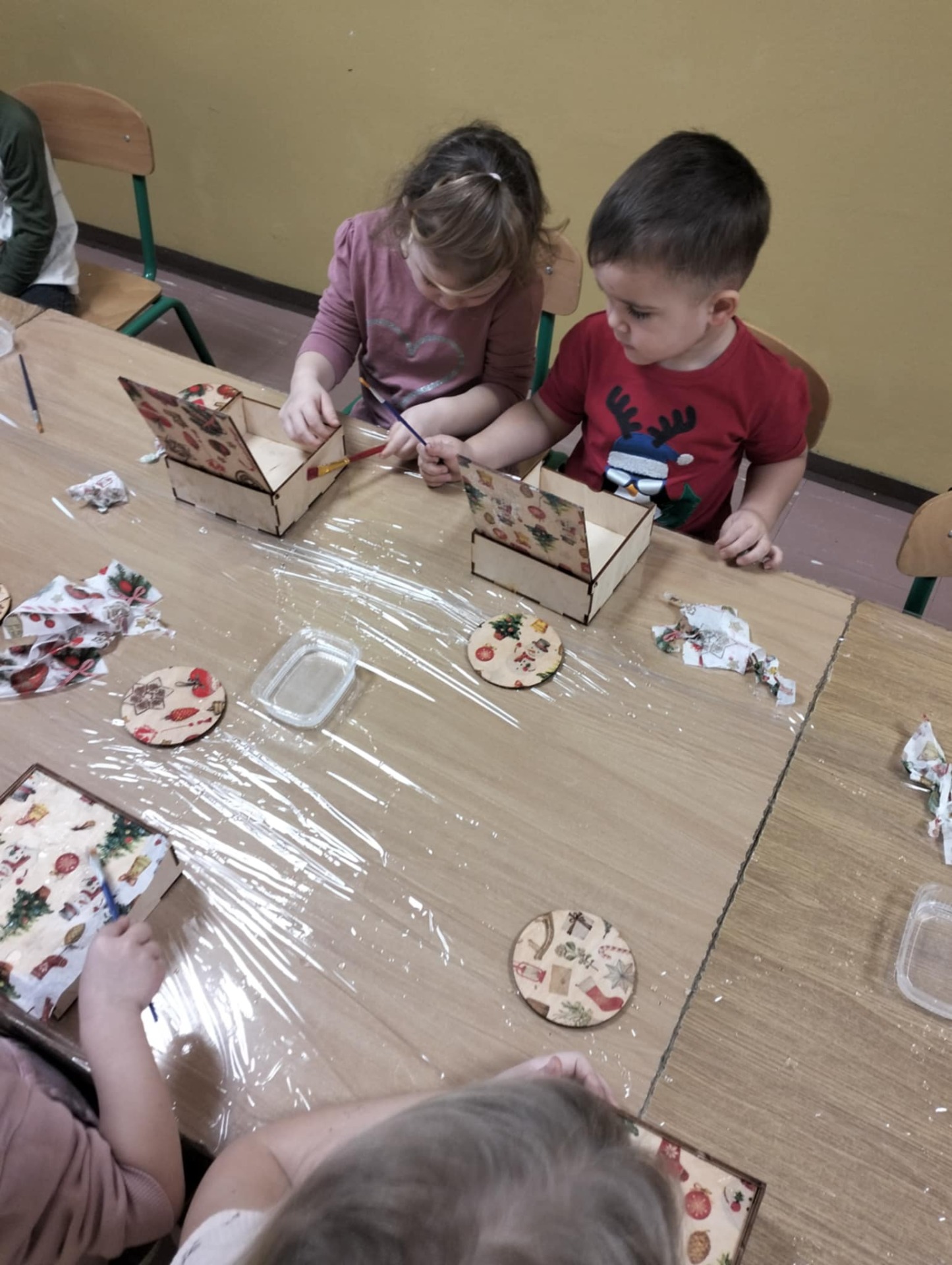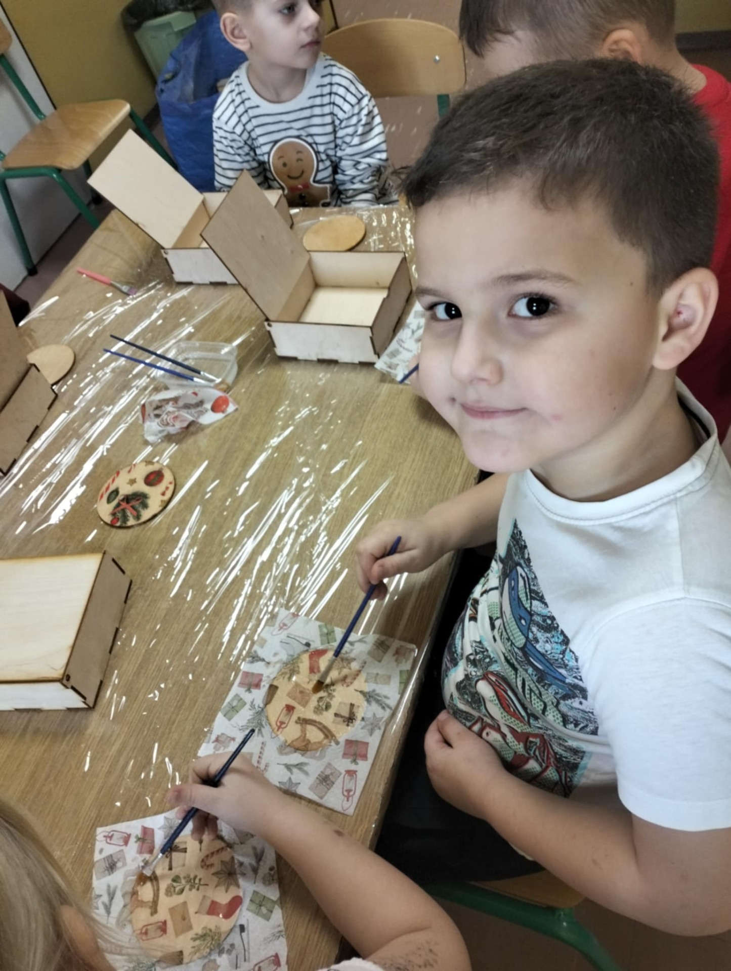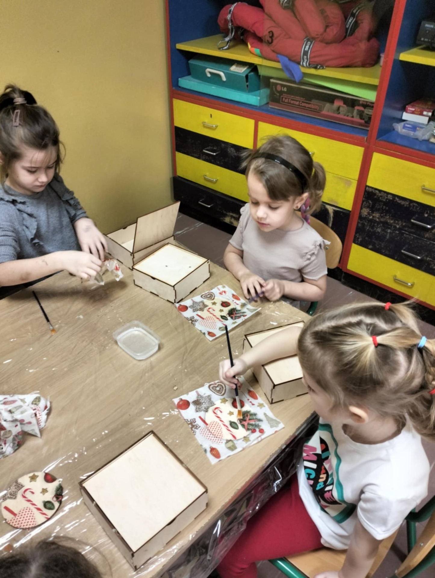 11 grudnia dzieci z oddziałów 0a i 0b uczestniczyły w warsztatach świątecznych z wielkim zaangażowaniem wykonały skrzyneczki na świąteczne skarby np.slodkie pierniczki.