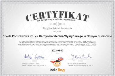 CERTYFIKAT JAKOŚCI DLA SZKOŁY ZA UDZIAŁ W...